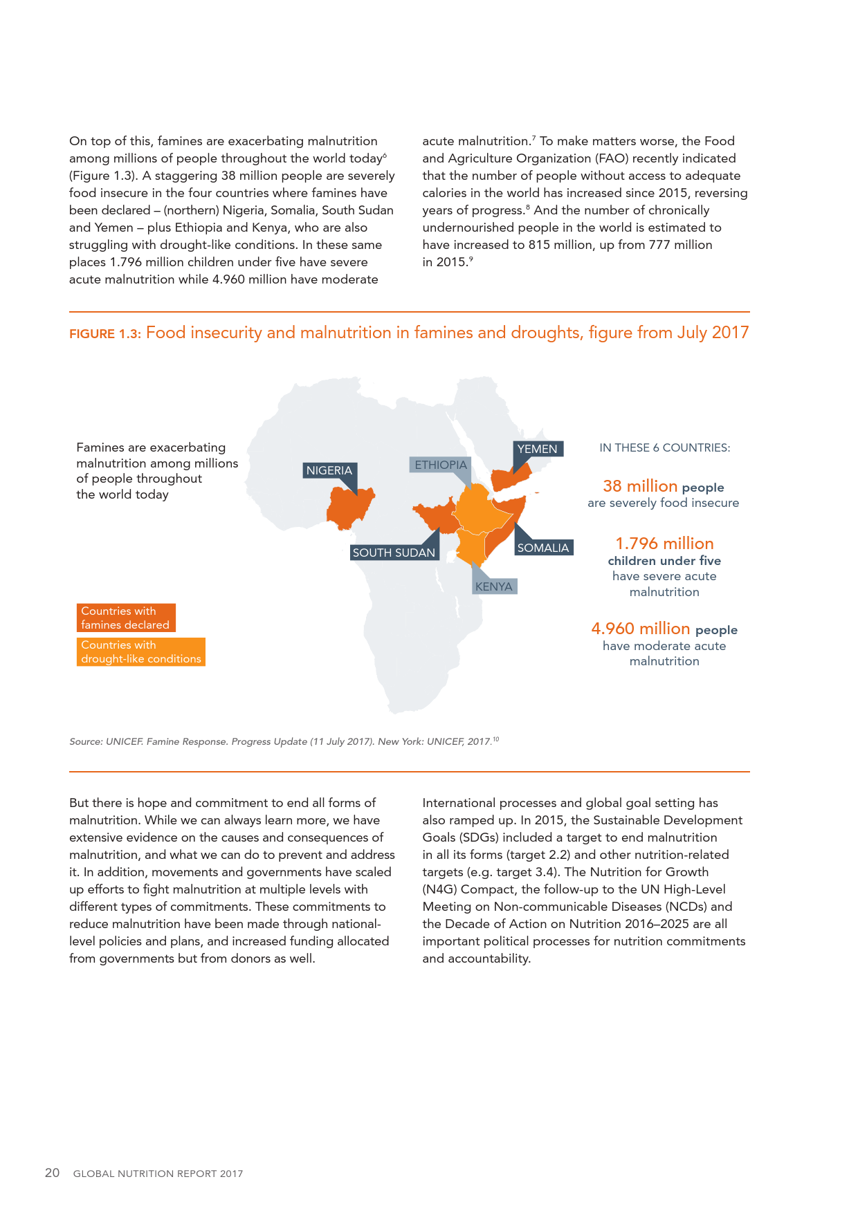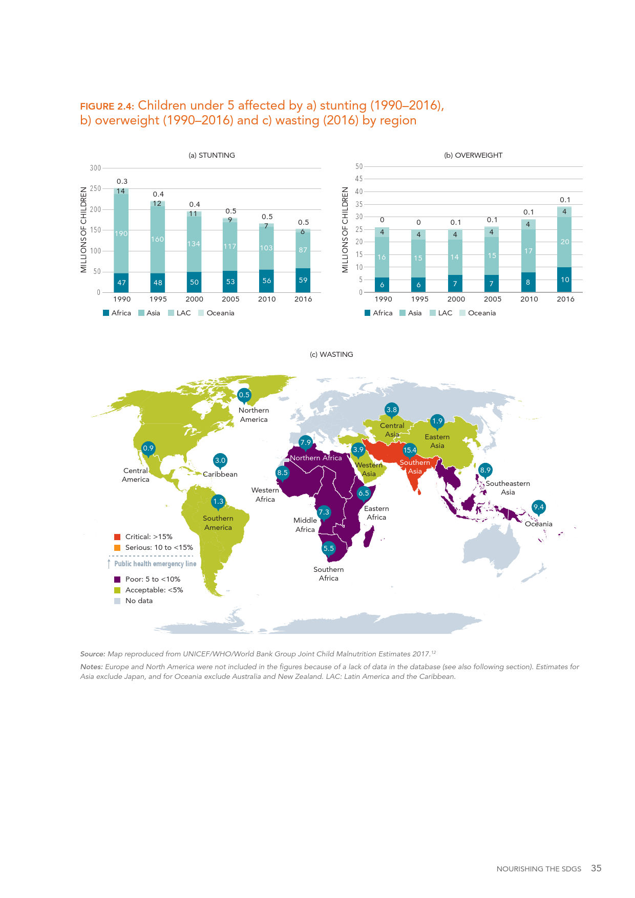 根据报告,由于缺少食物,年龄小于五岁,至少一亿五千万儿童身体生长迟缓,与身高相比,远远没有达到应有的体重。相反,食物过量却在世界各地呈现,在全球70亿人口中,大约二十亿人或者体重过重或者属于肥胖症,在北美,三分之一的男人和女人属于肥胖症。