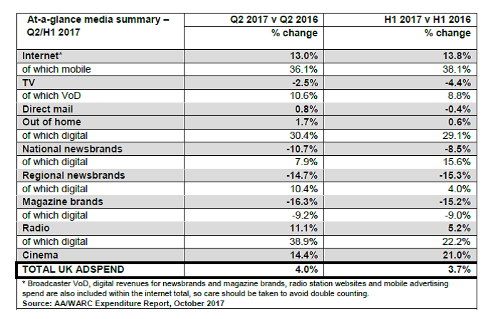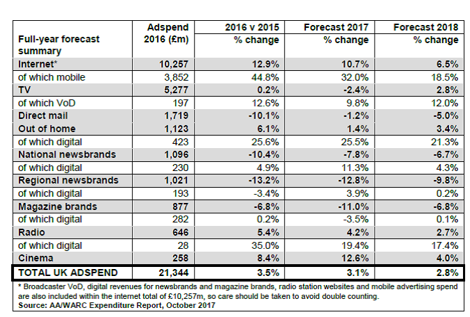 WARC发布了2017年上半年英国广告支出情况。2017年前六个月,英国广告支出增长3.7%,达到108亿英镑,这是自1982年开始监测以来,涨幅最高的一次。WARC预计,2017年,英国广告支出将增长3.1%,这意味广告支出将超过220亿英镑。