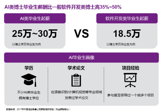 《2018年韦莱韬悦毕业生起薪及政策调研报告》数据显示,人工智能专业方向的毕业生大部分是博士学历,起薪水平约为 25万-30万,比一般软件开发类博士毕业生的平均起薪(18.5万)高 35%-50%。