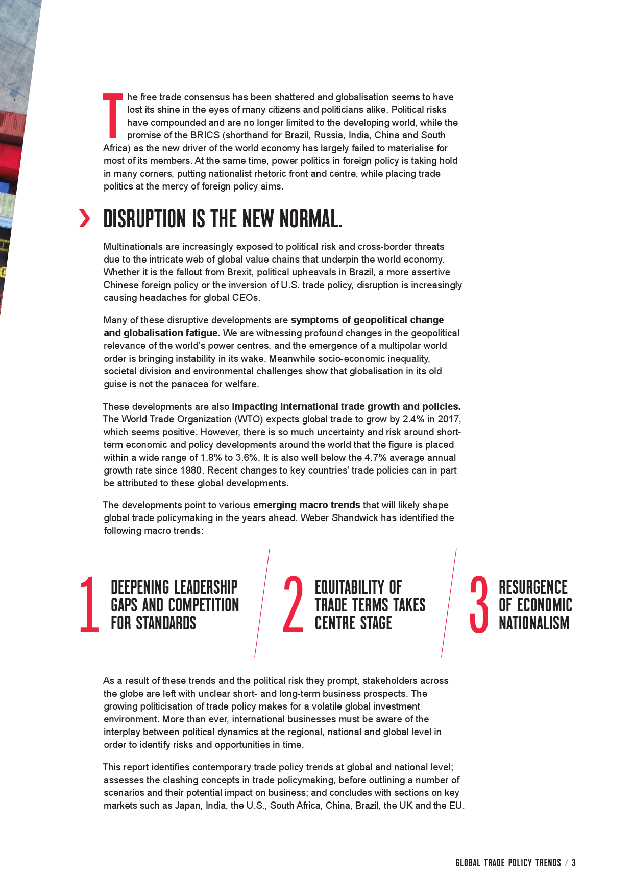 颠覆将成为常态。跨国公司依赖于错综复杂的全球价值链,往往受制于突发的国际政治事件,如英国脱欧和主要贸易体国内政策的变化,如美国贸易政策的逆转。这些颠覆事件是全球化颓势的体现,反映了更深层的地缘政治趋势变化。