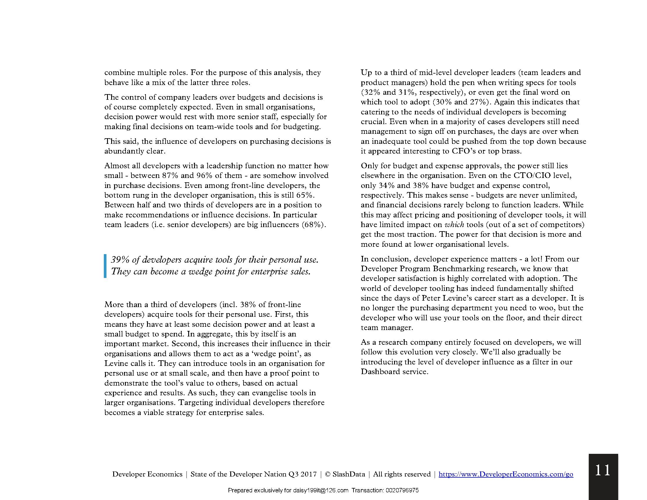 超过1/3的开发人员(包括38%的一线程序员)获得个人使用的工具。这本身就是一个重要的市场,更重要的是,这可以成为将工具引入企业并广泛传播的契机。