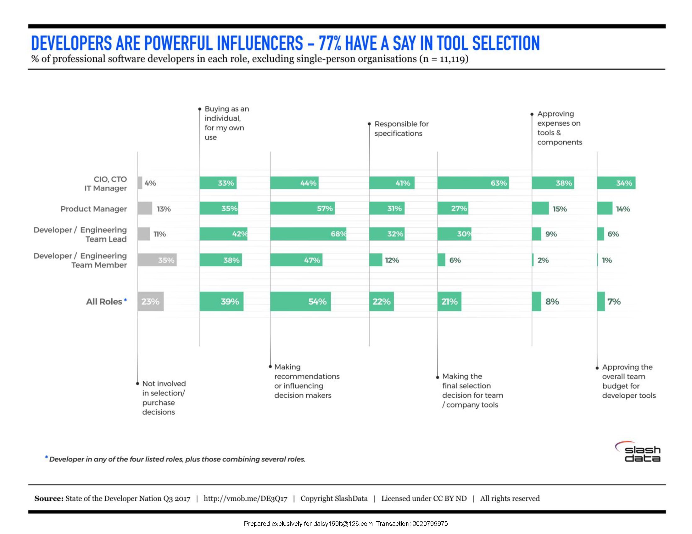 开发人员对技术采购决策的影响非常明显。超过87%的具有领导职能的开发人员和1/3的一线程序员以某种方式参与购买决策。