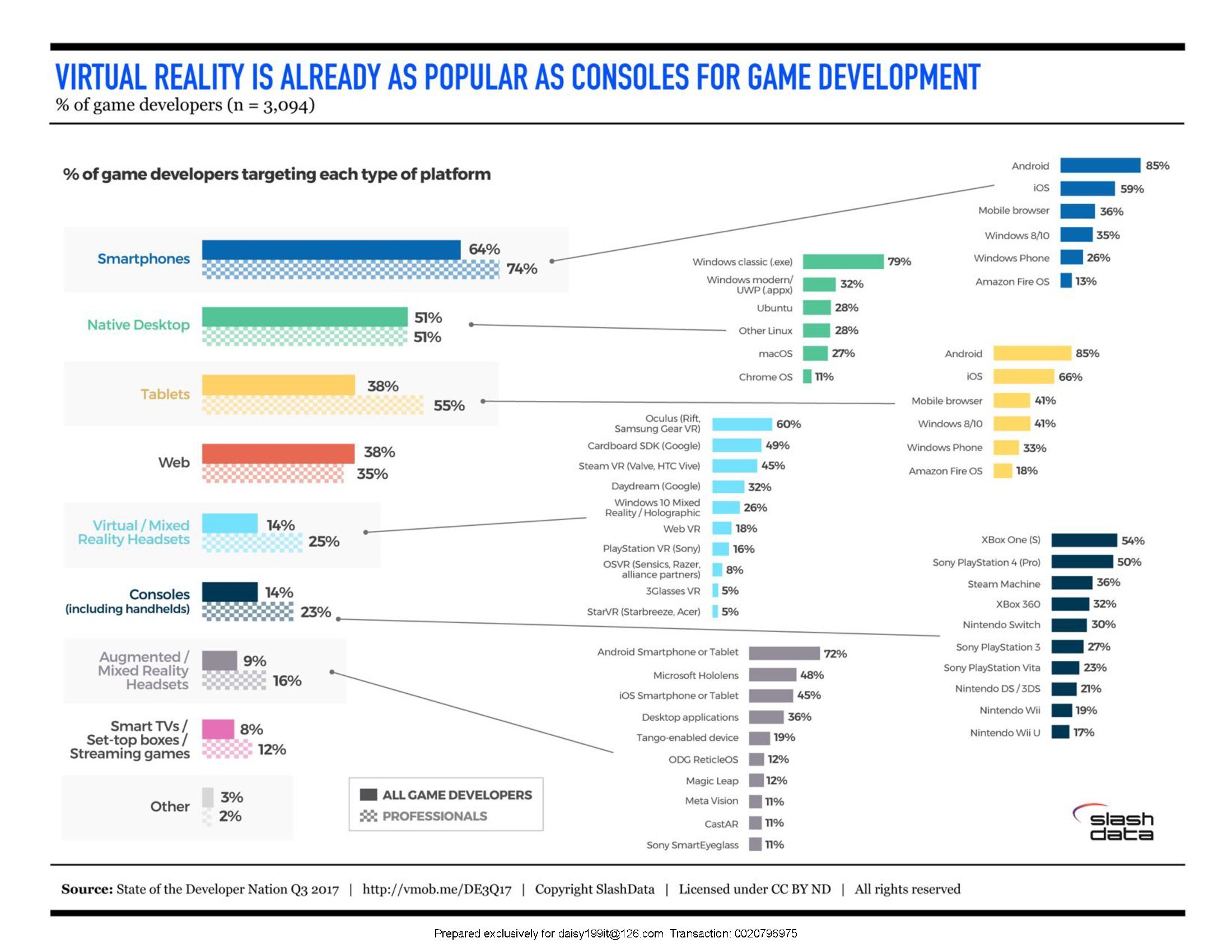 目前,分别有14%的游戏开发人员针对VR头显和游戏主机。在专业开发人员中,这个数字分别上升为25%和23%。