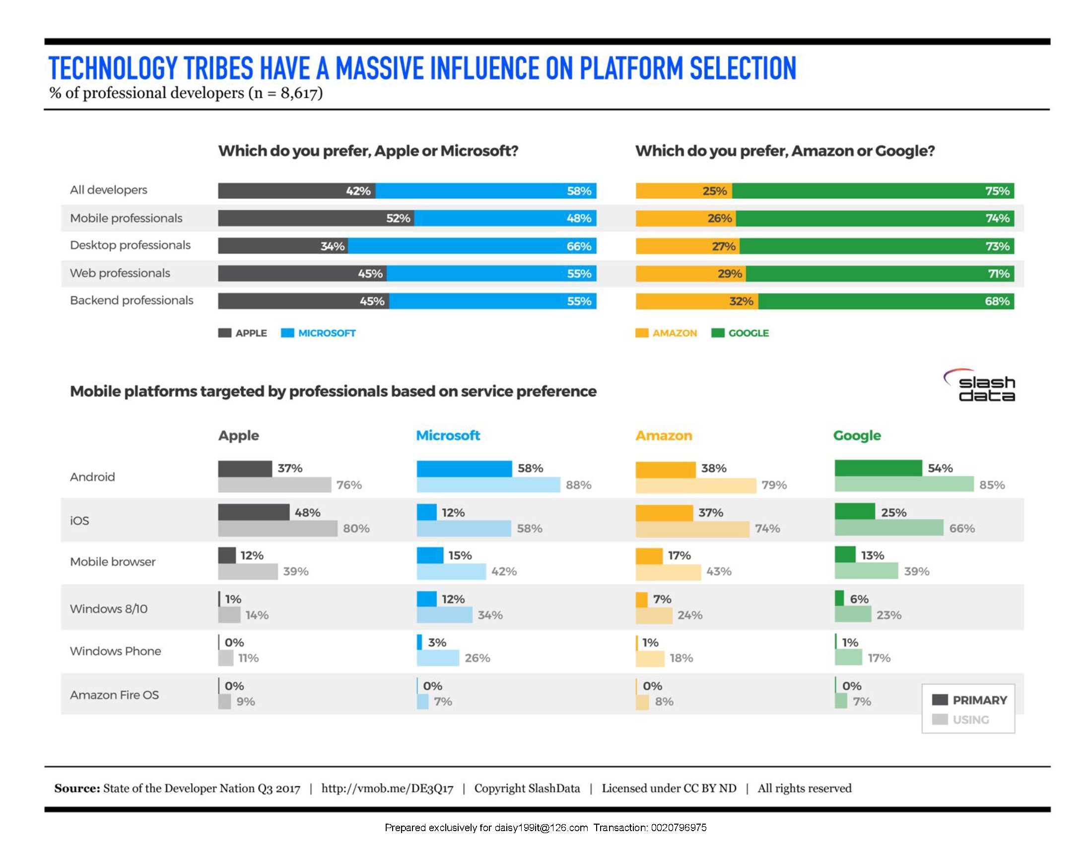 偏好方面,微软比苹果更受欢迎(58% vs. 42%)。但是,按平台划分,52%的专业移动开发人员更喜欢苹果,66%的PC端专业开发人员更喜欢微软。