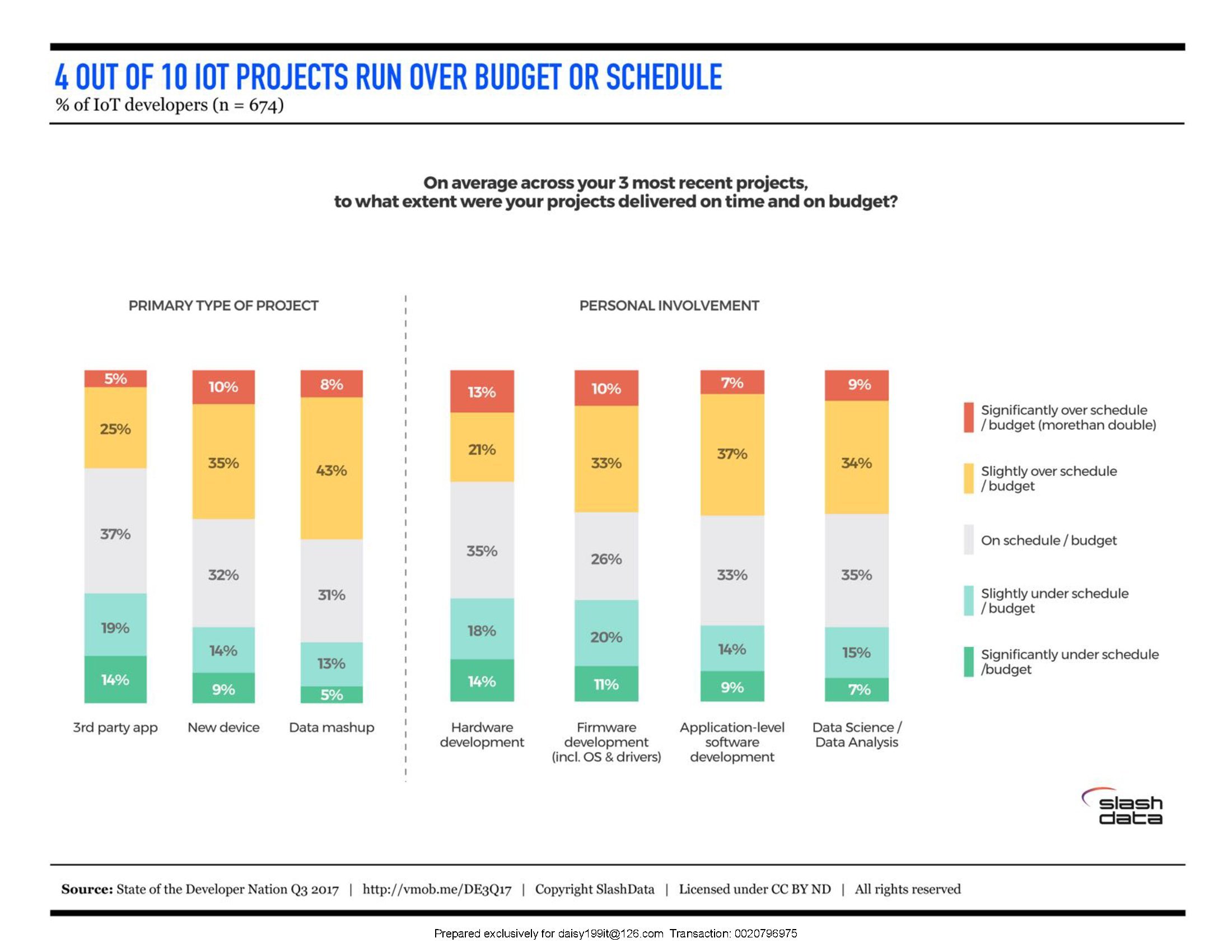 在调查的近期物联网项目中,42%延期或超过预算,只有24%提前交付。8%的项目甚至超过计划时间或预算的一倍以上。硬件和软件等诸多因素结合在一起,导致物联网项目更容易陷入困境。