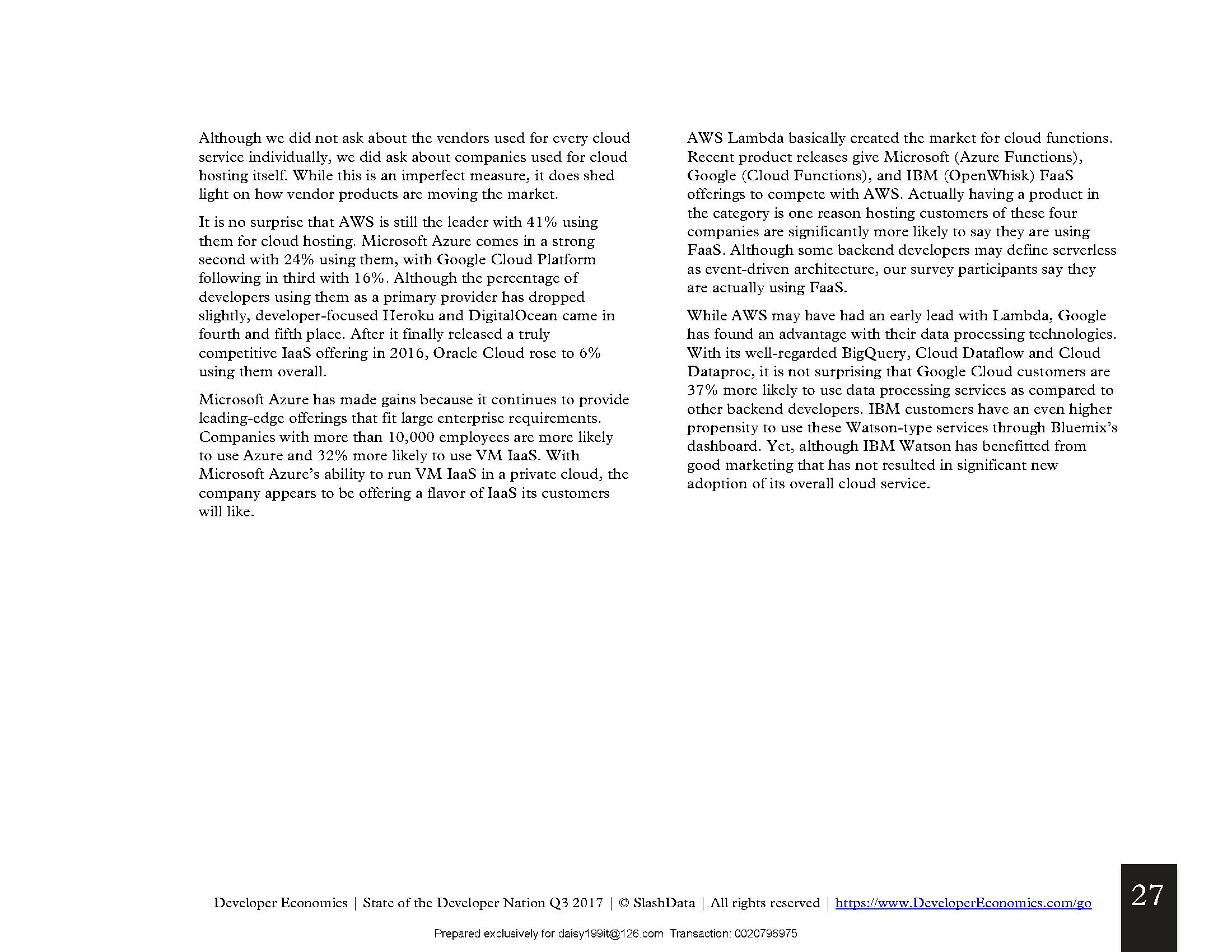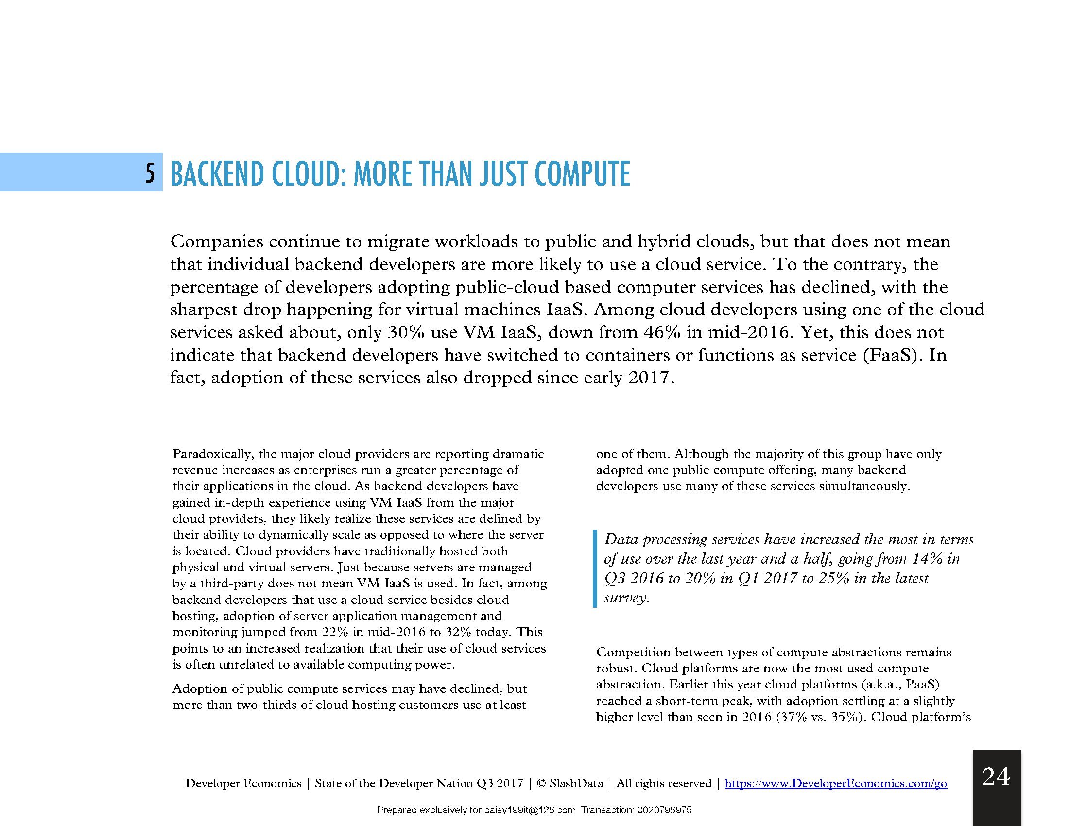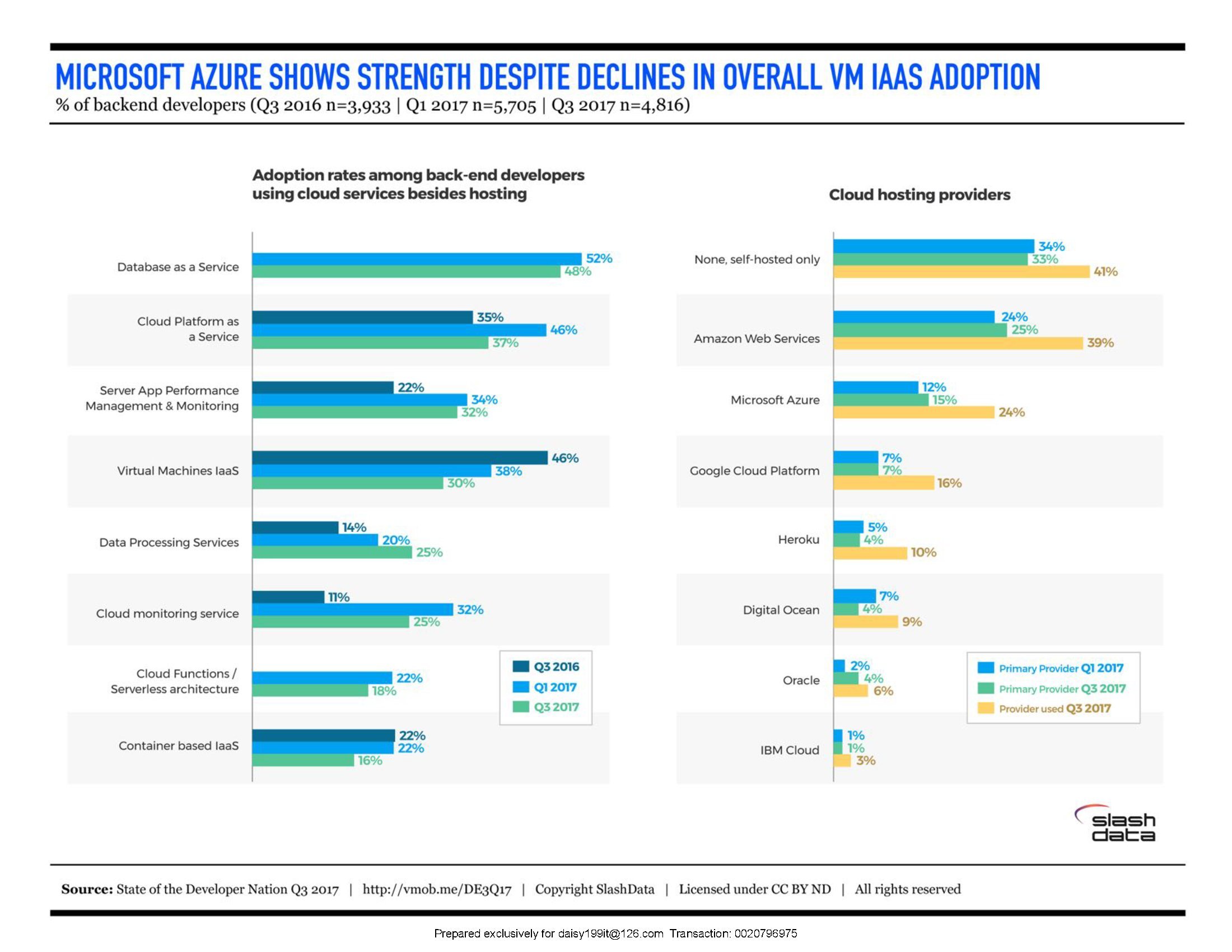 使用公共云计算服务的开发者比例有所下降,主要是由于虚拟机laaS的快速下滑。在使用云计算的开发者中(包括任何云服务),只有30%使用虚拟机laaS。和2016年中期的46%比下降明显。