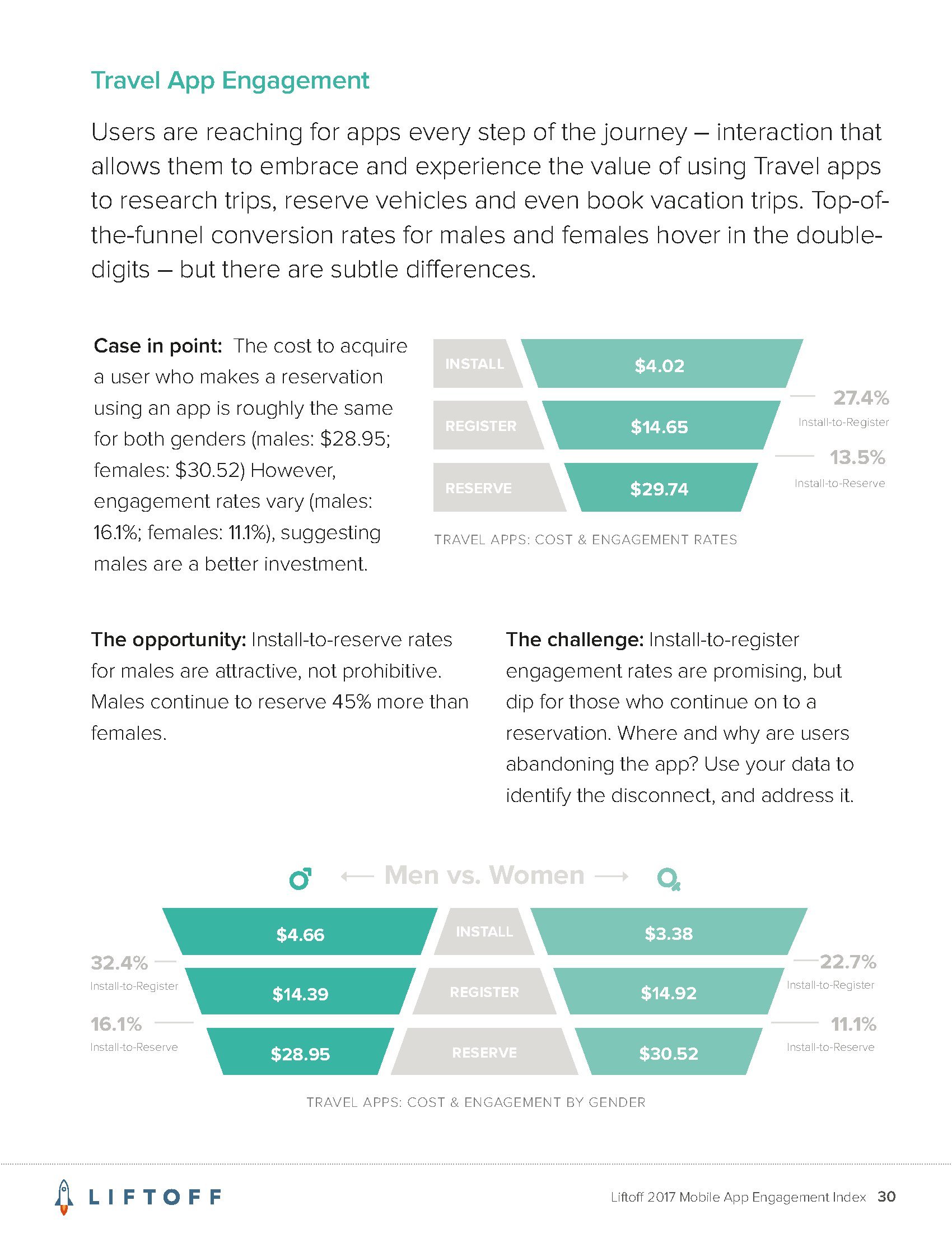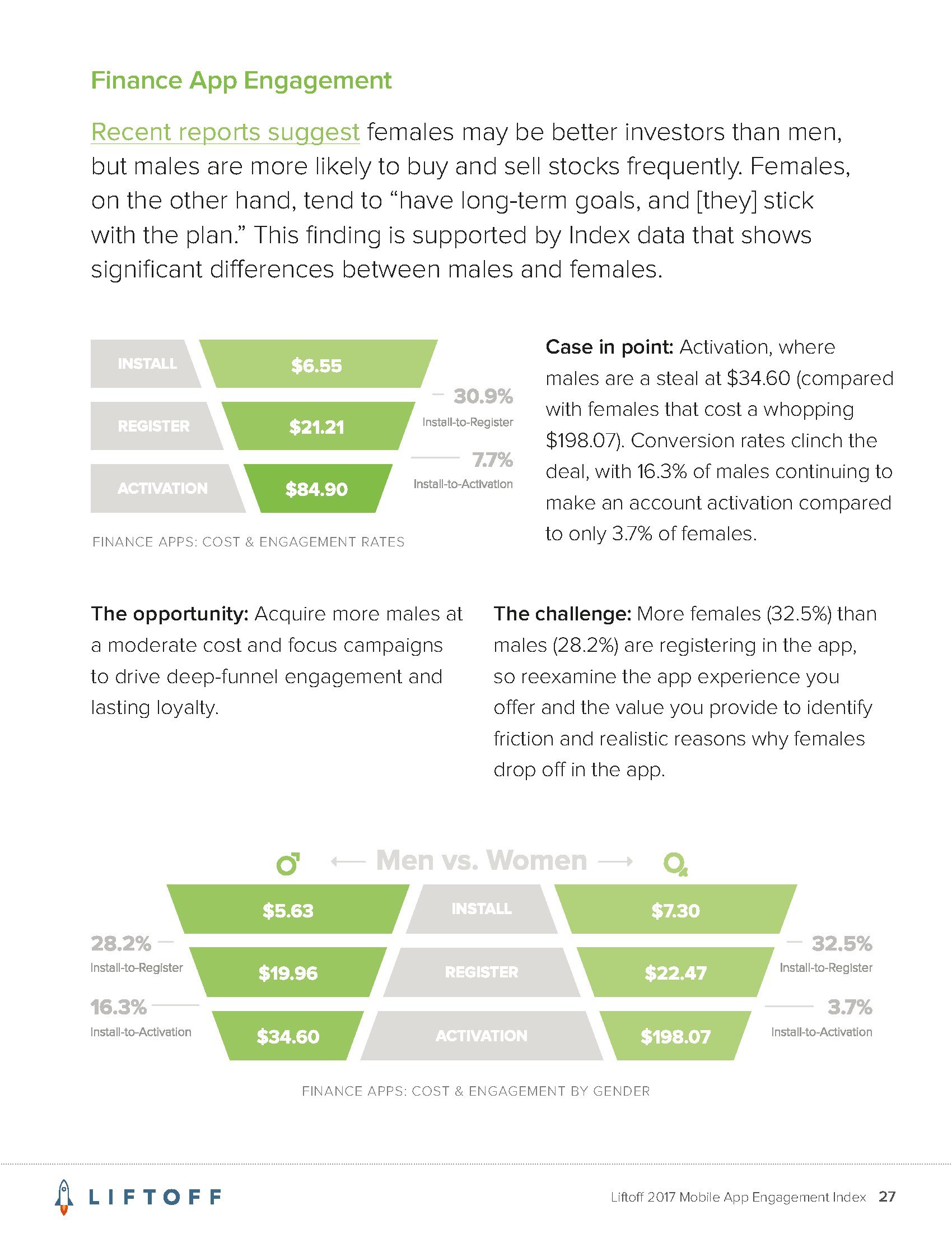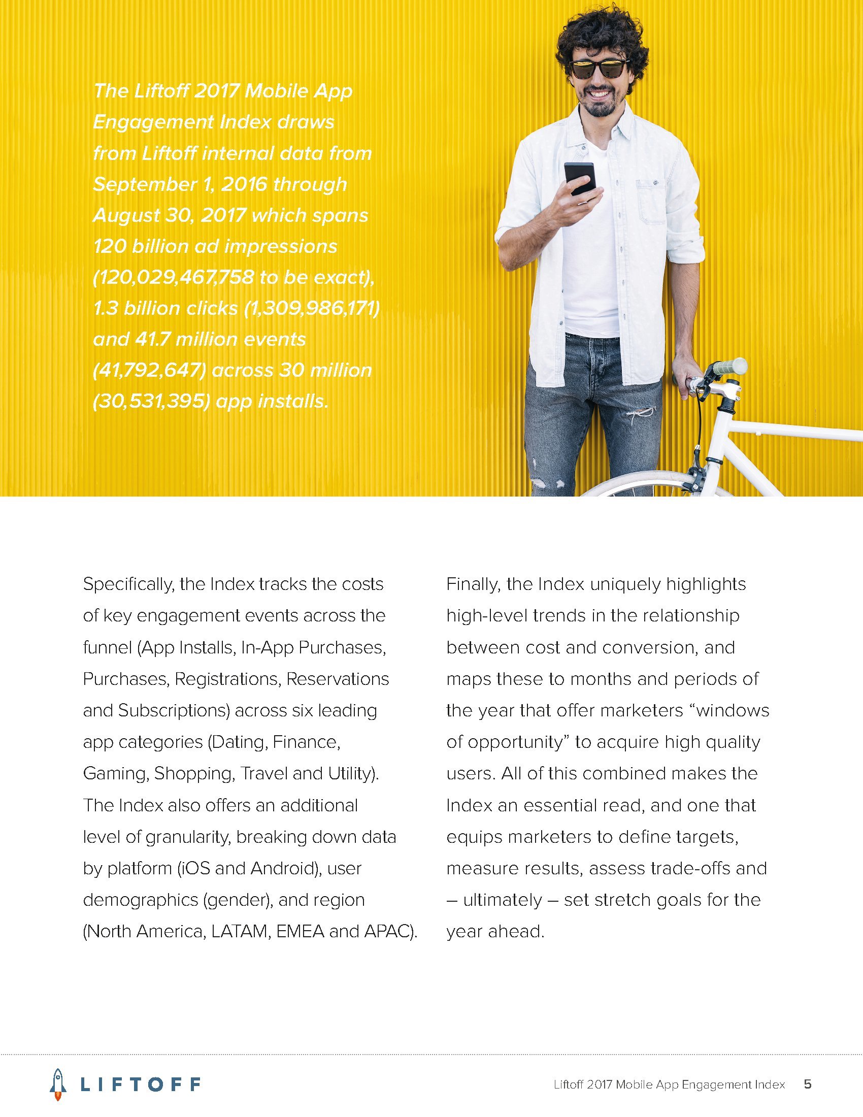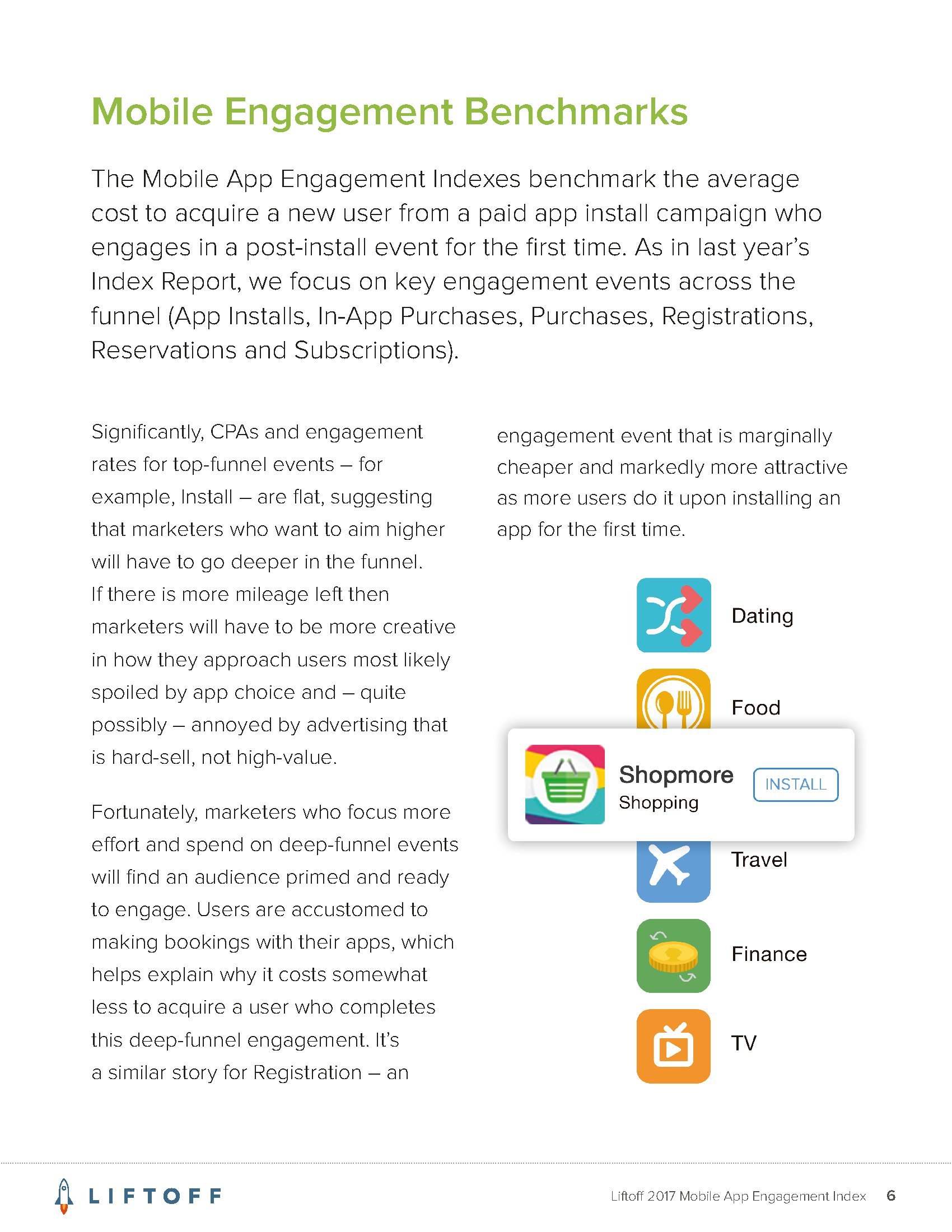 Liftoff分析了2016年9月1日至2017年8月30日3000万个应用安装量的1200亿广告展现量,13亿广告点击量和4170万个事件。这些应用包括约会、金融、游戏、购物、旅行和实用工具六大类。