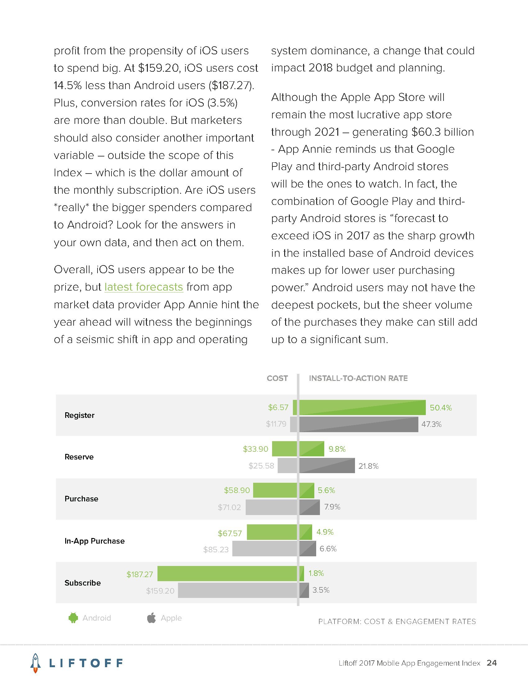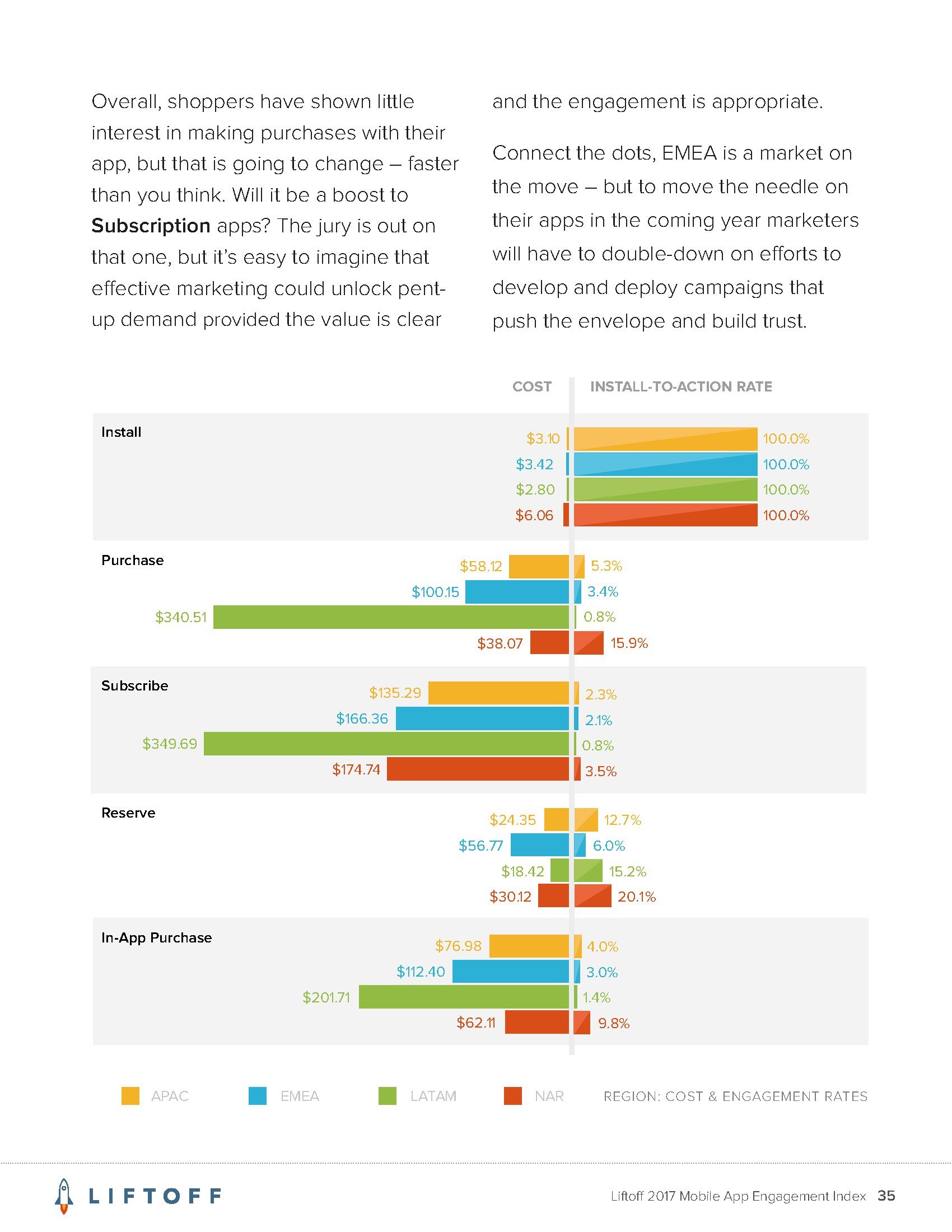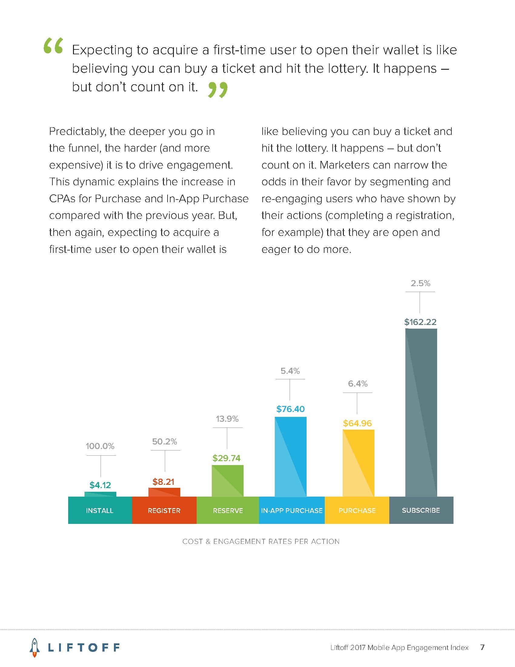Liftoff的调查发现,让用户在应用内购买的平均成本是64.96美元。这远高于用户安装应用的成本,后者平均为4.12美元。而且,应用内购买的成本也远高于让首次使用应用的用户创建帐户的成本(平均为8.12美元)。