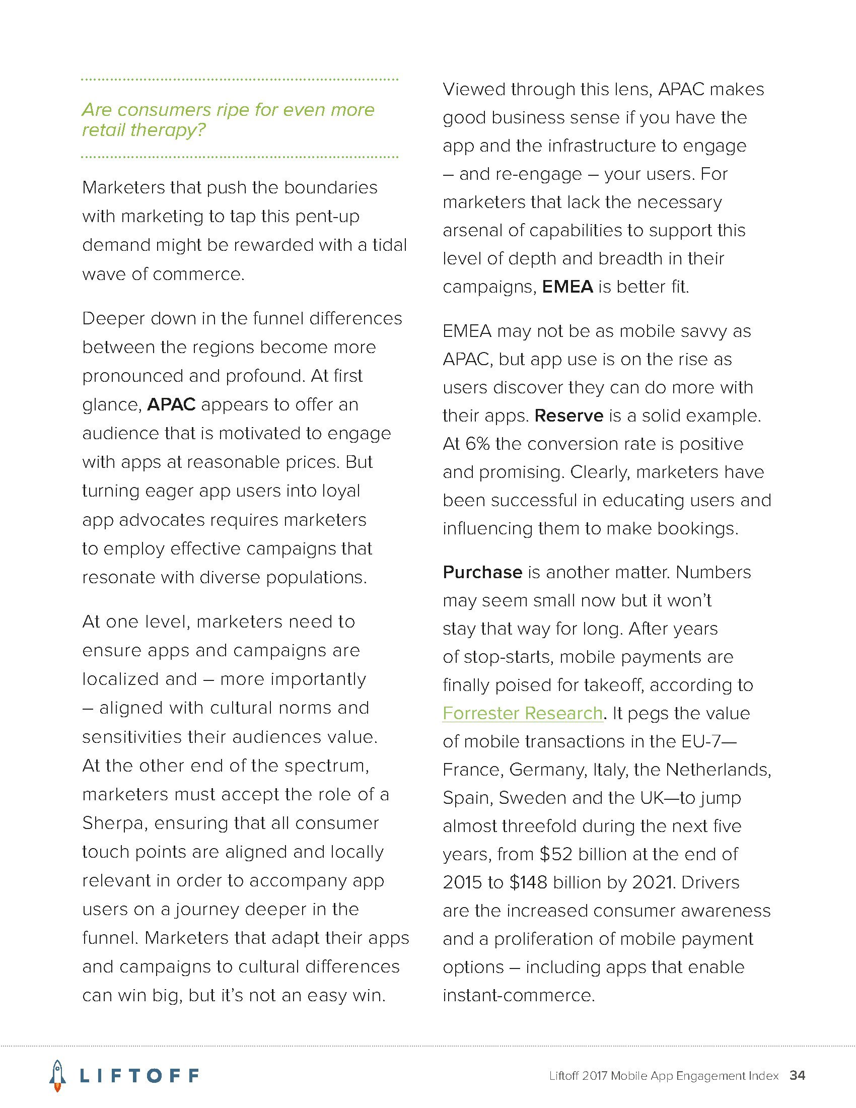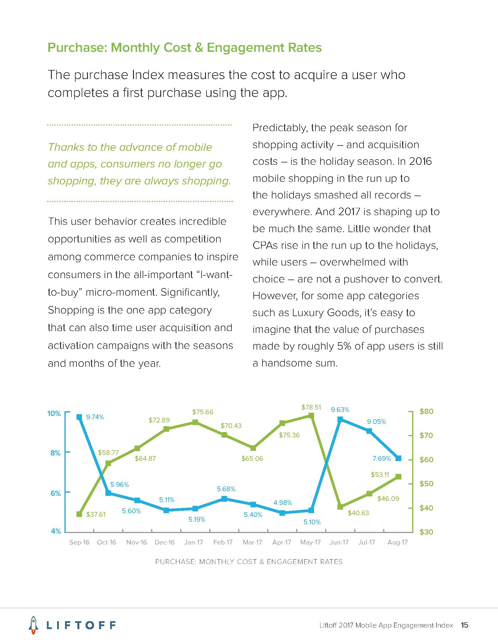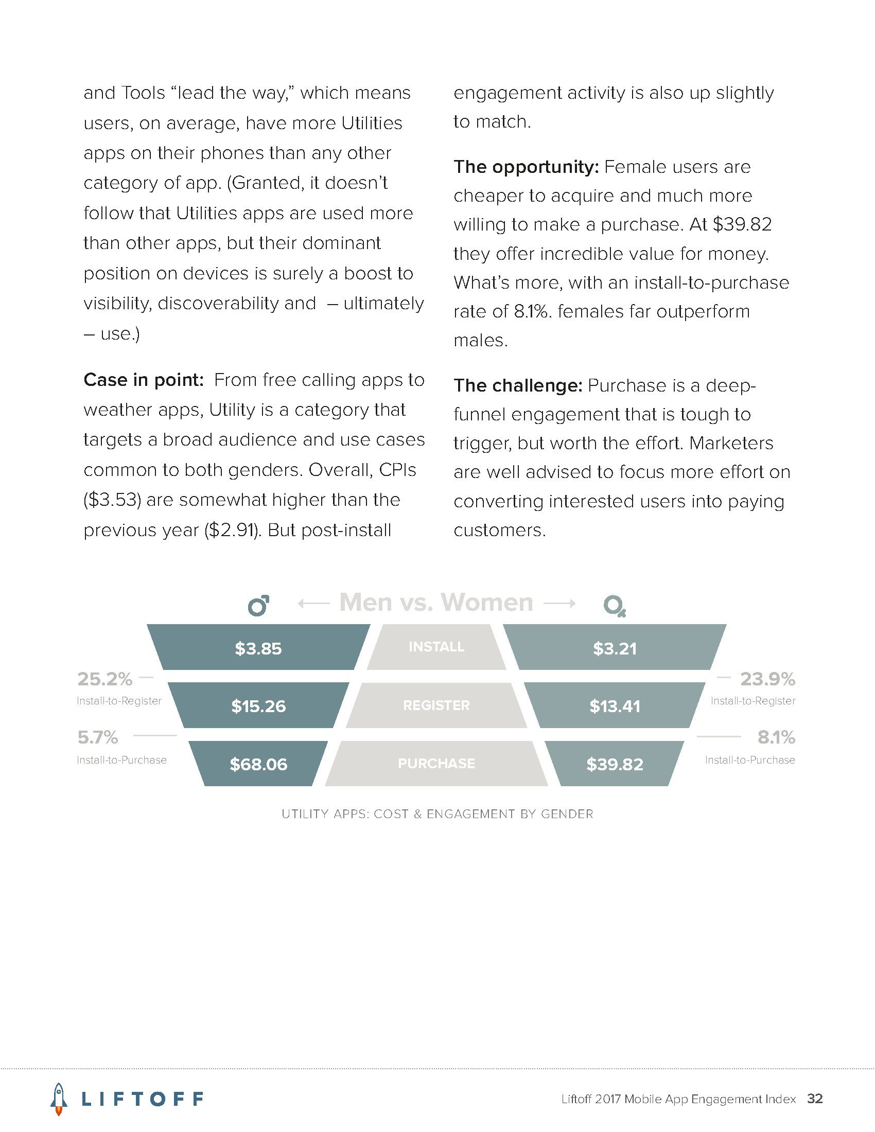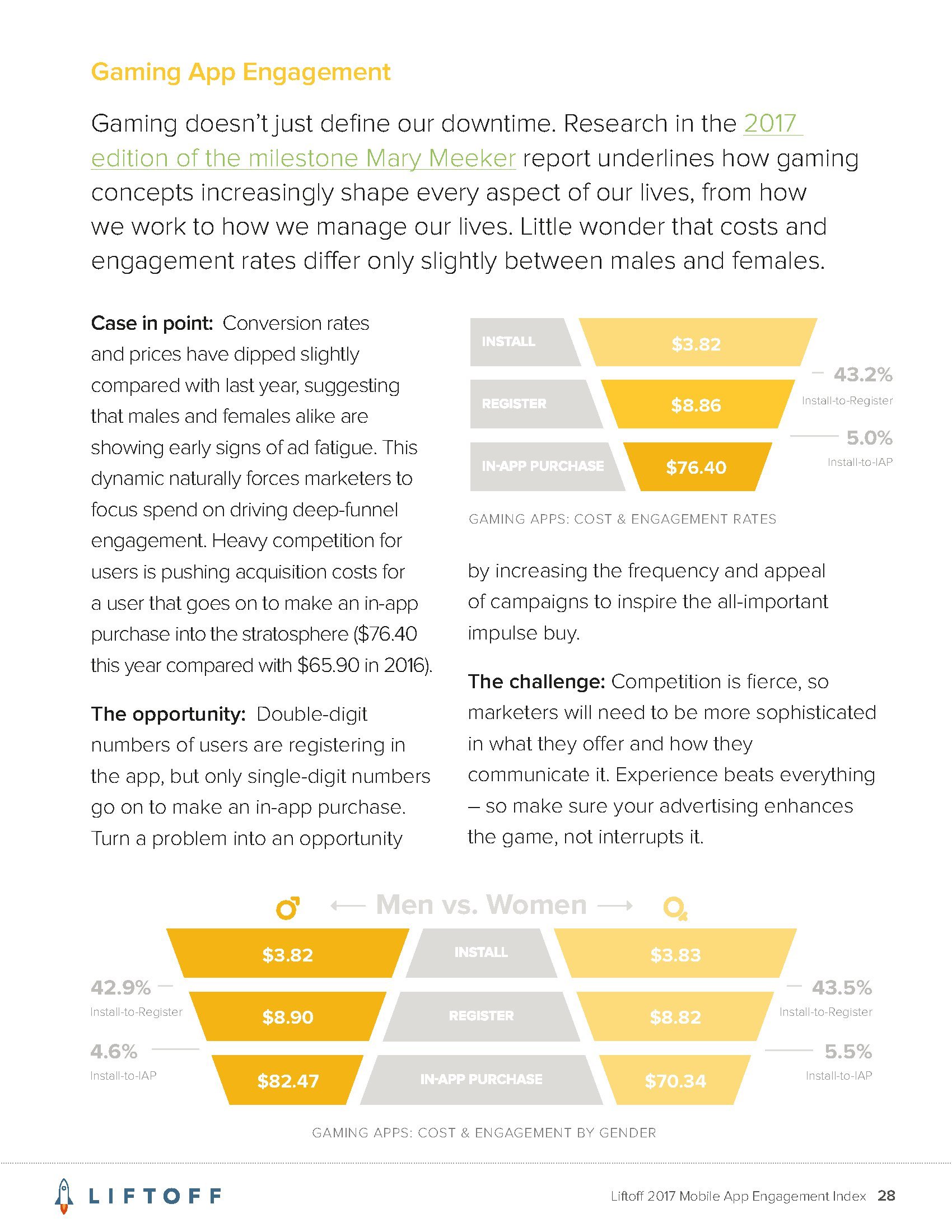Liftoff的调查发现,让用户在应用内购买的平均成本是64.96美元。这远高于用户安装应用的成本,后者平均为4.12美元。而且,应用内购买的成本也远高于让首次使用应用的用户创建帐户的成本(平均为8.12美元)。