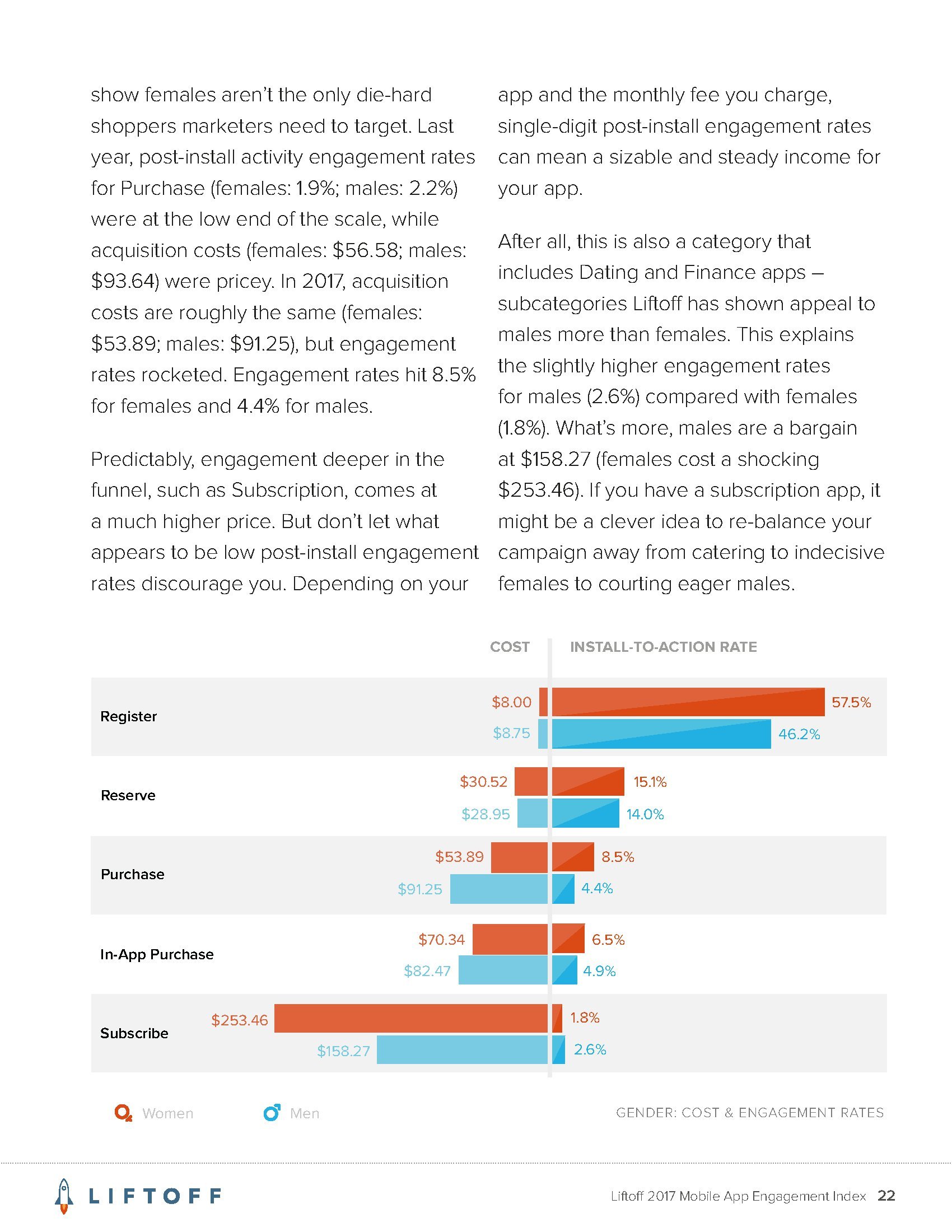 Liftoff还对应用内购买成本进行了细分。从性别来看,吸引男性用户进行应用内购买的成本更高(82.47美元 vs. 70.34美元)。但是,推动女性在应用内订阅付费服务的成本则比男性更高(253.46美元 vs. 158.27美元)。