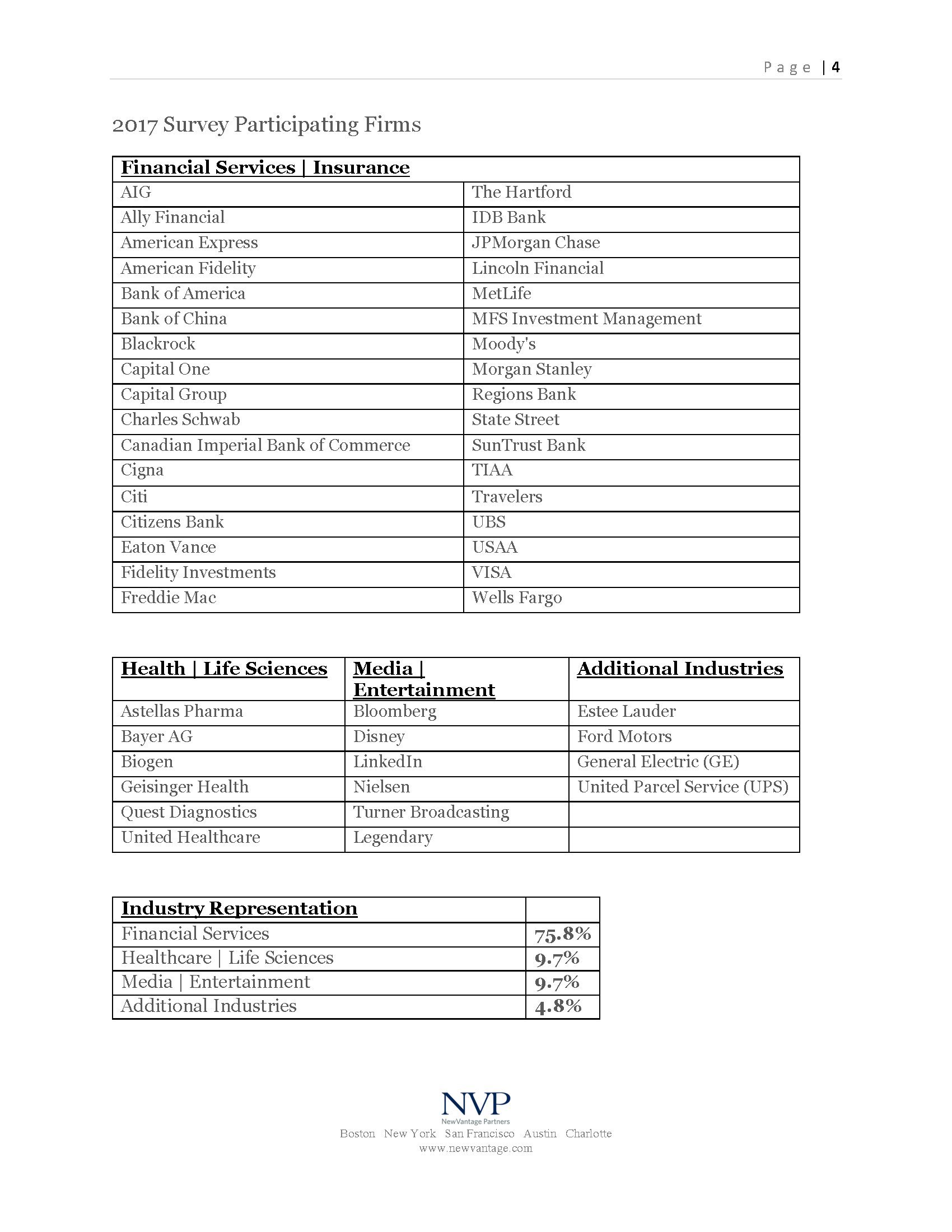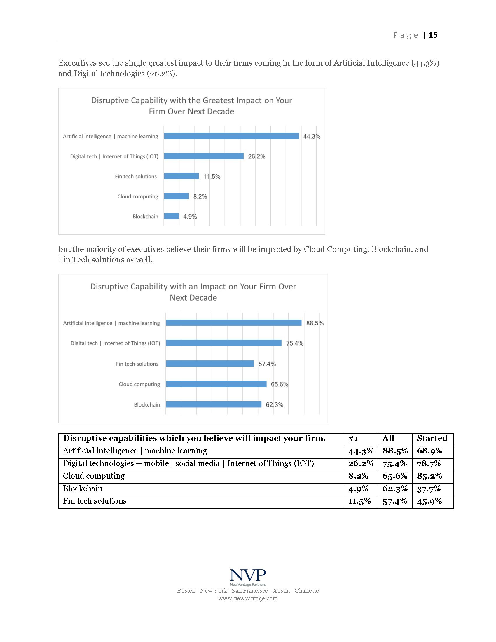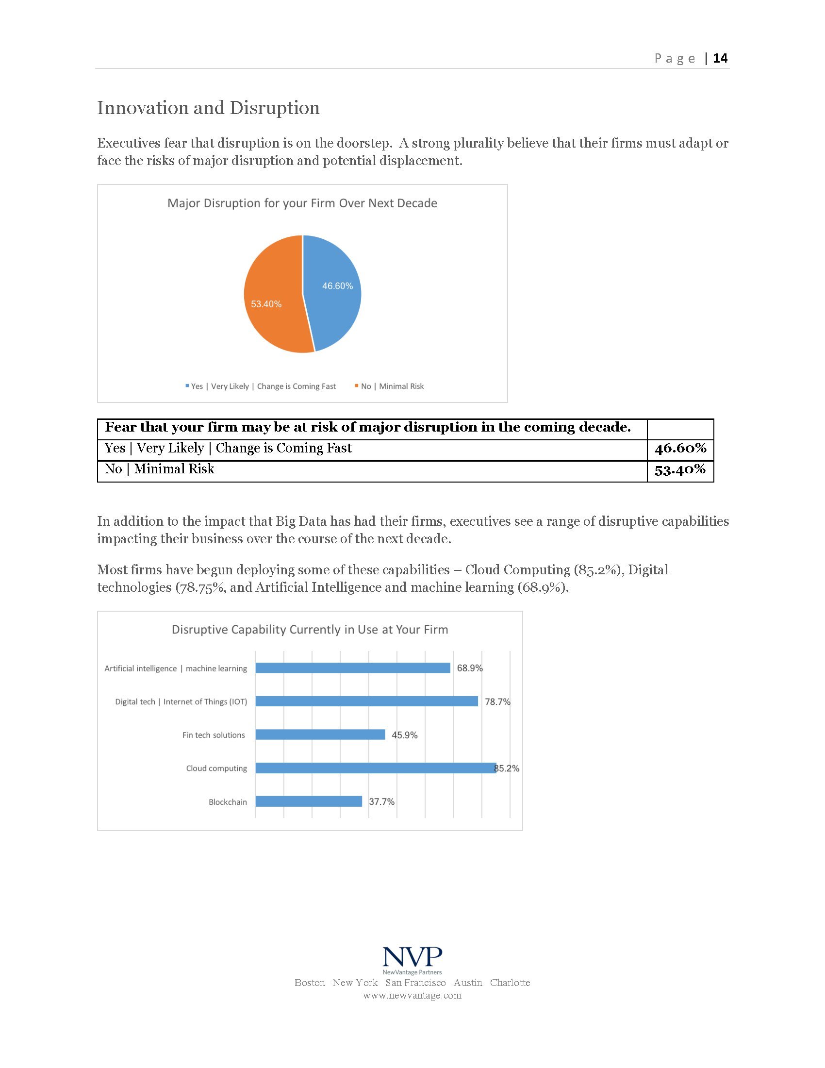 高管们担心即将发生的变革。46.6%的高管认为,他们的公司在未来十年可能面临重大的变革风险。除了大数据,这些公司还看到来自人工智能和机器学习(88.5%)、数字技术(75.4%)、云计算(65.6%)、区块链(62.3%), 和金融科技解决方案(57.4%)的挑战。