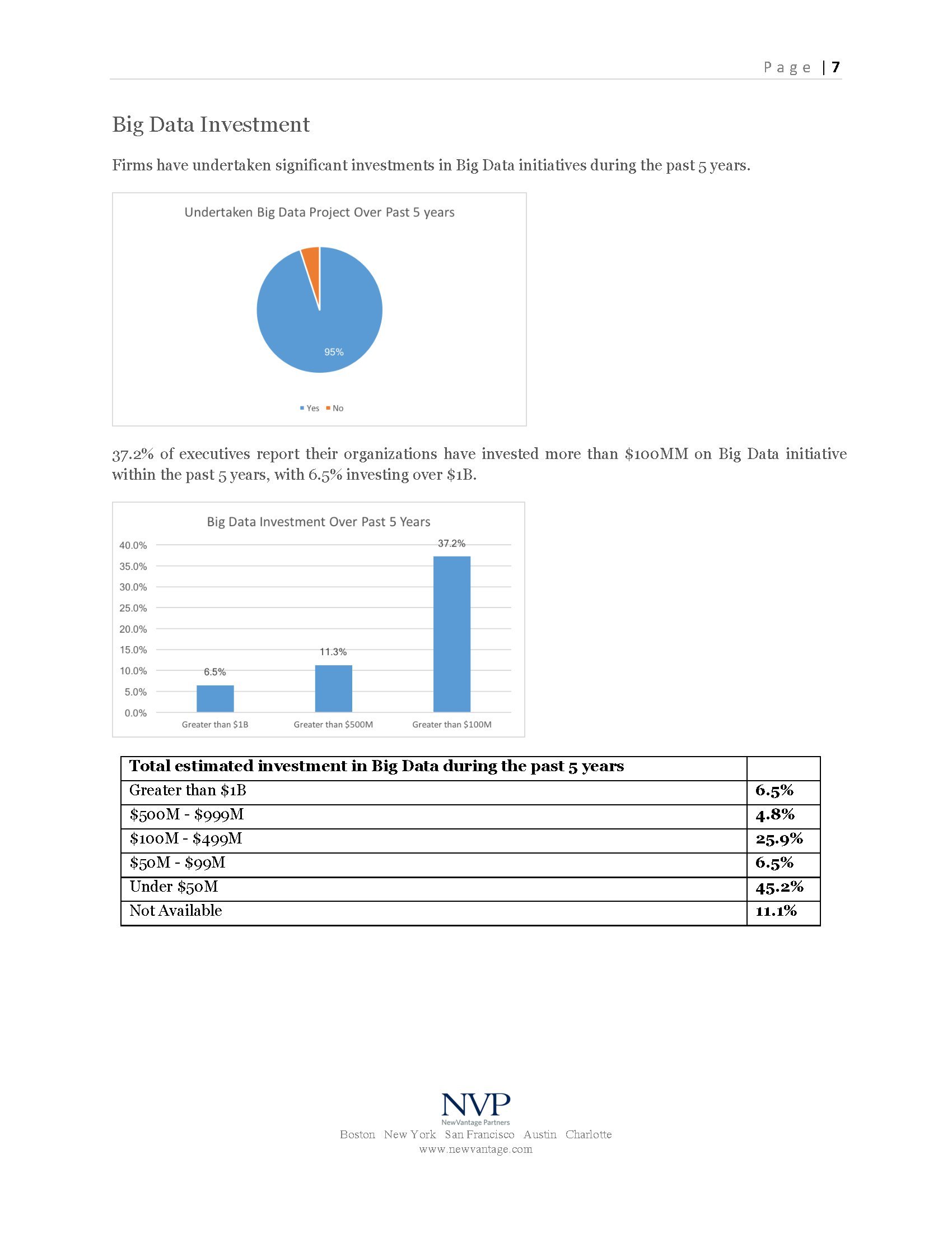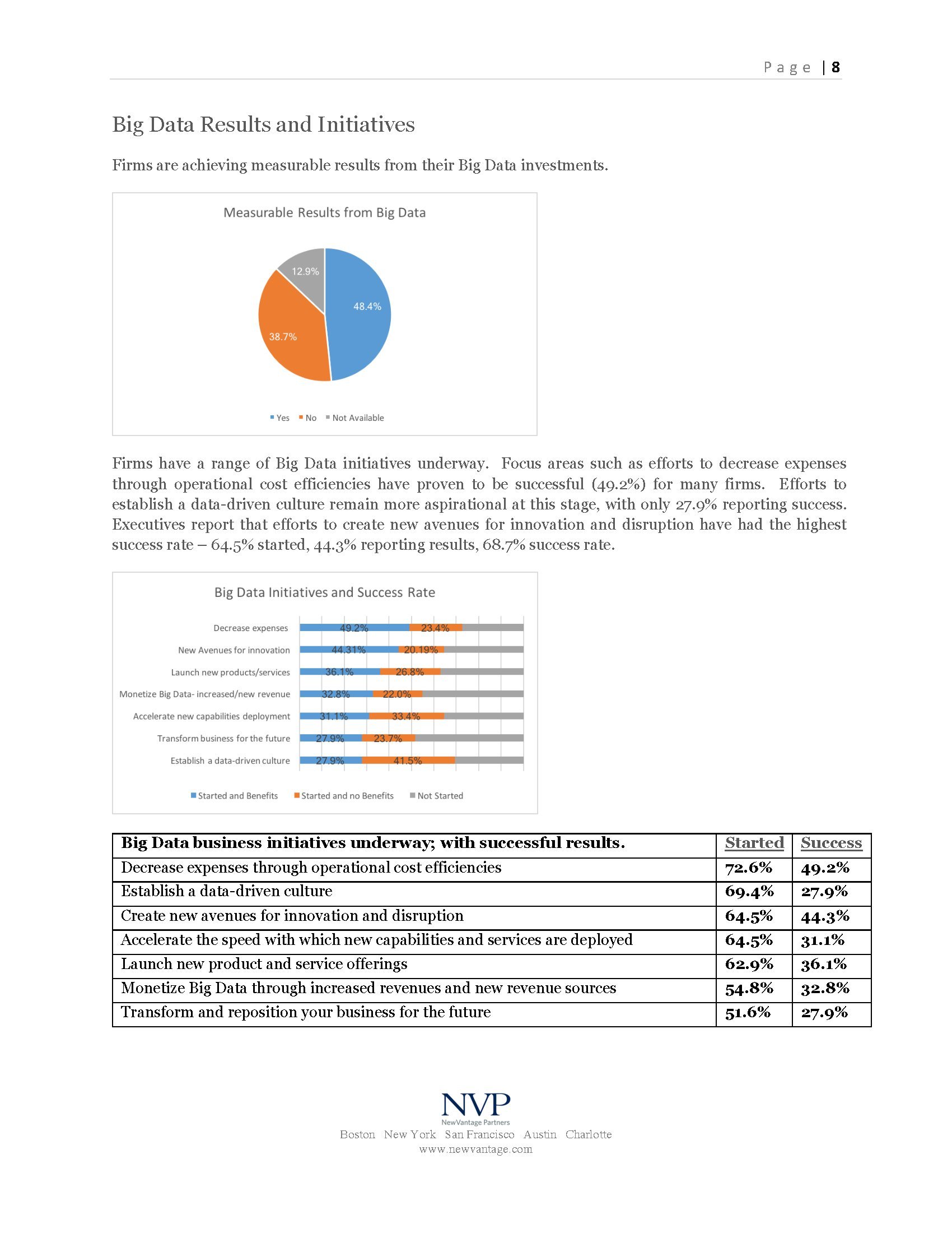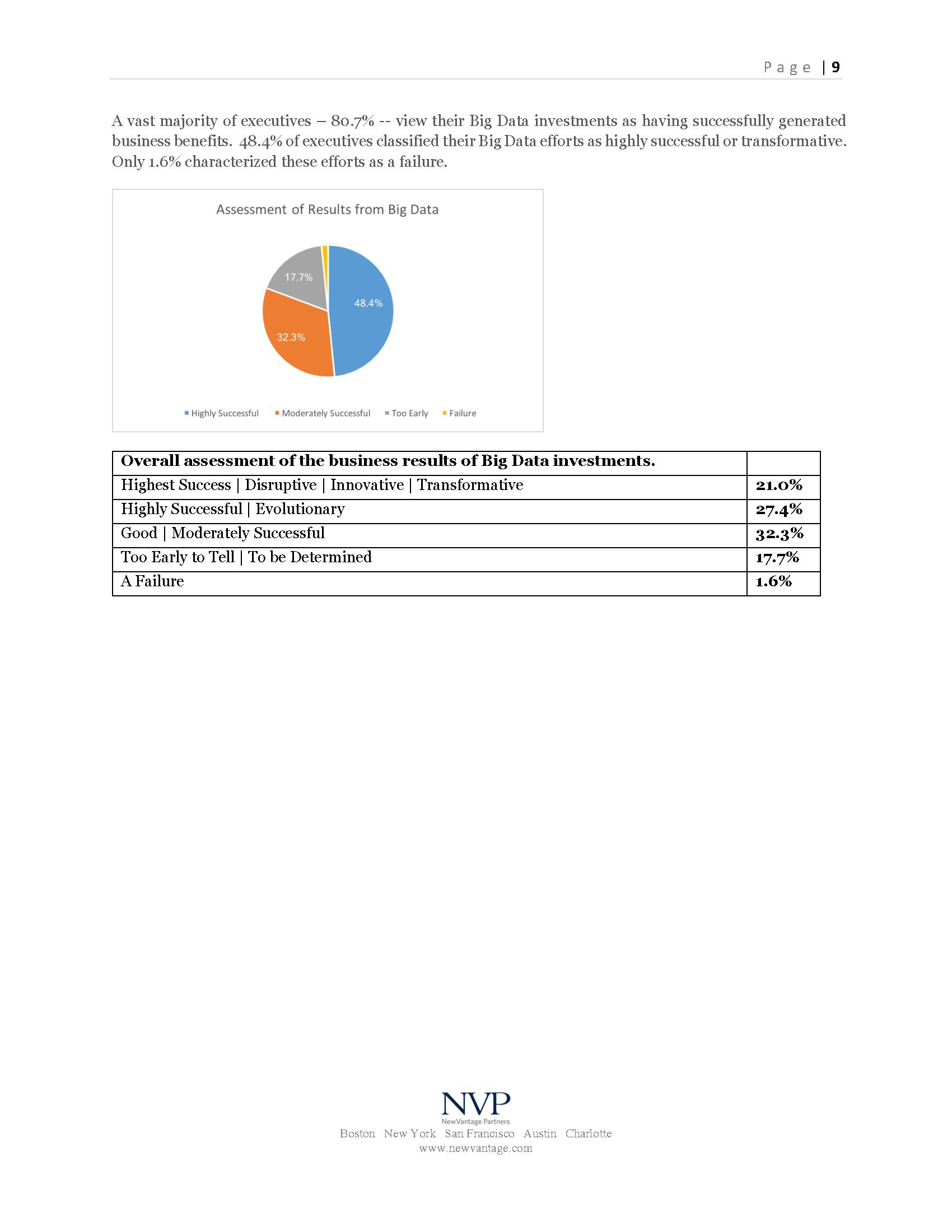 企业正在从大数据投资中获得可测量结果和业务收益。48.4%的高管表示公司已经通过大数据实现了可测量的收益。80.7%的高管认为公司的大数据投资是成功的,21%的高管表示大数据对公司具有颠覆性的意义。
