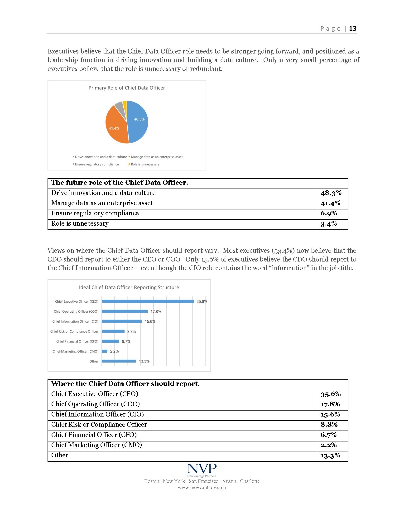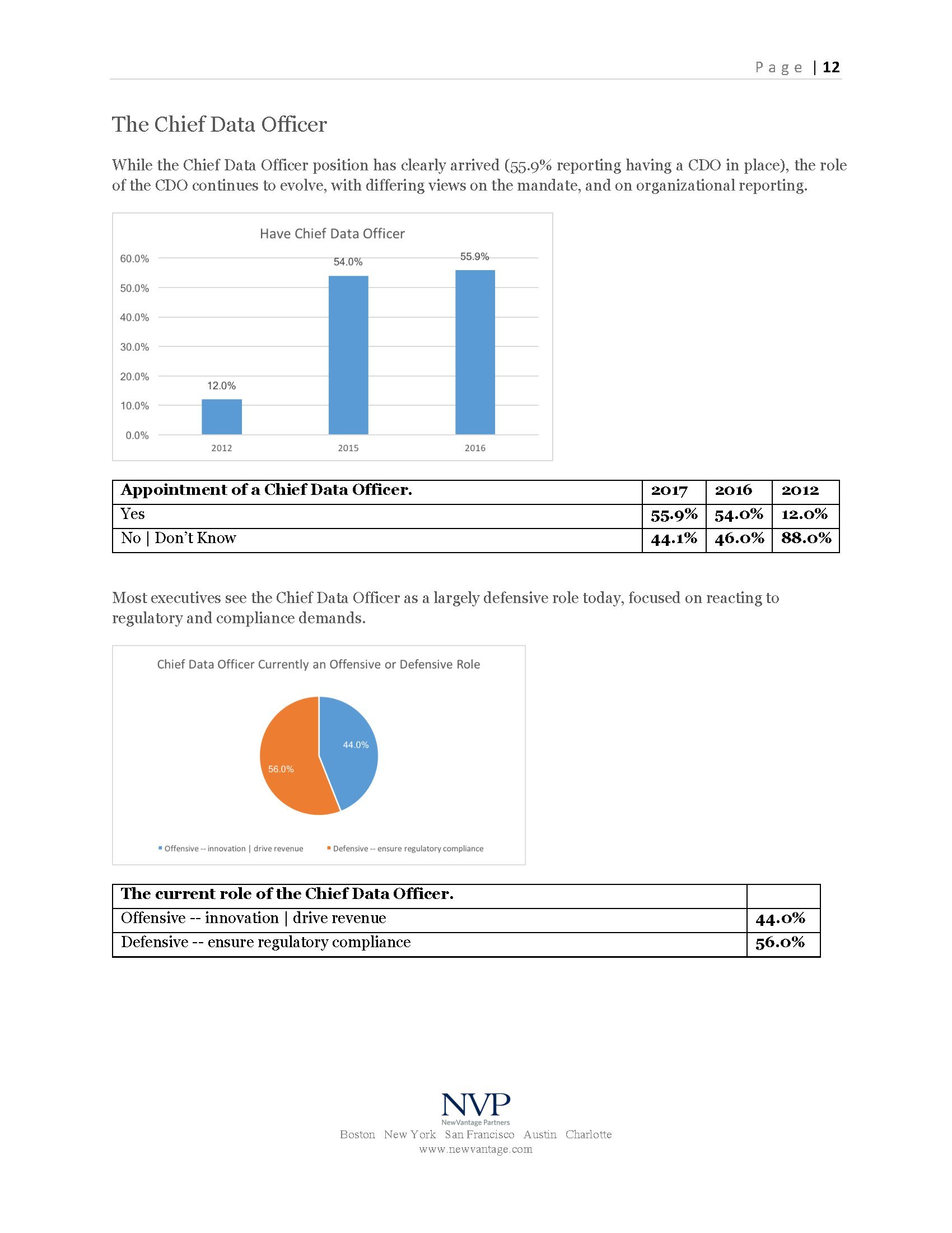 大多数公司有首席数据官(55.9%)。尽管56%的受访者认为CDO在很大程度上是是防御性和被动的,48.3%的高管认为CDO的作用是推动创新和建立数据文化, 41.4%的受访者认为CDO的作用是是管理和利用数据,只有6.9%的高管认为监管合规是CDO的工作重心。