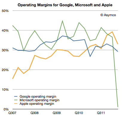 下图显示了三大公司的营业毛利润:Apple的营业毛利跌至33.1%,Google的营业毛利跌至29.2%。若把收购支出费用排除在外,Microsoft毛利润可达35%。