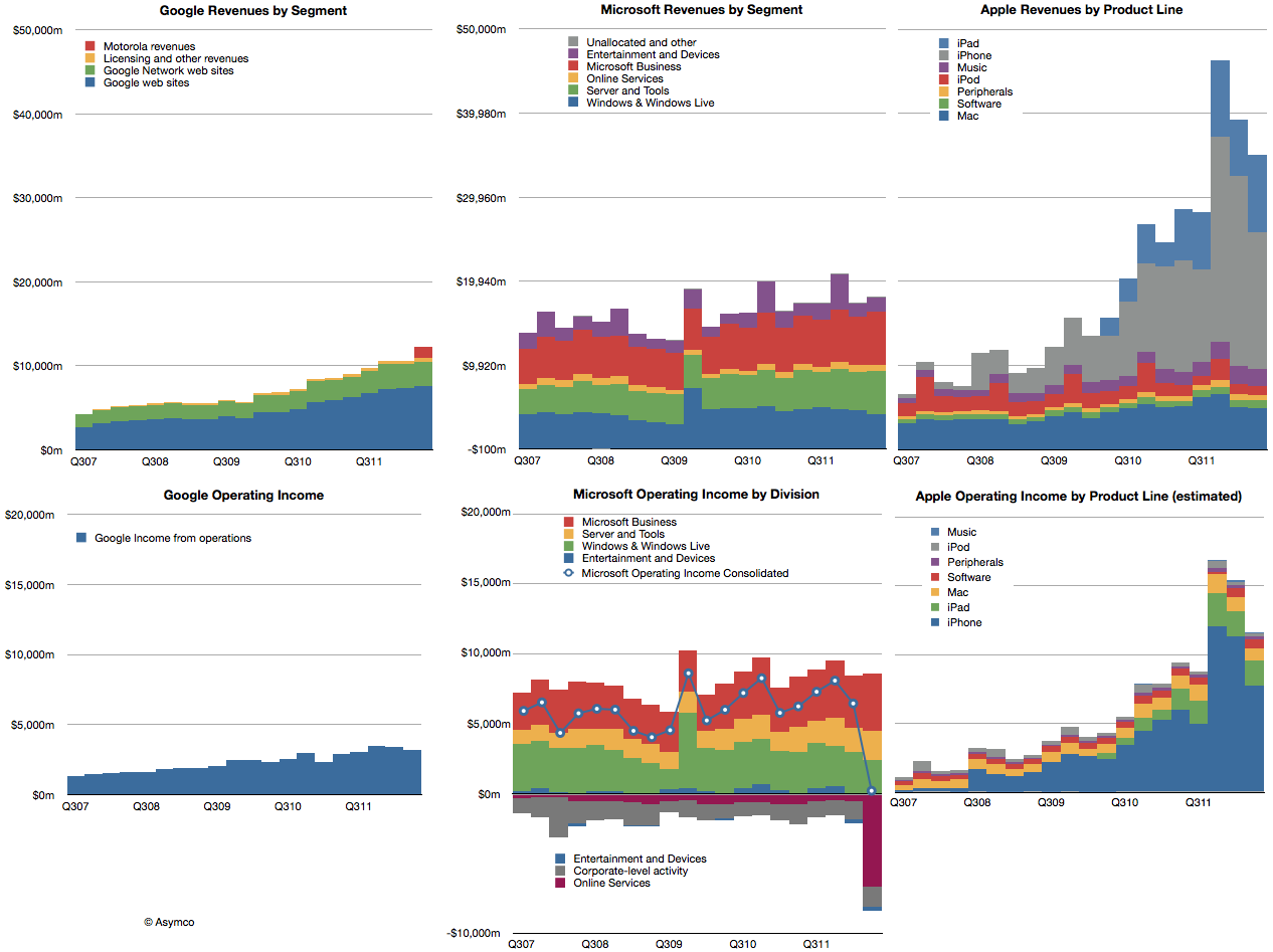 Google、Microsoft以及Apple的2012年第二季度财报数据显示三家主力公司本季度表现尚可,Google 营收增长大约22%,Microsoft营收增长4%,Apple 增长23%,其中Apple的业绩增长低于市场预期。