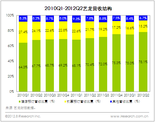 2012Q2艺龙的酒店预订客房间夜量为366.6万,同比增长65.4%,首次超越300万间夜的水平,酒店预订营收规模达1.54亿,同比增长47.1%,在总营收中占比为78.1%。机票预订的比例为15.2%,广告、保险等其他营收占比为6.7%。