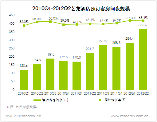 2012年8月20日,艺龙发布第二季度财务报告。艾瑞通过整理发现,Q2艺龙总营收为1.97亿元,同比增长32.7%,其中酒店预订营收1.54亿,占比78.1%,预订间夜量增至366.6万;经营费用达1.36亿,同比增50.0%;净利润为1101.4万元,净利润率为8.7%。