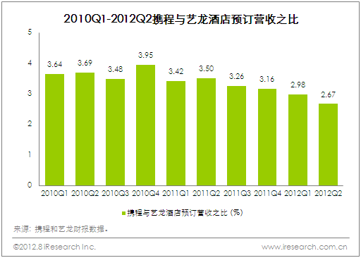 2012Q2中国OTA市场份额最大的携程网酒店预订营收为4.1亿,是同期艺龙酒店预订营收的2.67倍。携程与艺龙酒店预订营收之比的趋势显示,2012Q2艺龙在酒店预订领域与携程的差距进一步缩小。