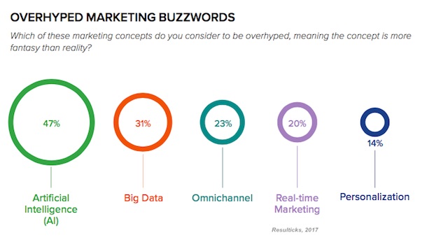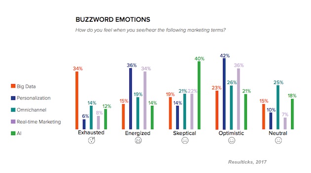 约40%的营销人员表示,他们听到“人工智能”这个术语时会质疑。34%的受访者表示,听到“大数据”这个词时感到筋疲力尽。