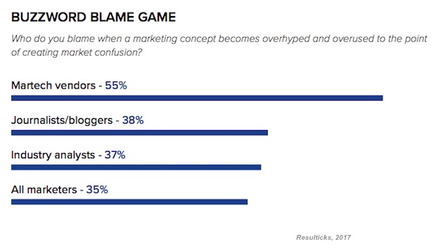 约55%的营销人员责怪营销技术供应商导致这些术语被滥用;38%的受访者则责怪记者和博客。