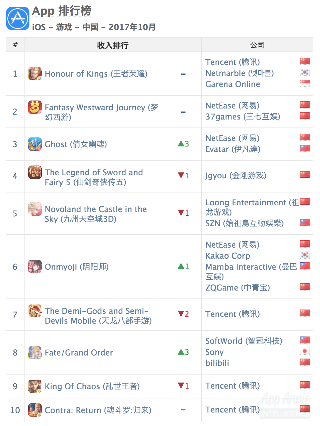 2017 年 10 月中国 iOS 游戏类 App 收入排行榜