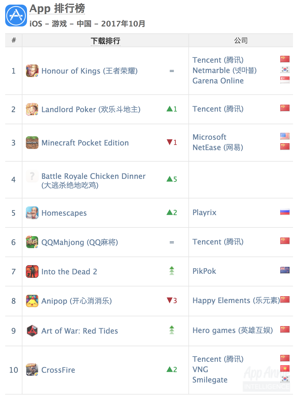 2017 年 10 月中国 iOS 游戏类 App 下载量排行榜
