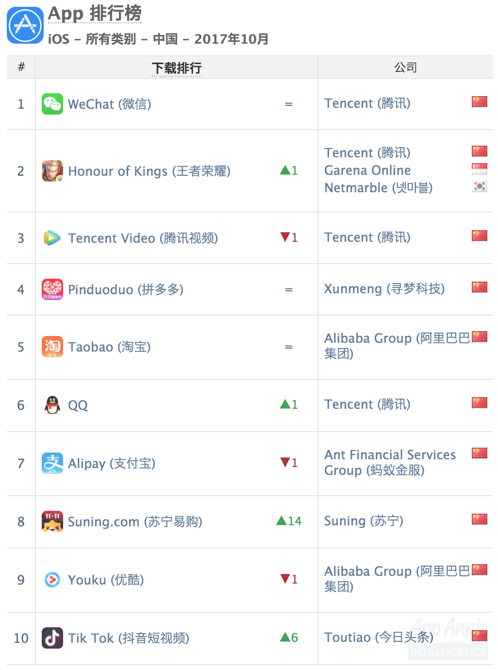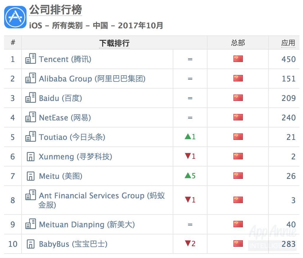 2017 年 10 月中国 iOS 发行商下载量排行榜