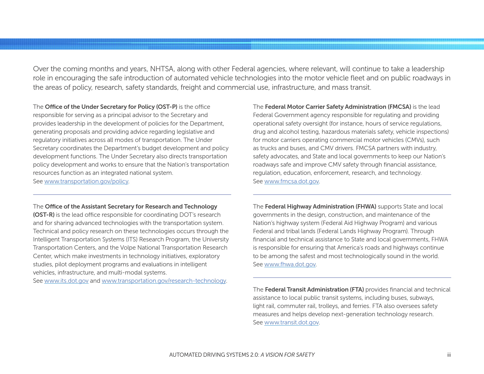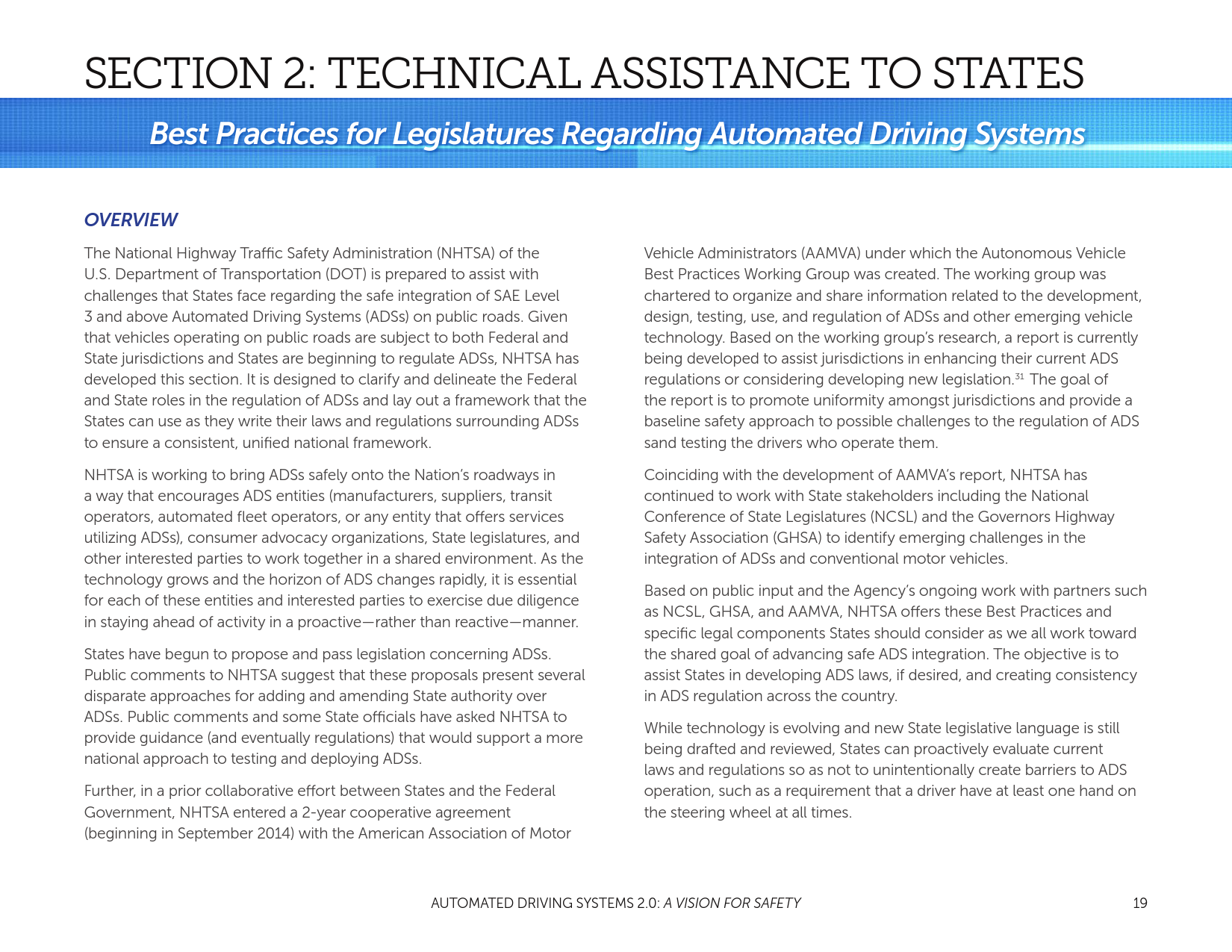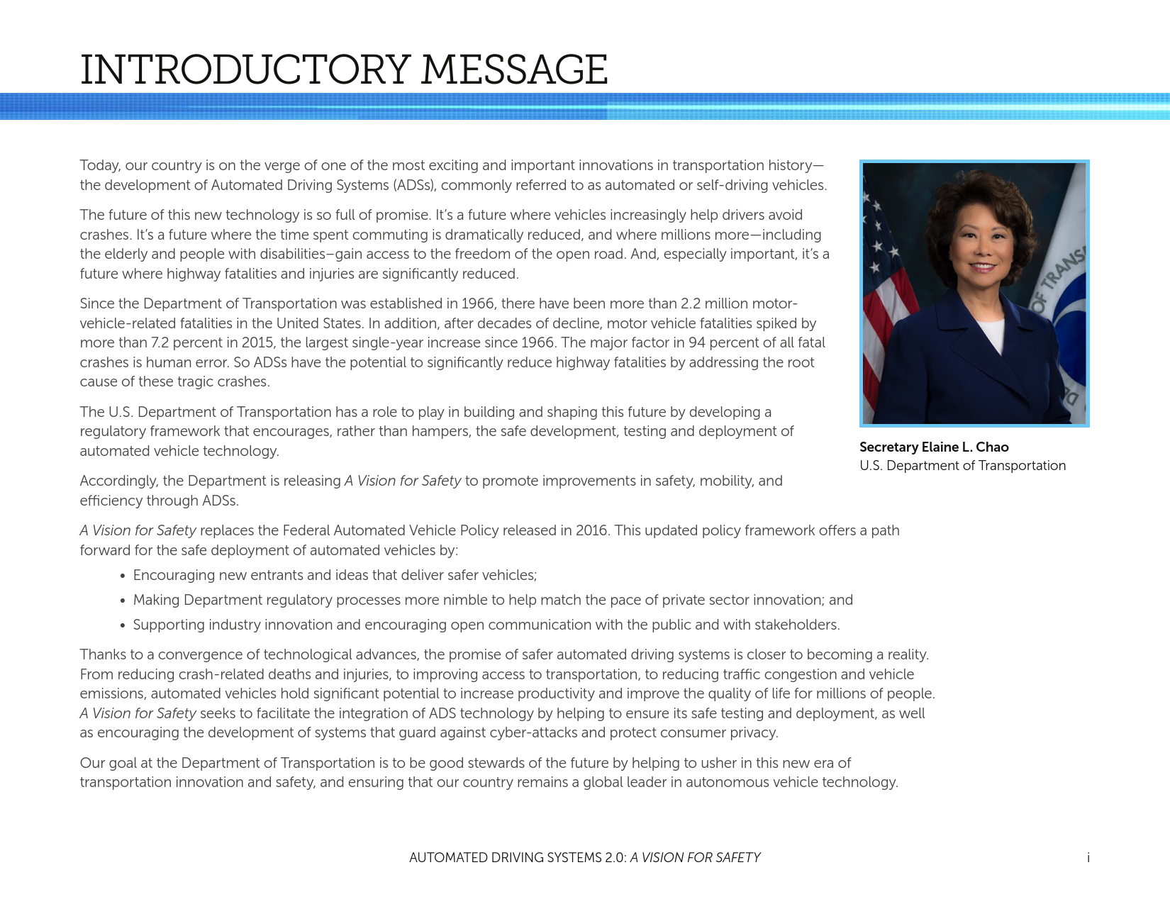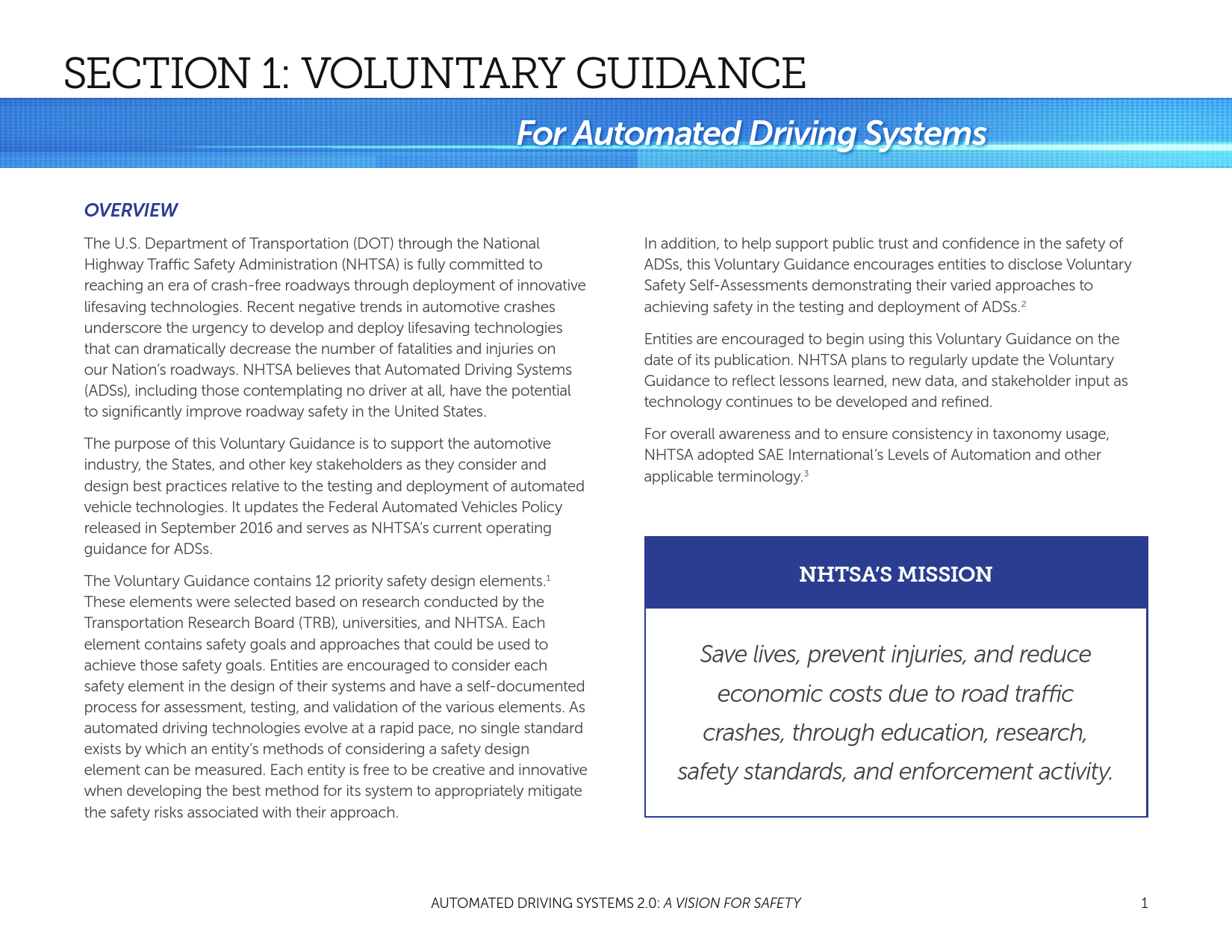 NHTSA的使命是拯救生命,防止伤害,通过教育、研究、安全标准降低道路事故的经济成本,以及进行执法活动。随着自动车辆技术的进步,有可能大幅减少每天道路交通事故中的生命损失。为了支持行业的创新者和国家在这项技术的部署,同时告知和教育公众,并通过安全技术的引入提高路面安全,NHTSA发布了“自动驾驶系统:安全展望”。支持自动化技术的安全引进是DOT多方努力的一个重要组成部分。