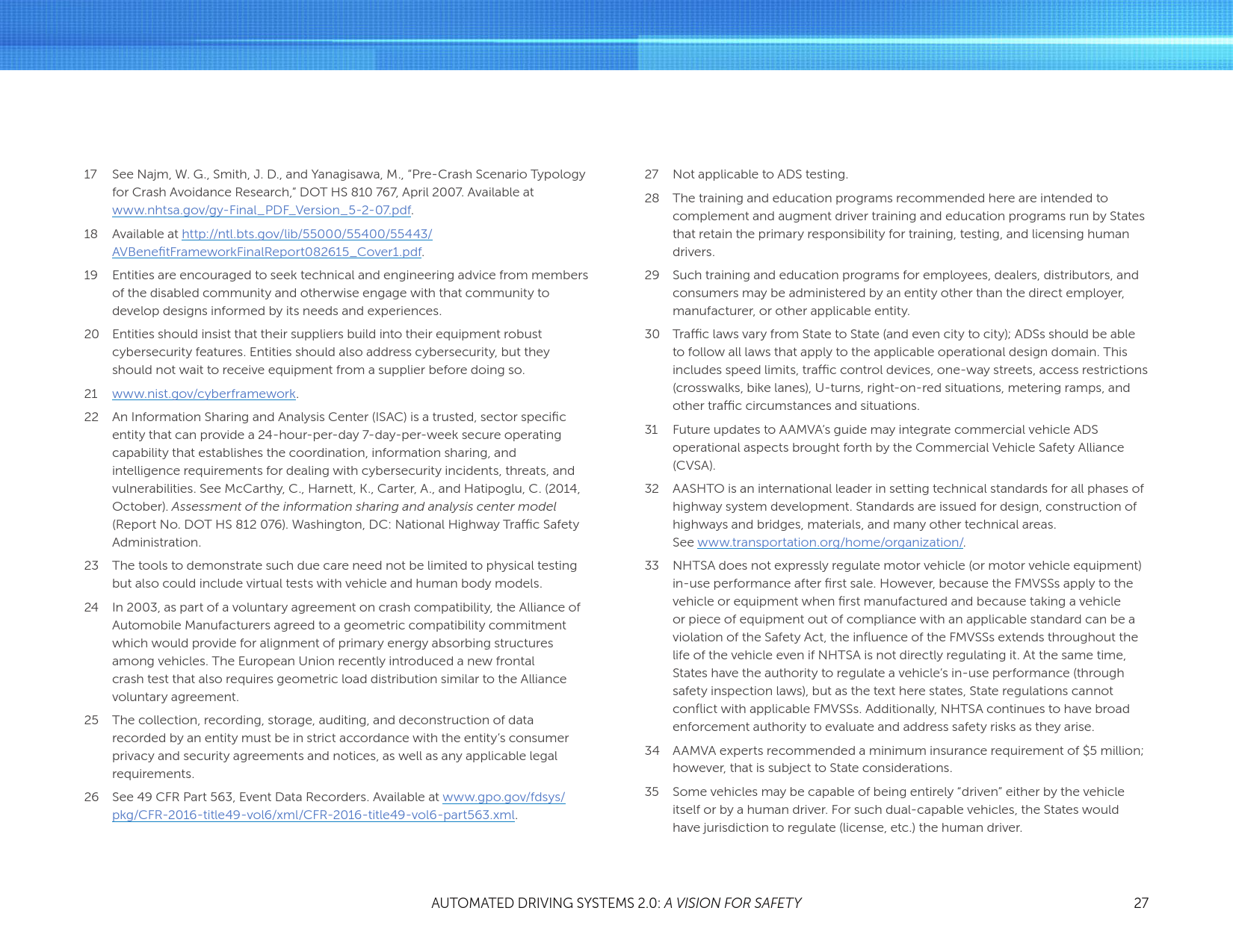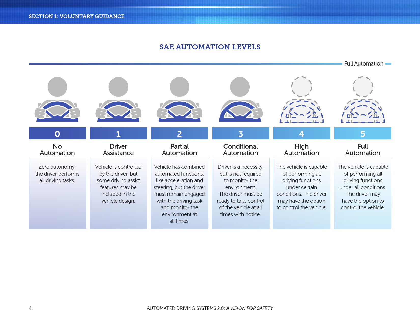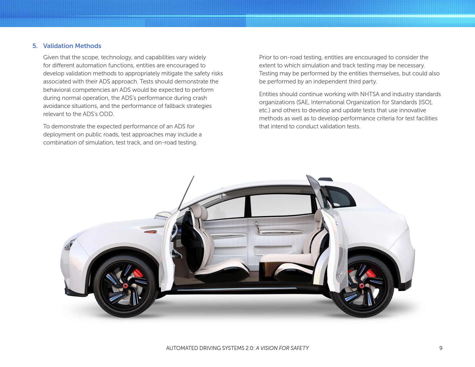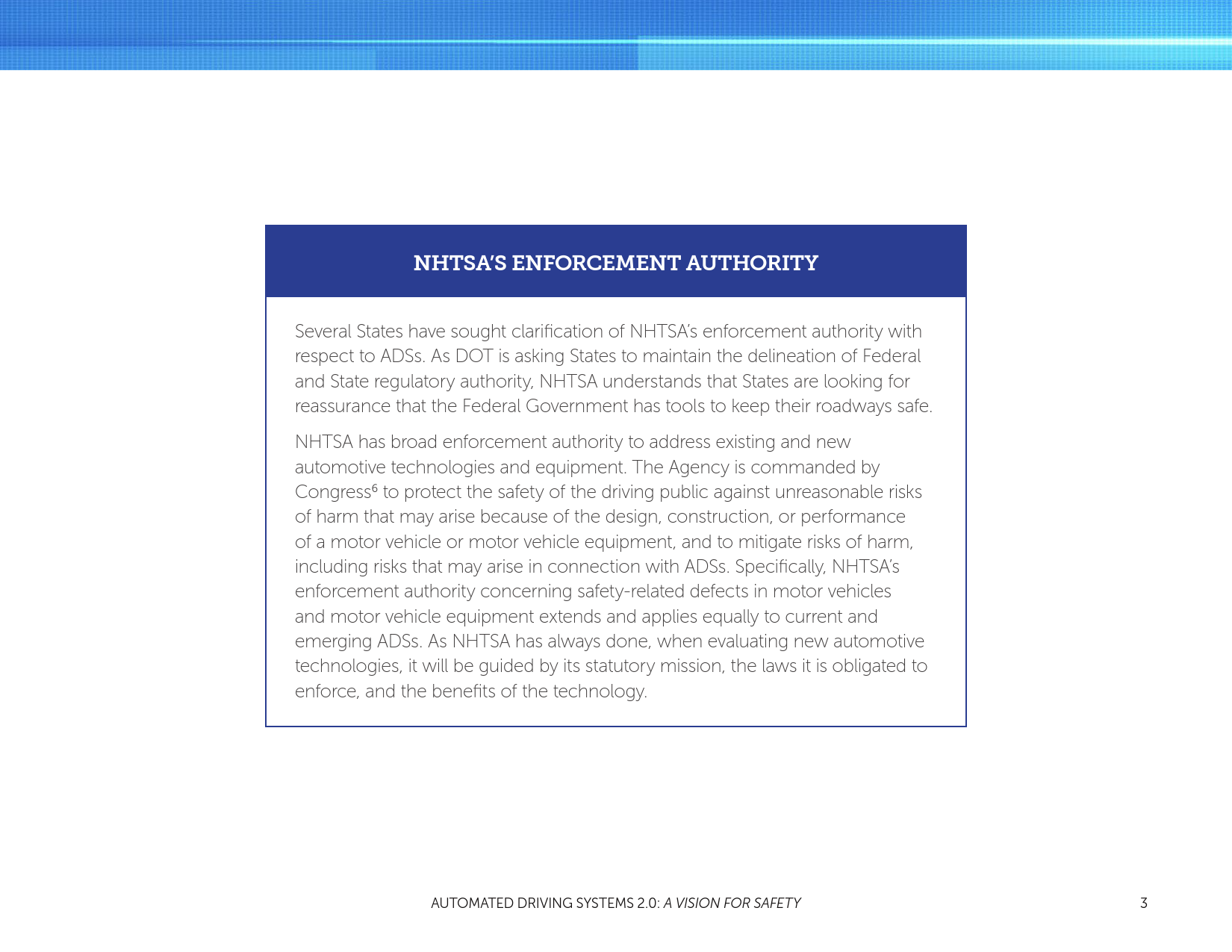 NHTSA的使命是拯救生命,防止伤害,通过教育、研究、安全标准降低道路事故的经济成本,以及进行执法活动。随着自动车辆技术的进步,有可能大幅减少每天道路交通事故中的生命损失。为了支持行业的创新者和国家在这项技术的部署,同时告知和教育公众,并通过安全技术的引入提高路面安全,NHTSA发布了“自动驾驶系统:安全展望”。支持自动化技术的安全引进是DOT多方努力的一个重要组成部分。