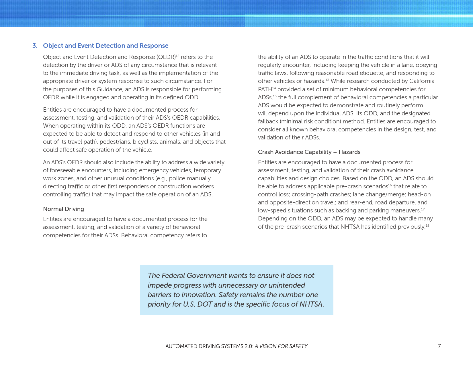 世界正面临着前所未有的自动化技术的涌现。在交通运输领域,10个严重的道路交通事故中有9起是由于人类行为而引起的,自动车辆将技术有可能挽救成千上万人的生命,同时减少交通堵塞,提高交通运行效率和生产率。联邦政府希望确保其不会成为阻碍技术创新的不必要或无意的障碍。安全仍是美国运输部(DOT)的首要关注焦点,同时也是美国国家公路交通安全管理局(NHTSA)的关注重点。