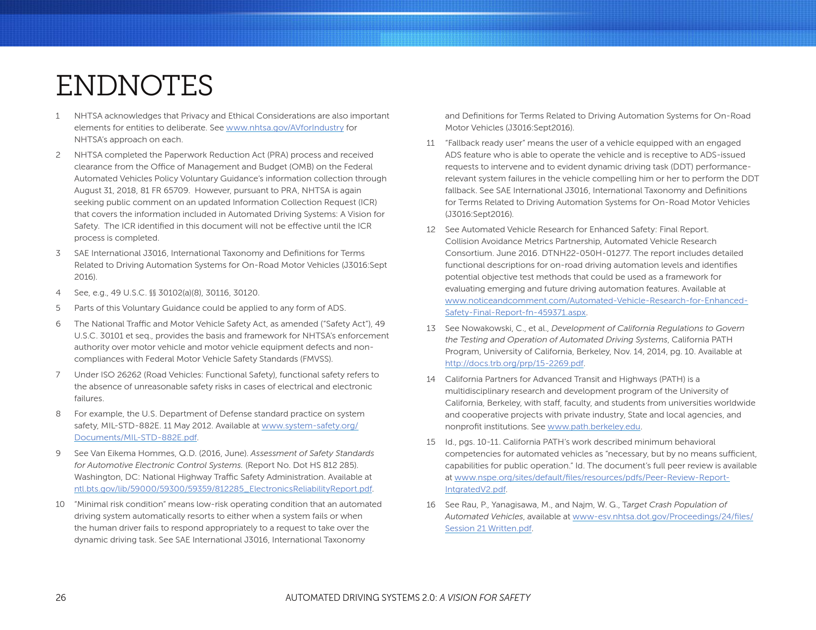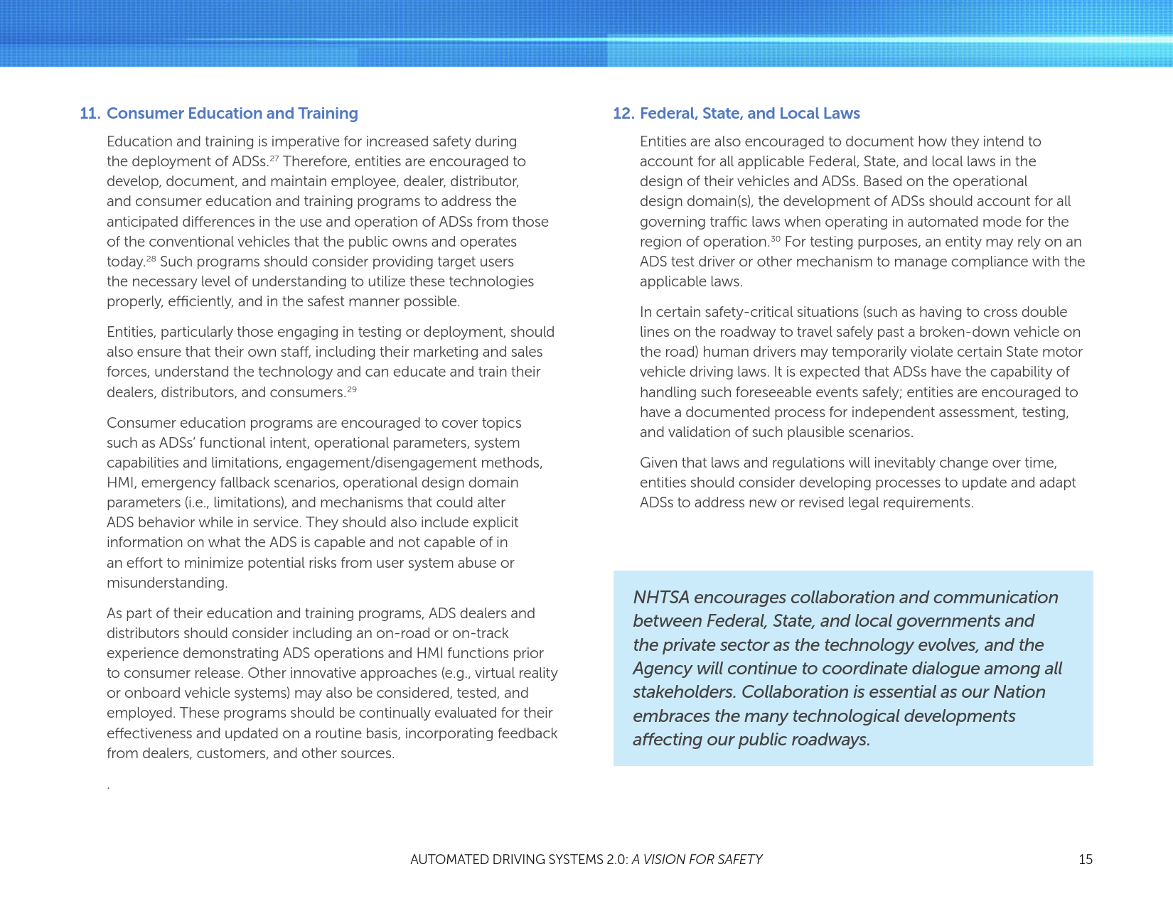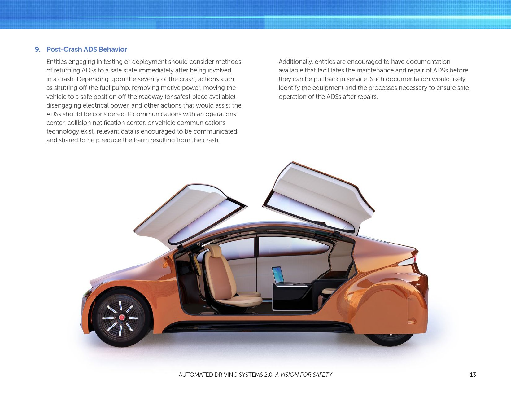 在这份文件中,NHTSA提了一种非监管的自动车辆技术安全方法。第1节:自动驾驶系统的自愿指导(自愿指导),以支持汽车行业和其他主要利益相关者为他们考虑和设计测试及安全部署自动驾驶系统(ADSs——SAE自动驾驶等级3~5——视条件而定的自动化,高自动化,全自动化系统)的最佳实践。它包含12个优先考虑的安全设计元素,包括车辆网络安全、人机界面、耐撞性、消费者的教育和培训,以及碰撞后ADS行为。