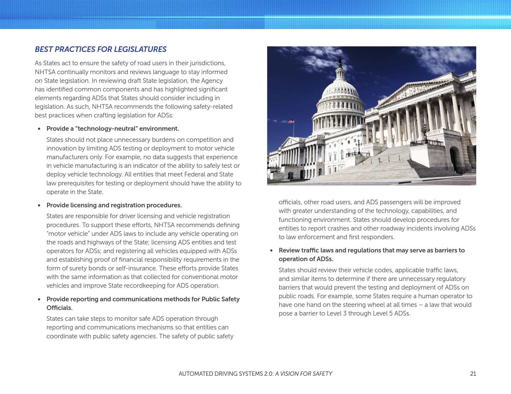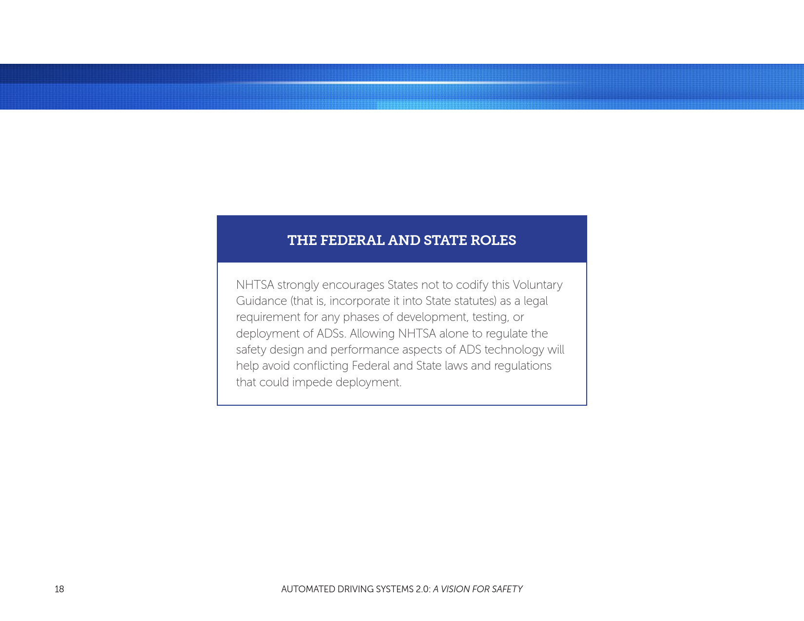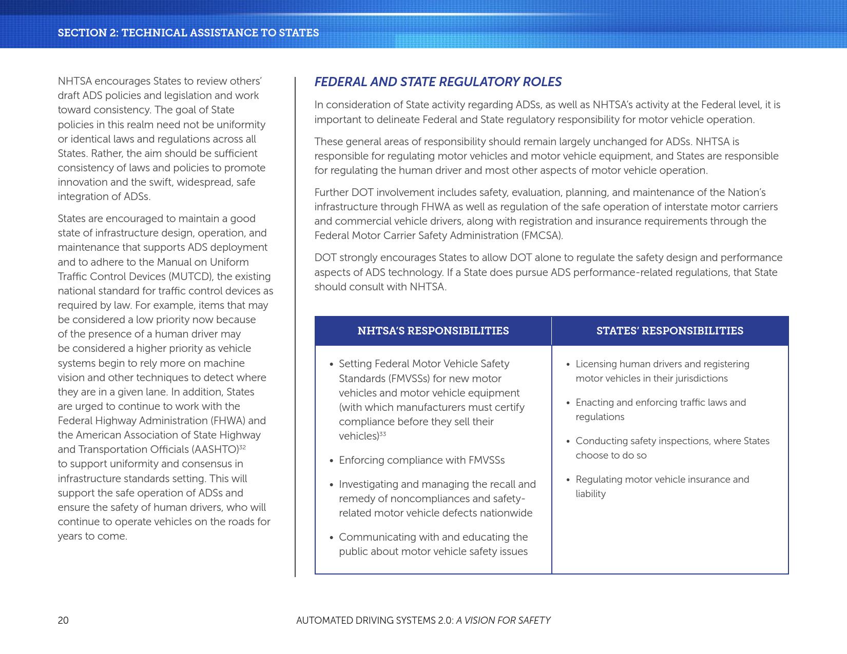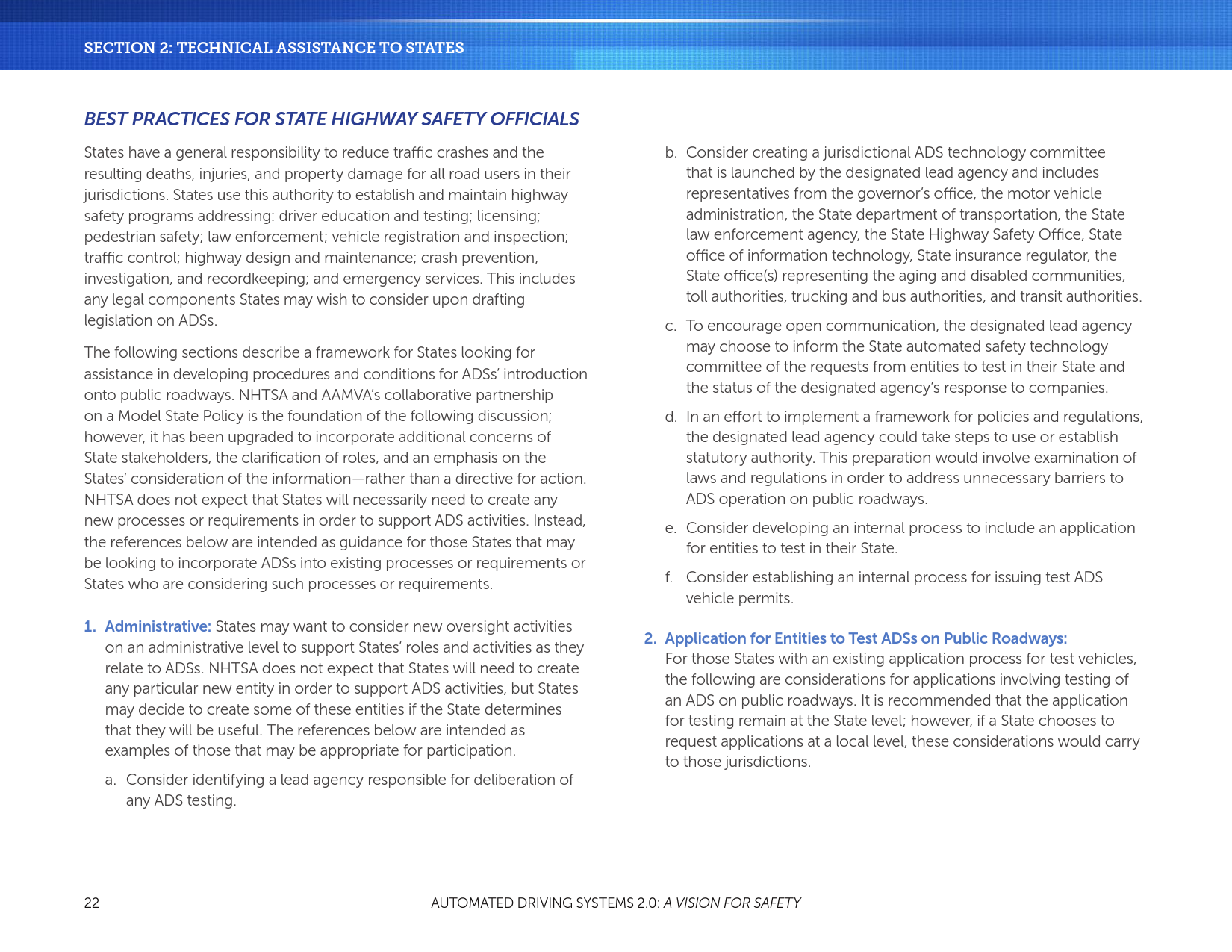 在公共道路上的运行的车辆同时受联邦和州的管辖,各州都开始起草法案,以安全地部署新兴的ADSs。为了支持各州的工作,NHTSA提供了本文第2节:向各州提供的技术援助,立法机构对于自动驾驶系统的最佳实践(最佳实践)。该部分阐明和揭示了在监管ADSs时联邦和州的角色。NHTSA负责管理汽车和机动车辆设备的安全设计和性能;各州继续负责管理驾驶人和车辆操作。