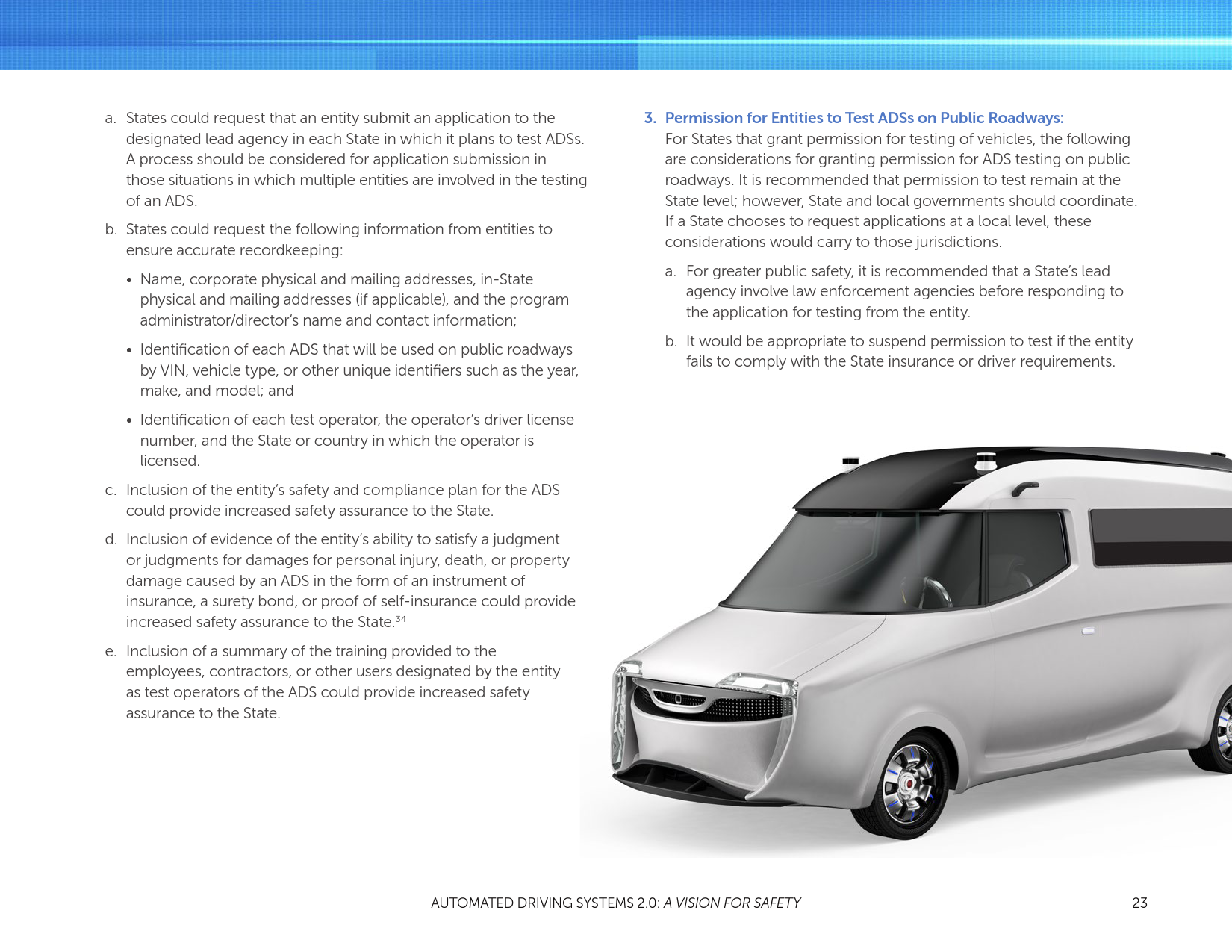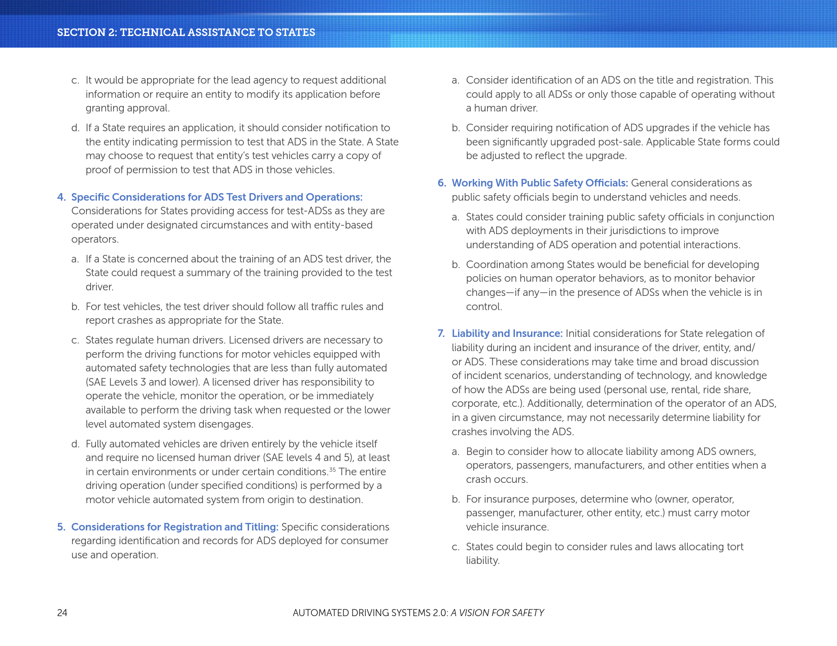 第2节还提供了立法机构的最佳实践,其中包括对于ADSs(各州应考虑立法)常见的与安全相关的构件和重要元素。此外,本节提供了国家公路安全官员的最佳实践,它为各州发展使ADSs在公共道路安全运行的条件及程序提供了一个框架。它包括了在应用程序和权限测试、登记和所有权、与公共安全官员合作,以及责任和保险等方面的考虑。