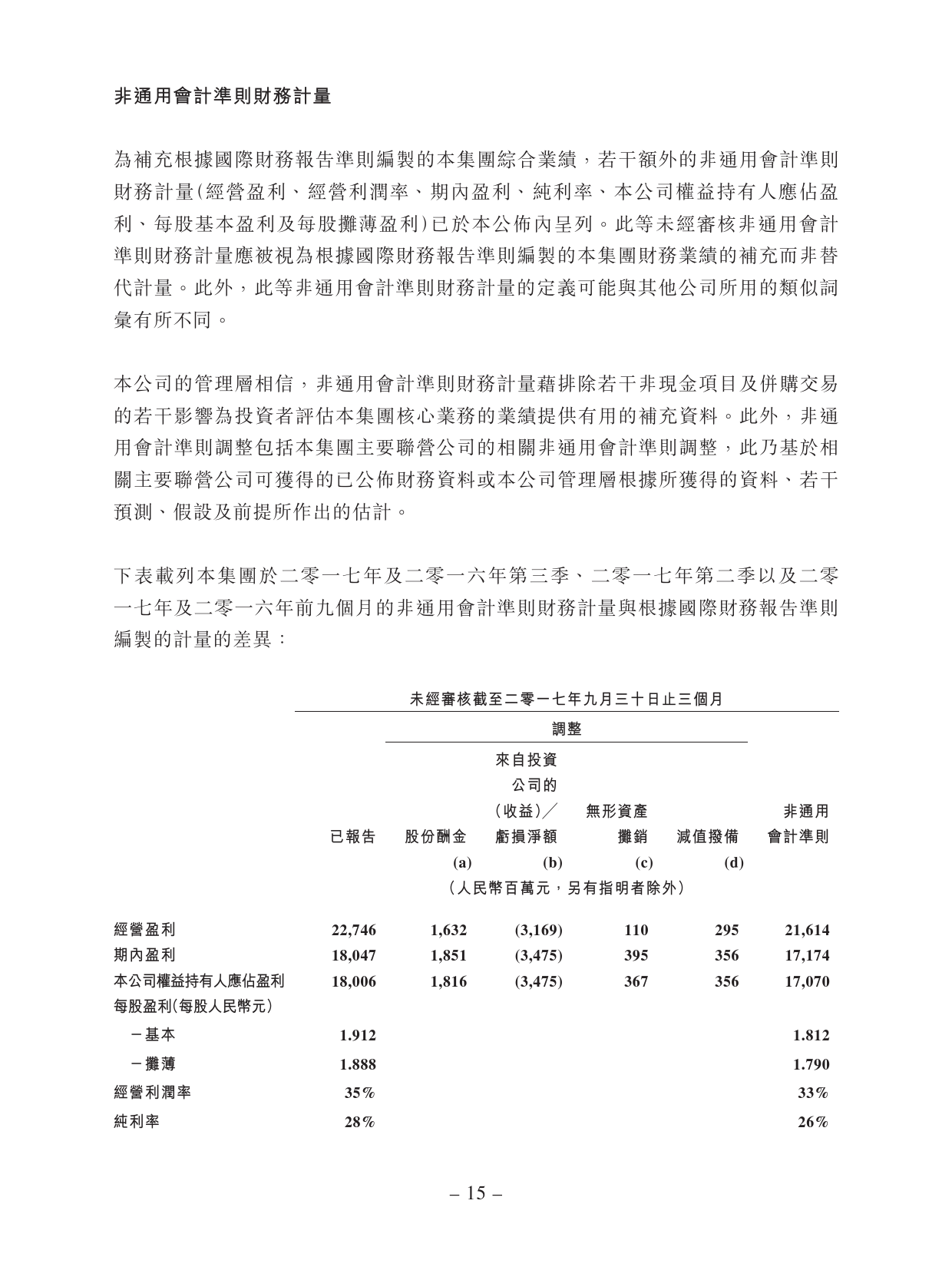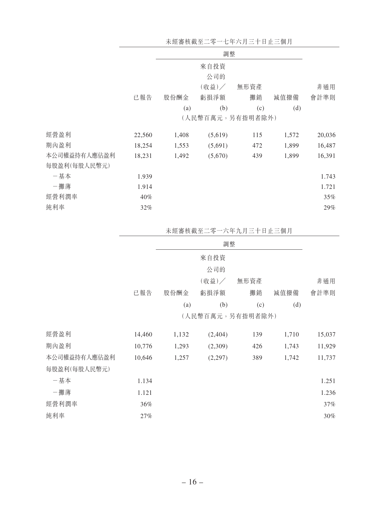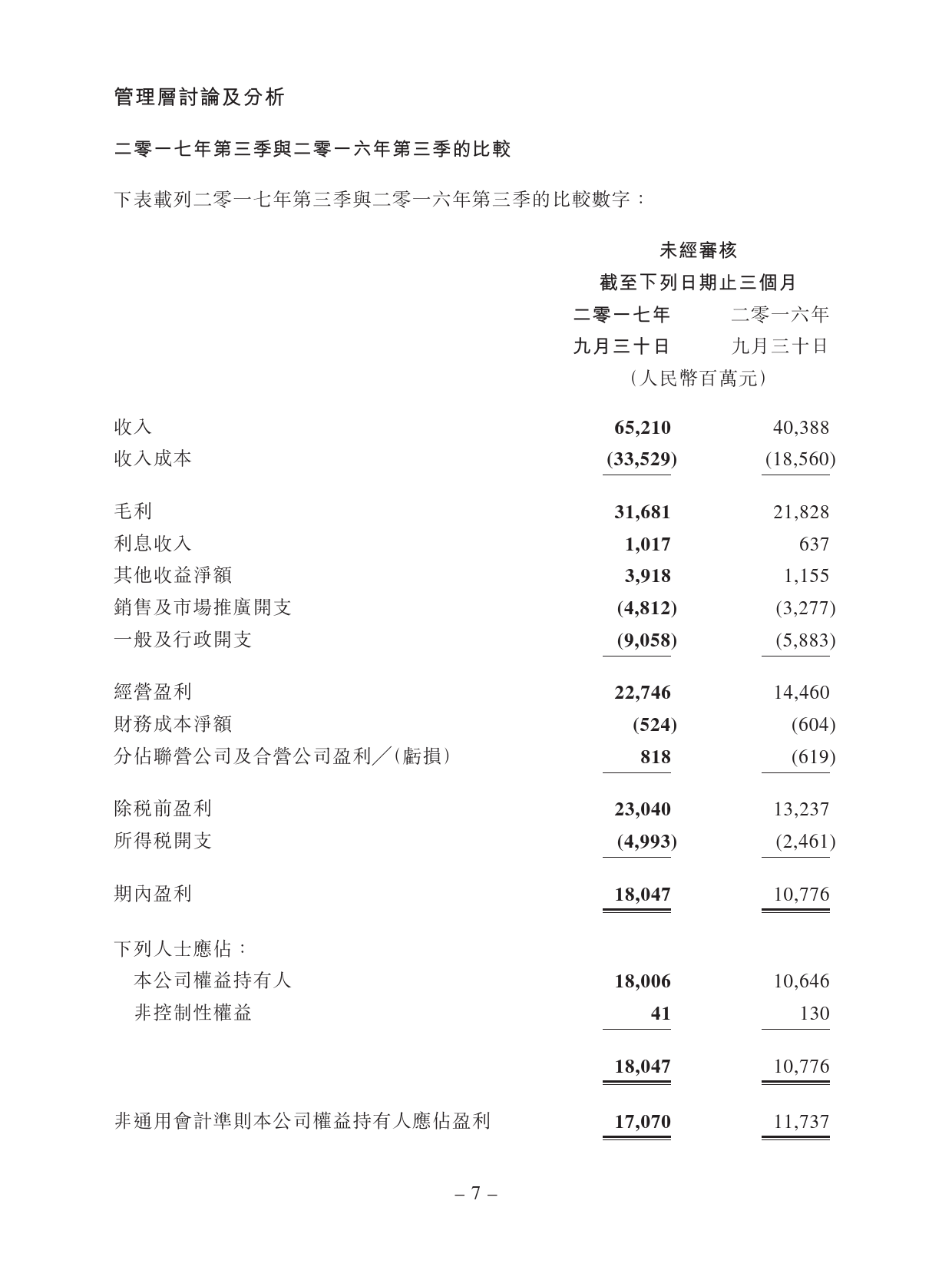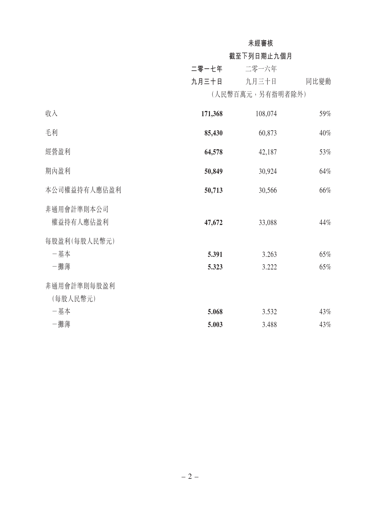 经营盈利为人民币227.46亿元 (34.27亿美元),比去年同期增长57%;经营利润率为由去年同期的36%下降至35%。