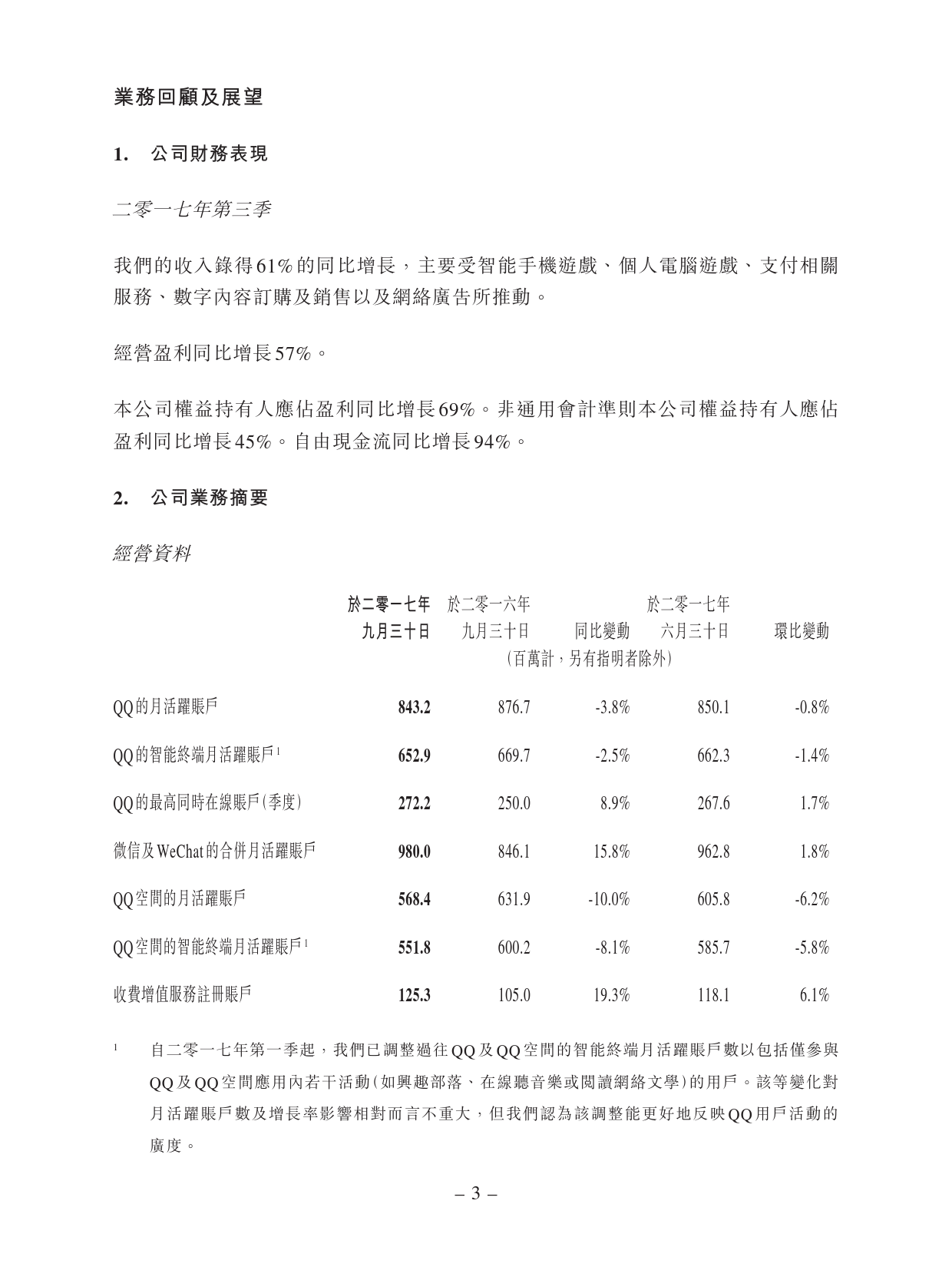 – QQ:智能终端月活跃账户同比下降2.5%至6.529亿,然而包括PC及移动端在内的最高同时在线账户同比增长8.9%至2.722亿。年龄为21岁或以下用户的智能终端月活跃帐户同比增长,而且他们的使用时间较长,因为我们加强了QQ的功能以吸引年轻用户。我们在《QQ看点》信息流服务中推出“话题”功能帮助用户发现热门内容。《QQ看点》的日活跃用户及使用时长持续增长。
