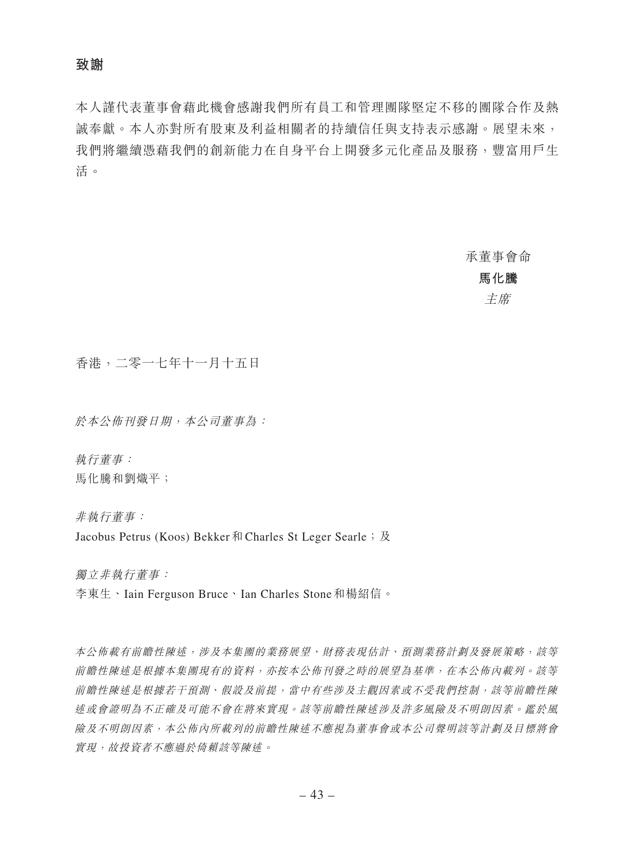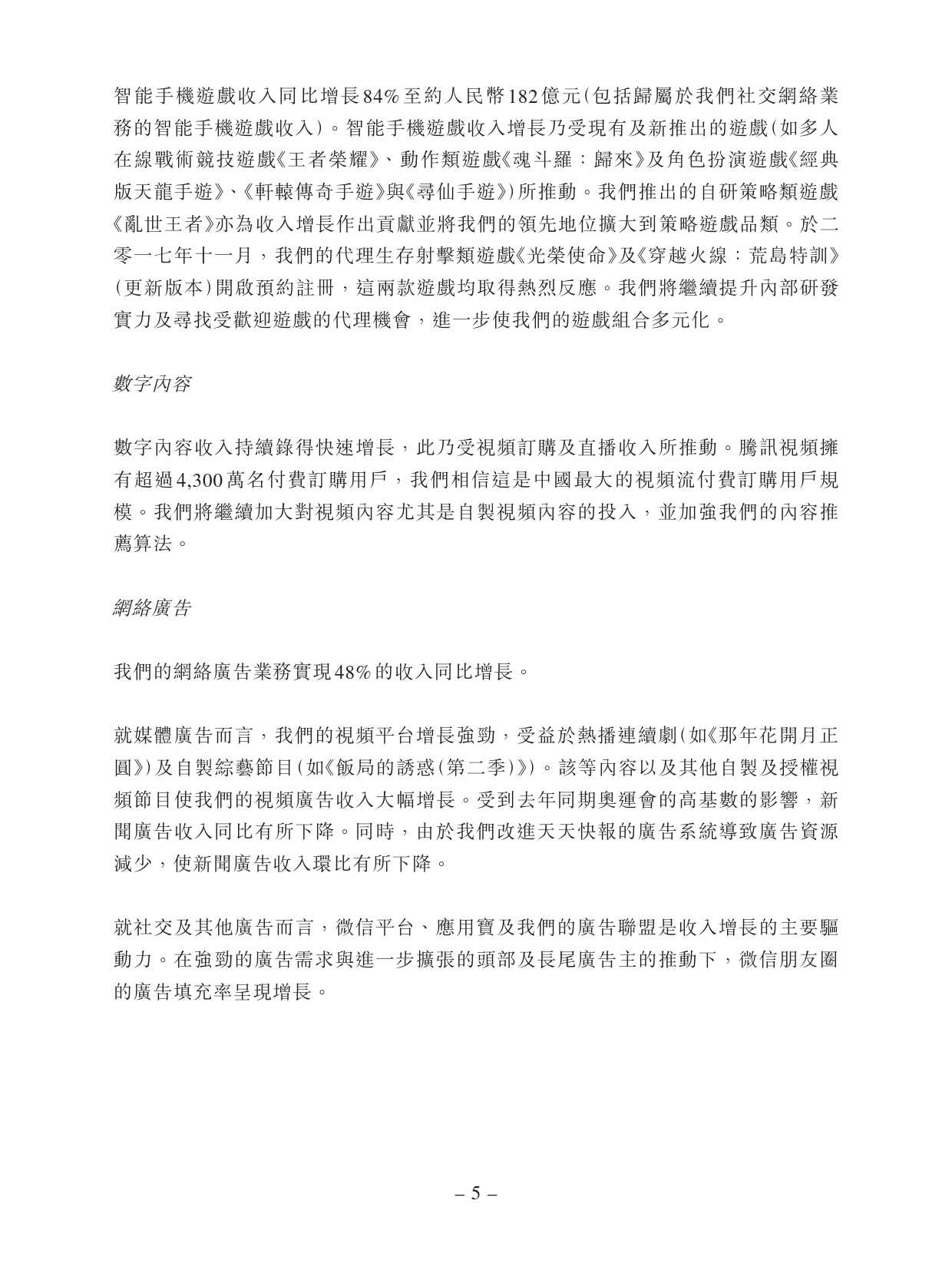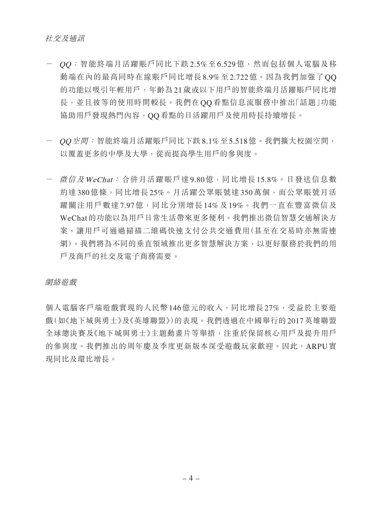 – 微信及WeChat:合并月活跃账户达9.80亿,同比增长15.8%。日发送的消息数约达380亿条,同比增长25%。月活跃公众号350万个,而公众号月活跃关注用户数为7.97亿,同比分别增长14%及19%。我们一直在丰富微信及WeChat的功能以为用户日常生活带来更多便利。我们推出微信智慧交通解决方案,让用户即使在没有网络的情况下,也可以通过扫描二维码快速支付公共交通费用。我们将为不同的垂直领域推出更多智慧解决方案,以更好服务我们的用户及商户的社交及电子商务需要。