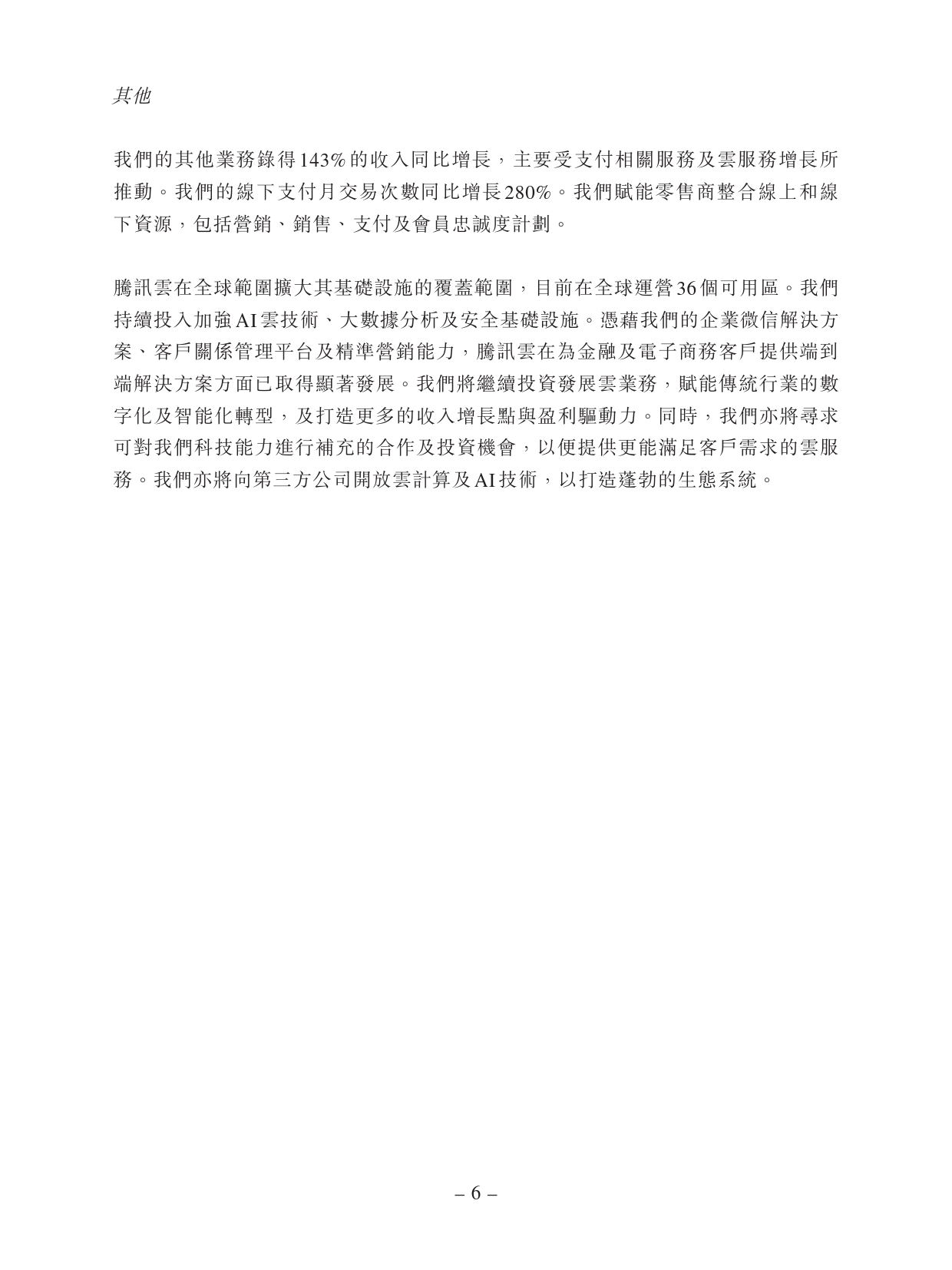 腾讯云在全球范围扩大其基础设施的覆盖范围,目前在全球运营36个可用区。我们持续投入加强AI云技术、大数据分析及安全基础设施。凭借我们的企业微信解决方案、客户关系管理平台及精准营销能力,腾讯云在为金融及电子商务客户提供端到端解决方案方面已取得显著发展。我们将继续投资发展云业务,赋能传统行业的数字化及智能化转型,及打造更多的收入增长点及盈利驱动力。同时,我们亦将寻求可对我们科技能力进行补充的合作及投资机会,以便提供能更好满足客户需求的云服务。我们亦将向第三方公司开放云计算及AI技术,以打造繁荣的生态系统。
