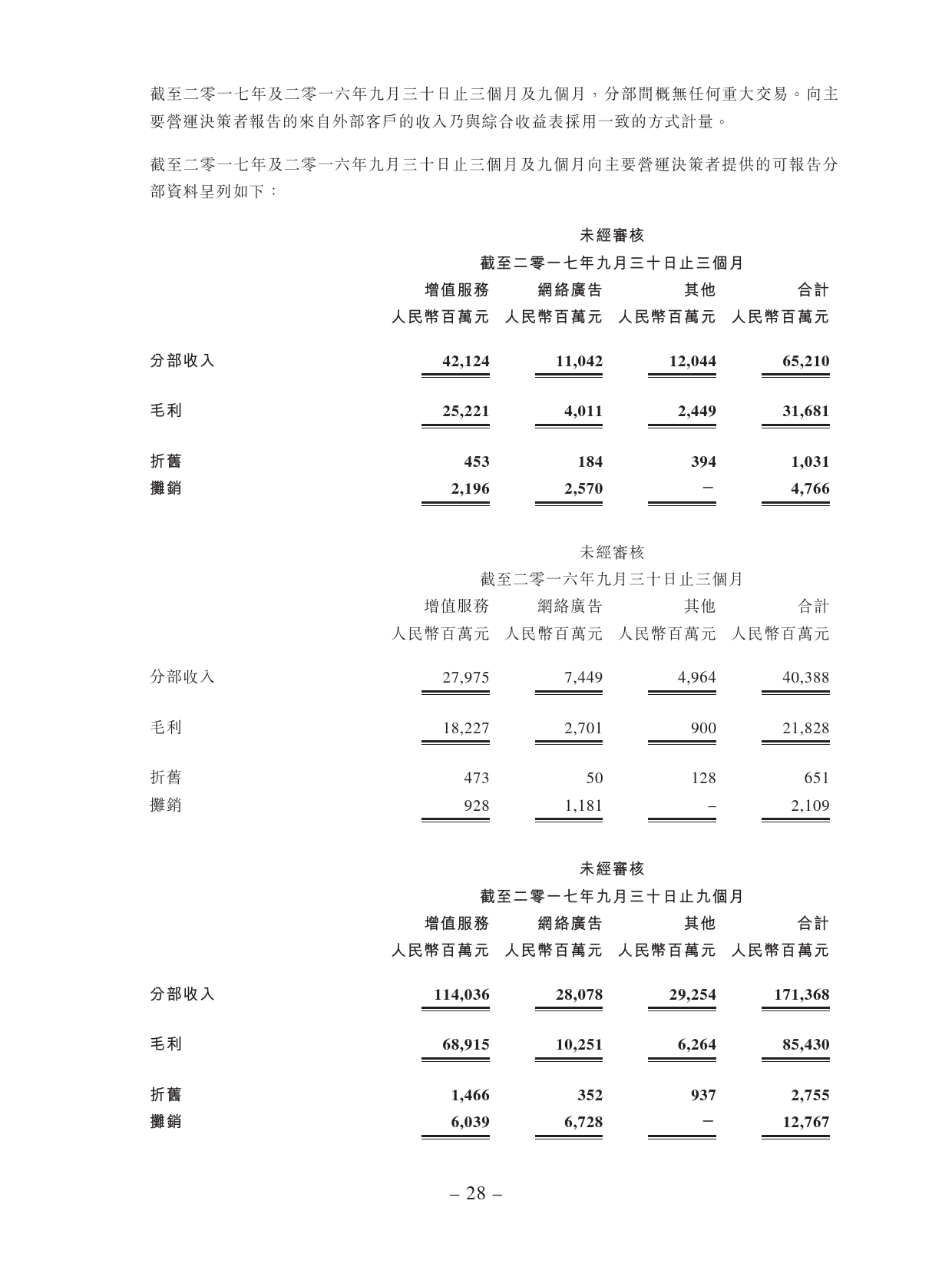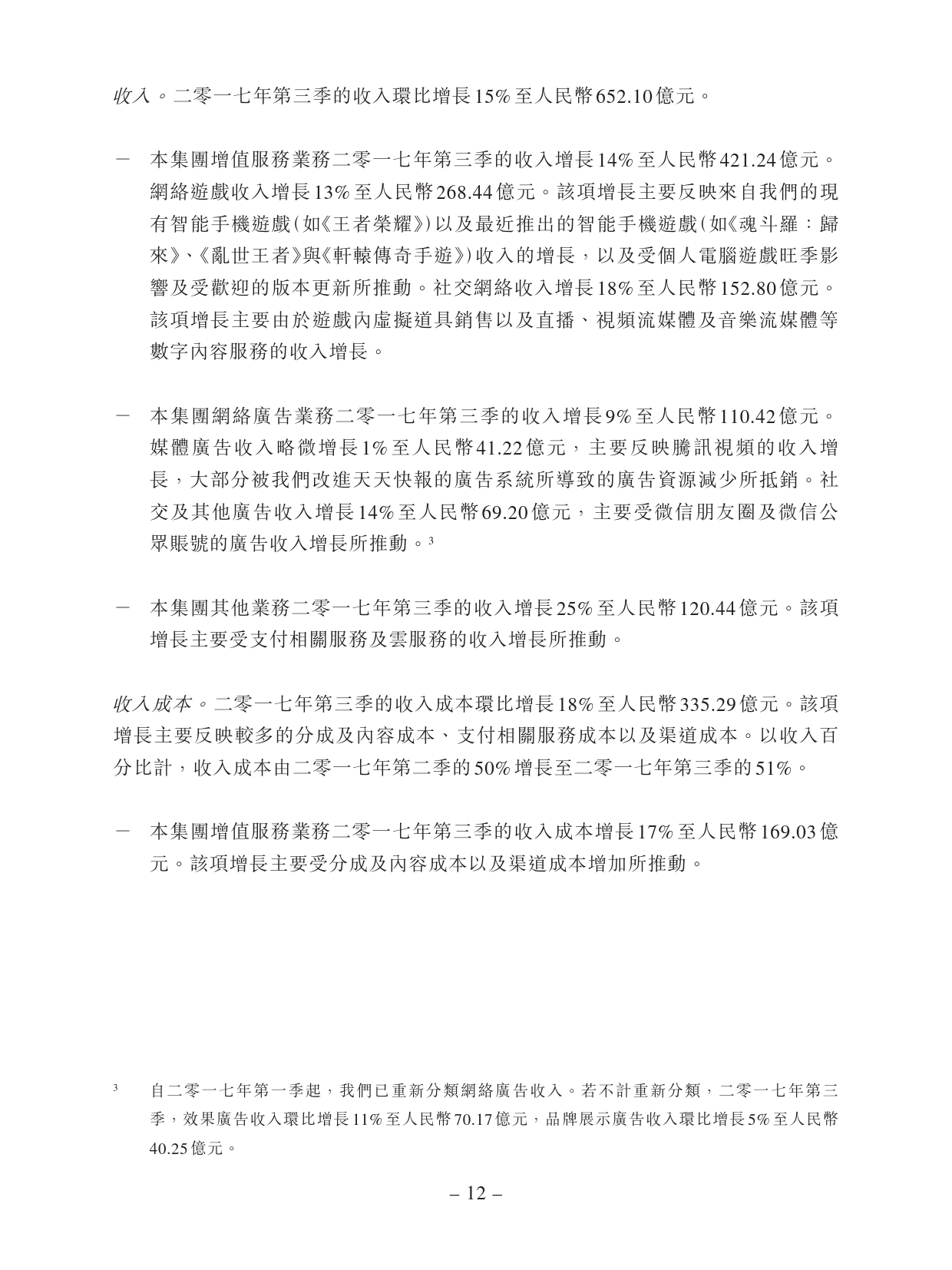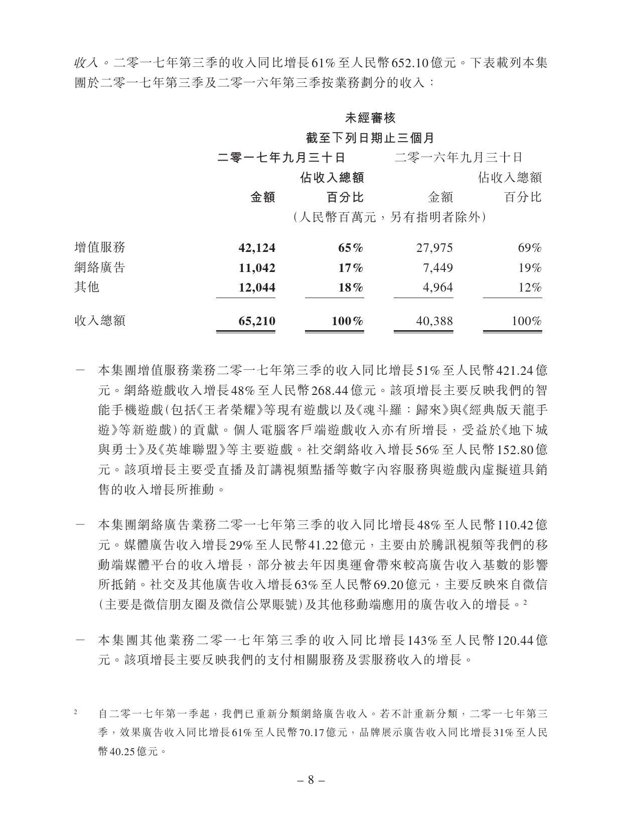 增值服务业务2017年第三季的收入同比增长51%至人民币421.24亿元。网络游戏收入增长48%至人民币268.44亿元。该项增长主要反映我们的智能手机游戏(包括《王者荣耀》等现有游戏以及《魂斗罗:归来》与《经典版天龙手游》等新游戏)的贡献。PC端游收入亦有所增长,受益于《地下城与勇士》及《英雄联盟》等主要游戏。社交网络收入增长56%至人民币152.80亿元,主要受直播、视频付费订购以及游戏内虚拟道具销售的收入增长所推动。