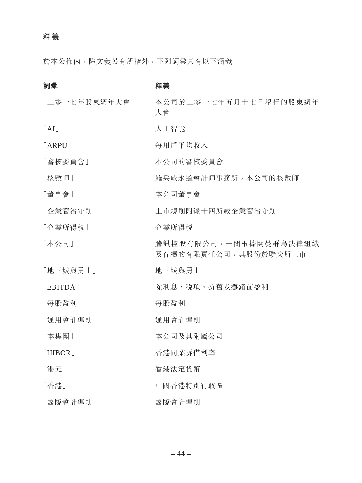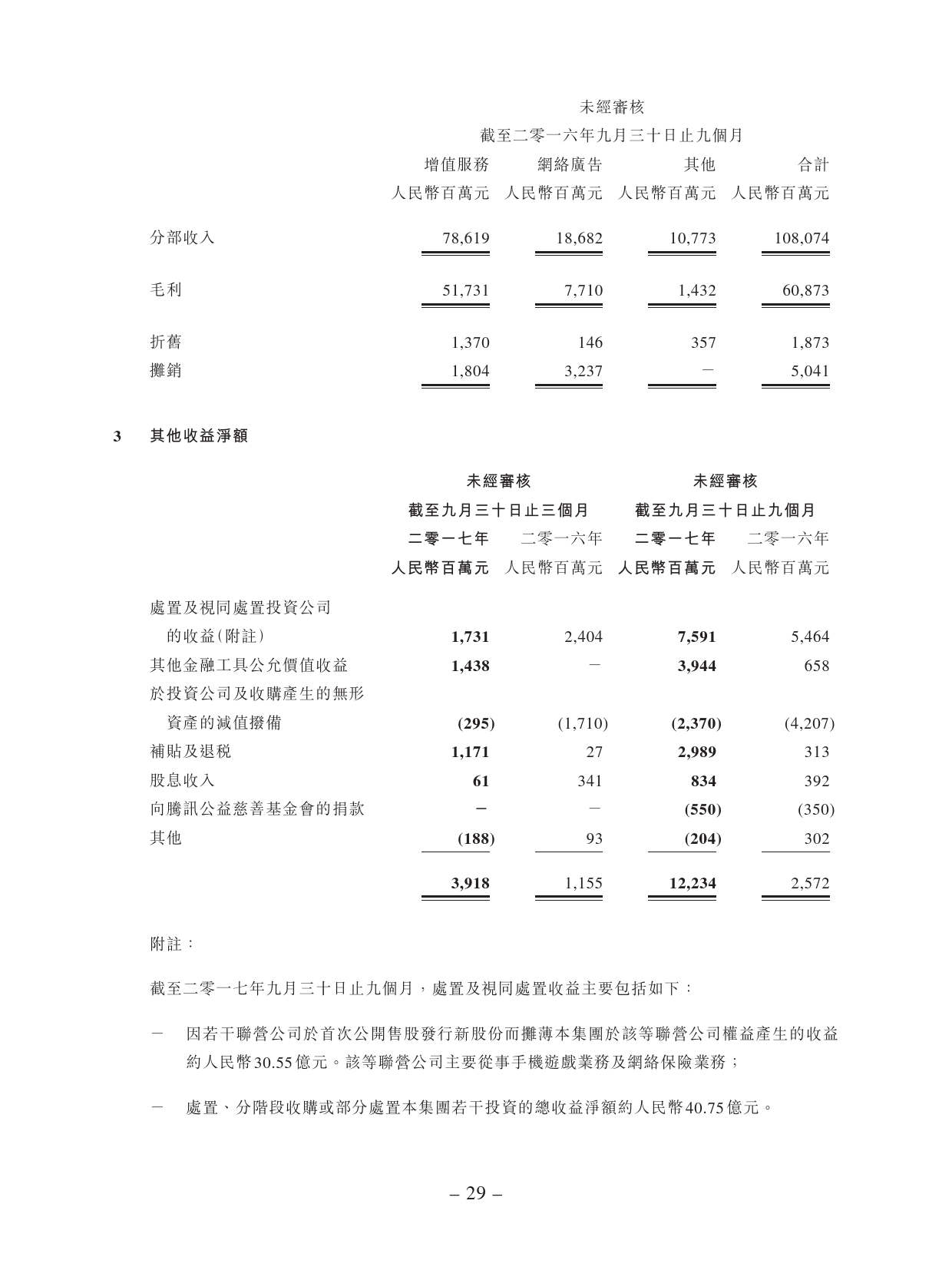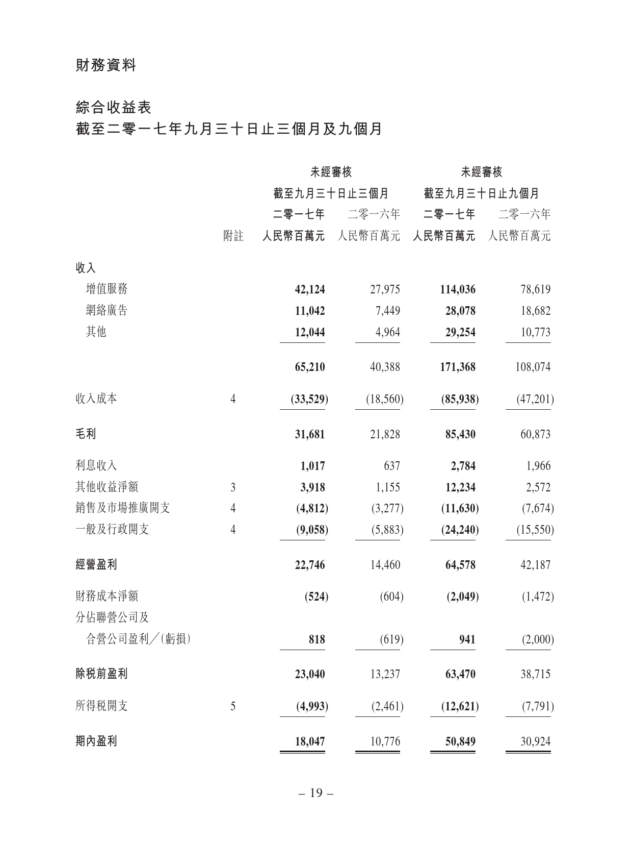 增值服务业务2017年第三季的收入同比增长51%至人民币421.24亿元。网络游戏收入增长48%至人民币268.44亿元。该项增长主要反映我们的智能手机游戏(包括《王者荣耀》等现有游戏以及《魂斗罗:归来》与《经典版天龙手游》等新游戏)的贡献。PC端游收入亦有所增长,受益于《地下城与勇士》及《英雄联盟》等主要游戏。社交网络收入增长56%至人民币152.80亿元,主要受直播、视频付费订购以及游戏内虚拟道具销售的收入增长所推动。