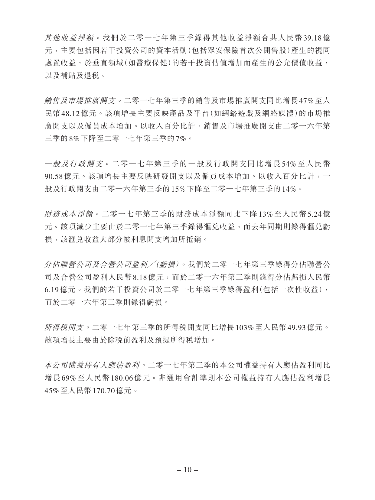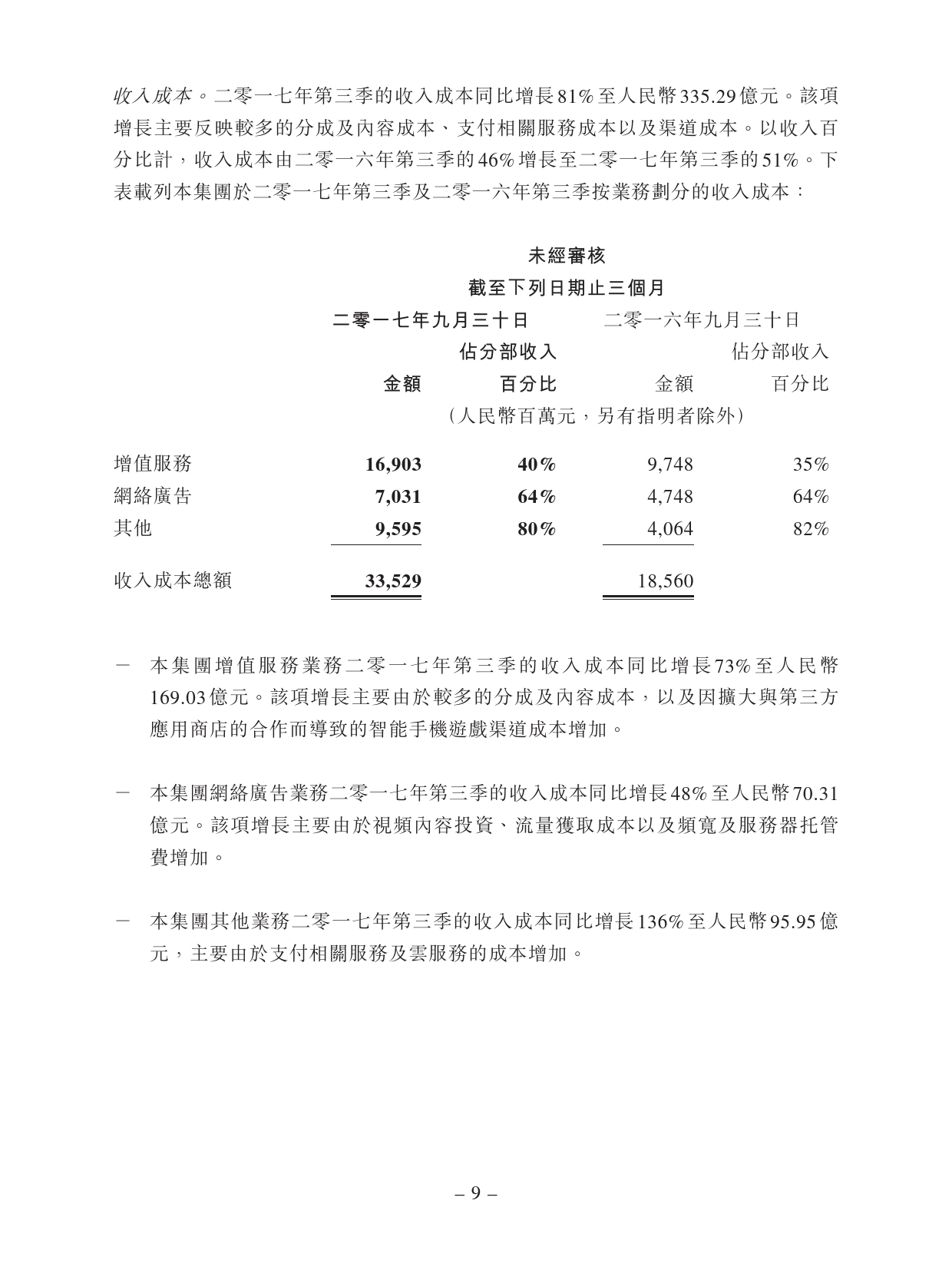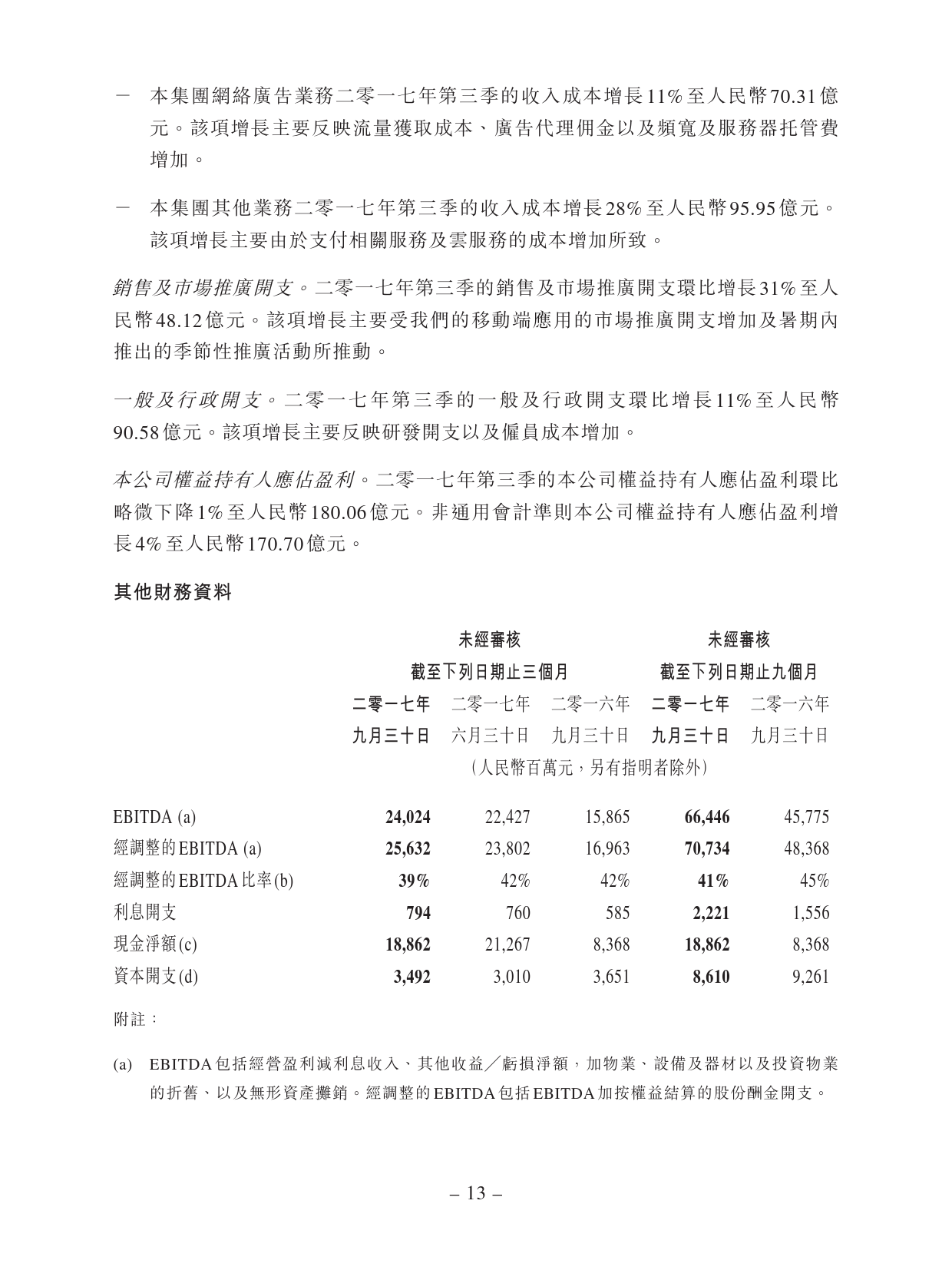 其他业务2017年第三季的收入同比增长143%至人民币120.44亿元。该项增长主要反映我们的支付相关服务及云服务收入的增长。
