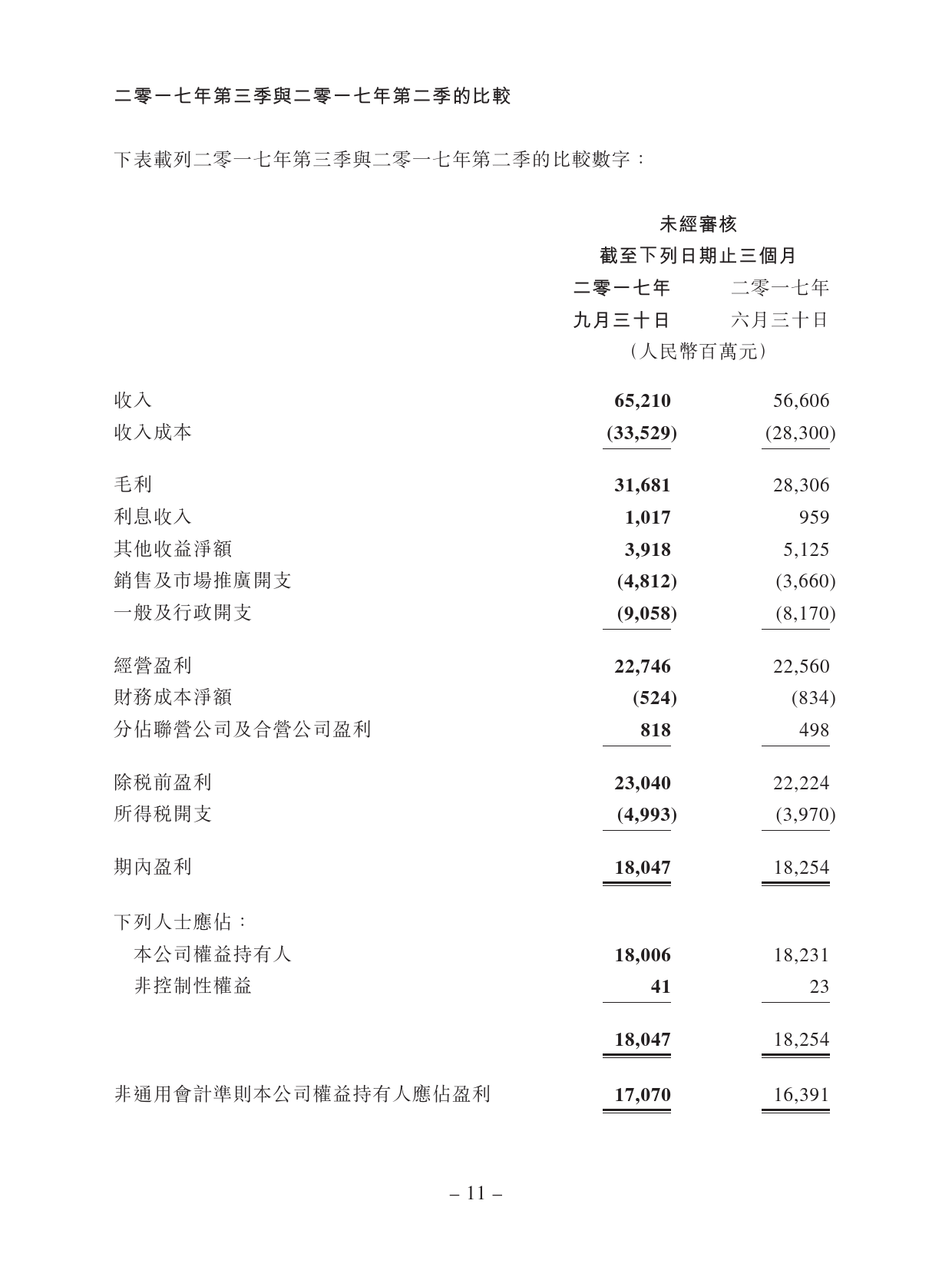 网络广告业务2017年第三季的收入同比增长48%至人民币110.42亿元。媒体广告收入同比增长29%至人民币41.22亿元,主要是由于腾讯视频等移动端媒体平台的收入增长,但部分被新闻服务去年奥运会带来的广告收入高基数效应的不利影响所抵销。社交及其他广告收入同比增长63%至人民币69.20亿元,主要反映来自微信(主要是微信朋友圈及微信公众号)及其他移动端应用的广告收入增长。我们的收入录得61%的同比增长,主要受智能手机游戏、PC端游、支付相关服务、数字内容订购及销售以及网络广告所推动。经营盈利同比增长57%。本公司权益持有人应占盈利同比增长69%。非通用会计准则本公司权益持有人应占盈利同比增长45%。自由现金流同比增长94%。