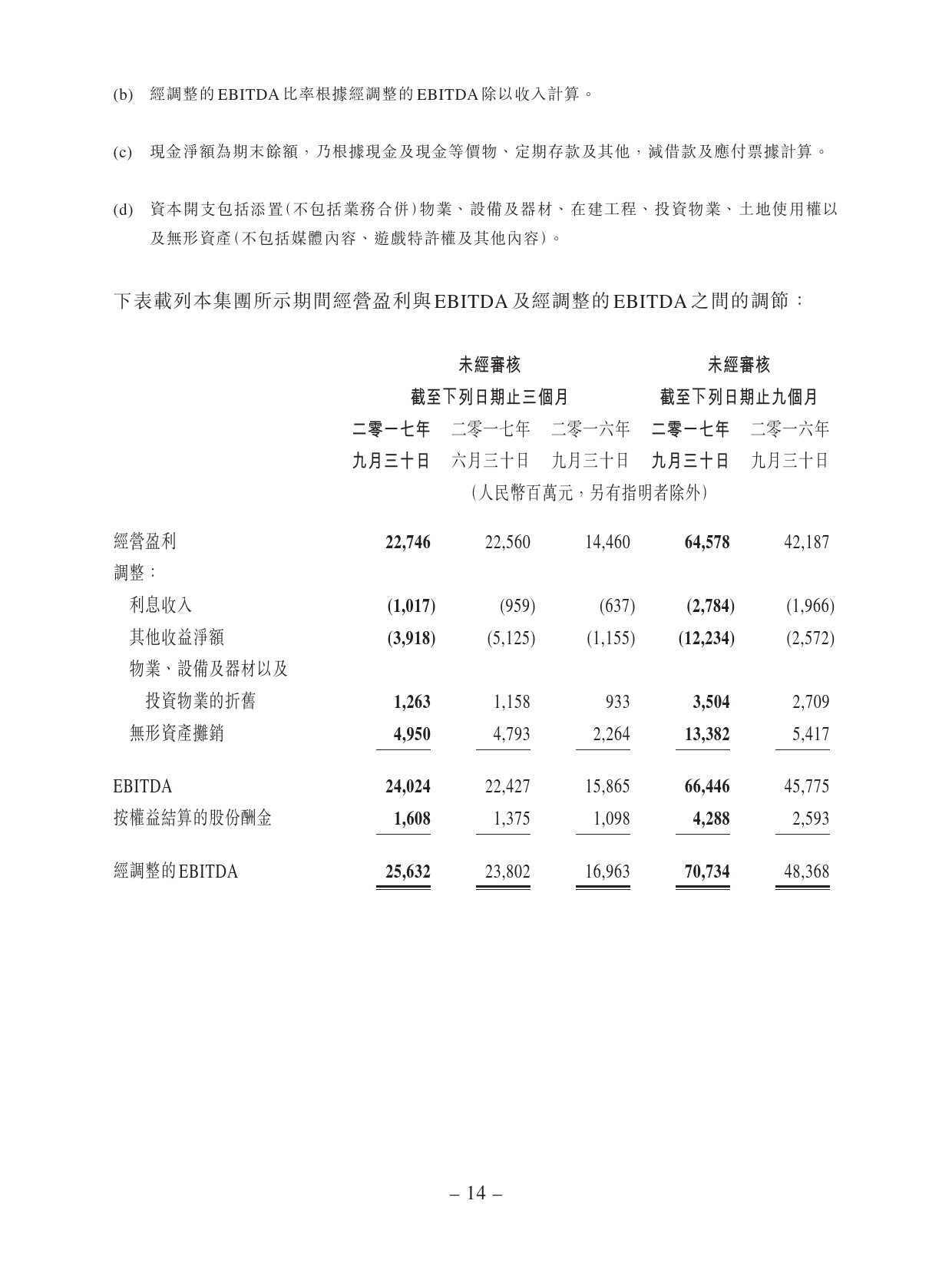 EBITDA 为人民币240.24亿元,较去年同期上升51%。经调整的EBITDA为人民币256.32亿元,较去年同期上升51%。