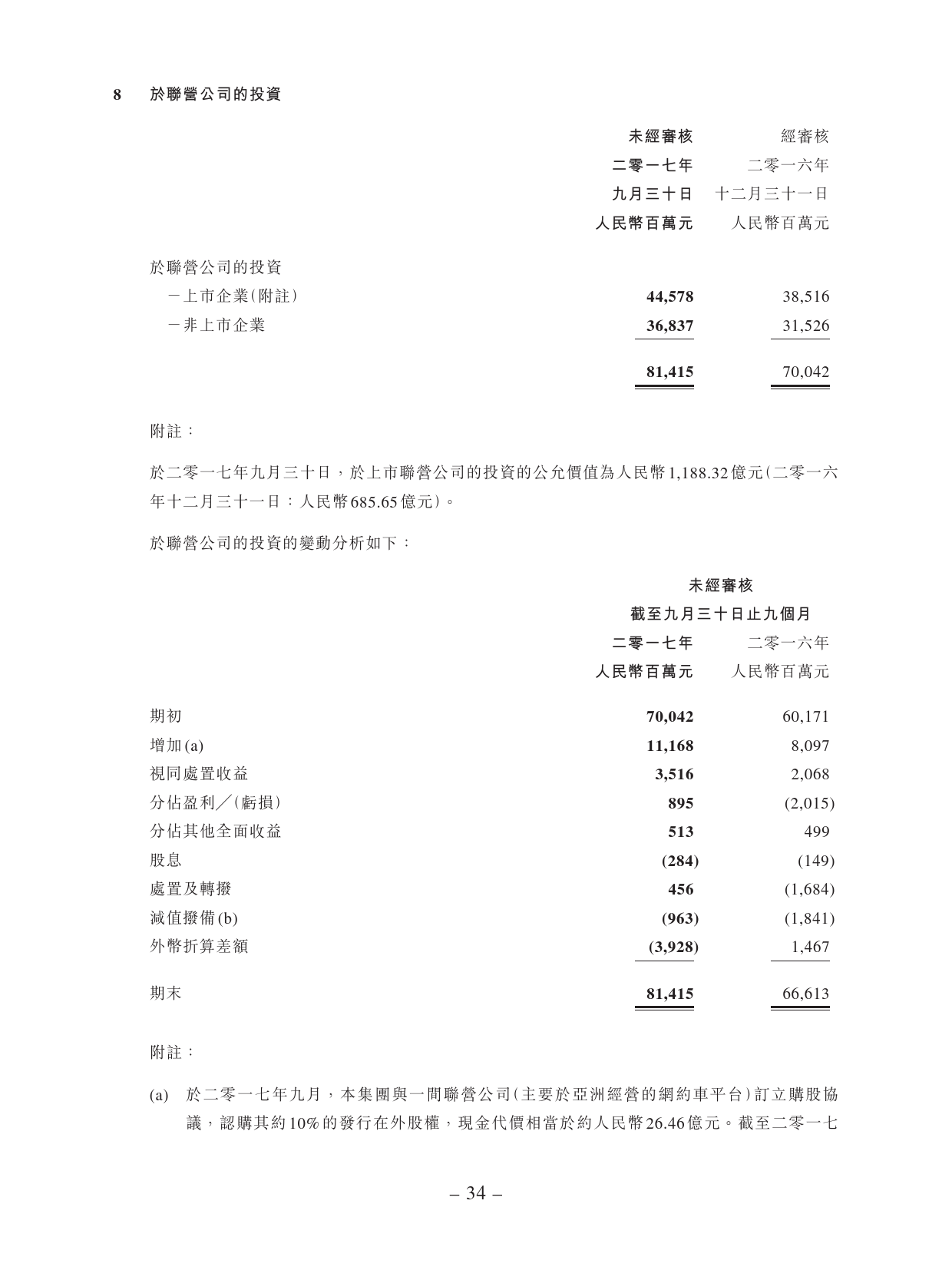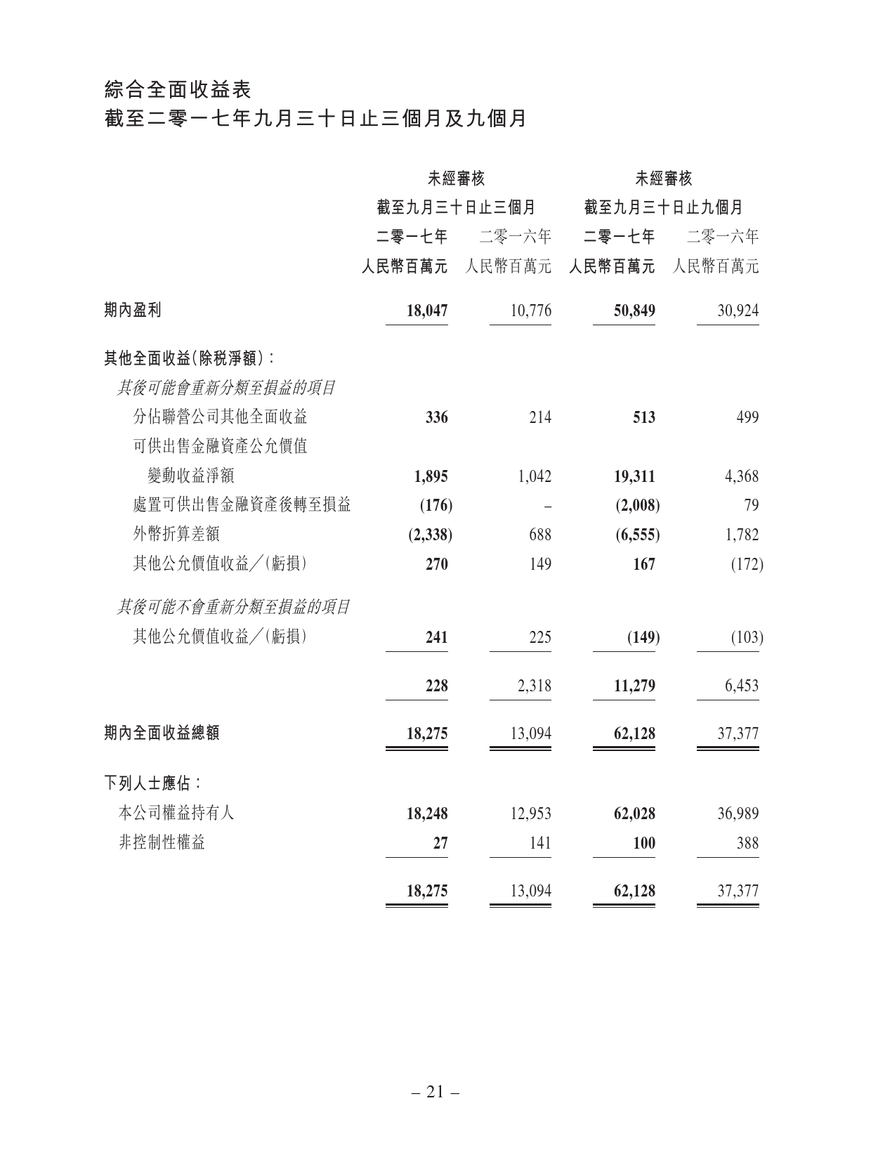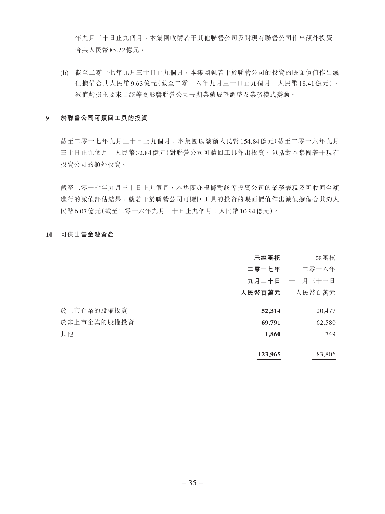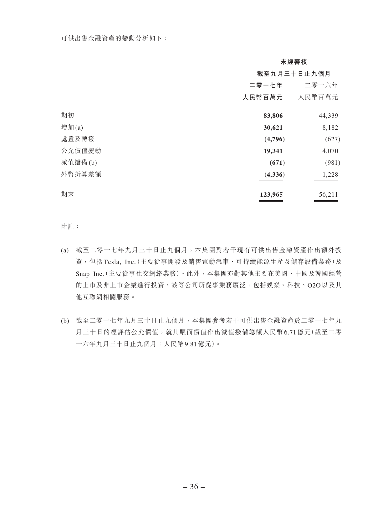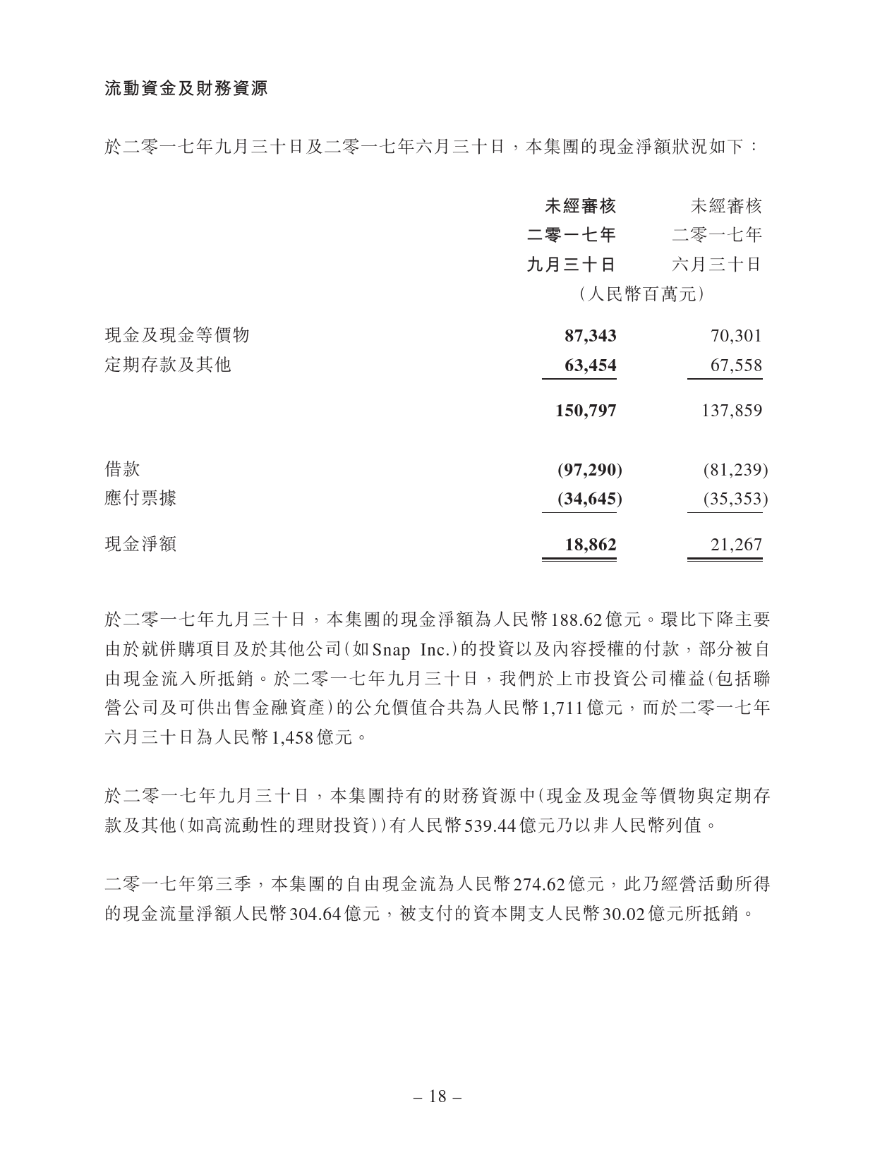 于2017年9月30日,本公司的现金净额为人民币188.62亿元。于2017年9月30日,我们于上市投资公司权益(包括联营公司以及可供出售金融资产)的公允价值合共为人民币1,711亿元。