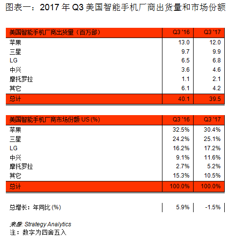 Strategy Analytics近期发布的研究报告指出,2017年Q3美国智能手机出货量年同比下跌2%为3950万部。摩托罗拉以5%的市场份额表现优异,其出货量比去年几乎翻倍。