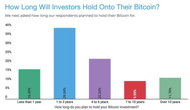 大约40%的投资者表示,他们会持有比特币1-3年,超过五分之一的持有者打算继续投资4-6年。