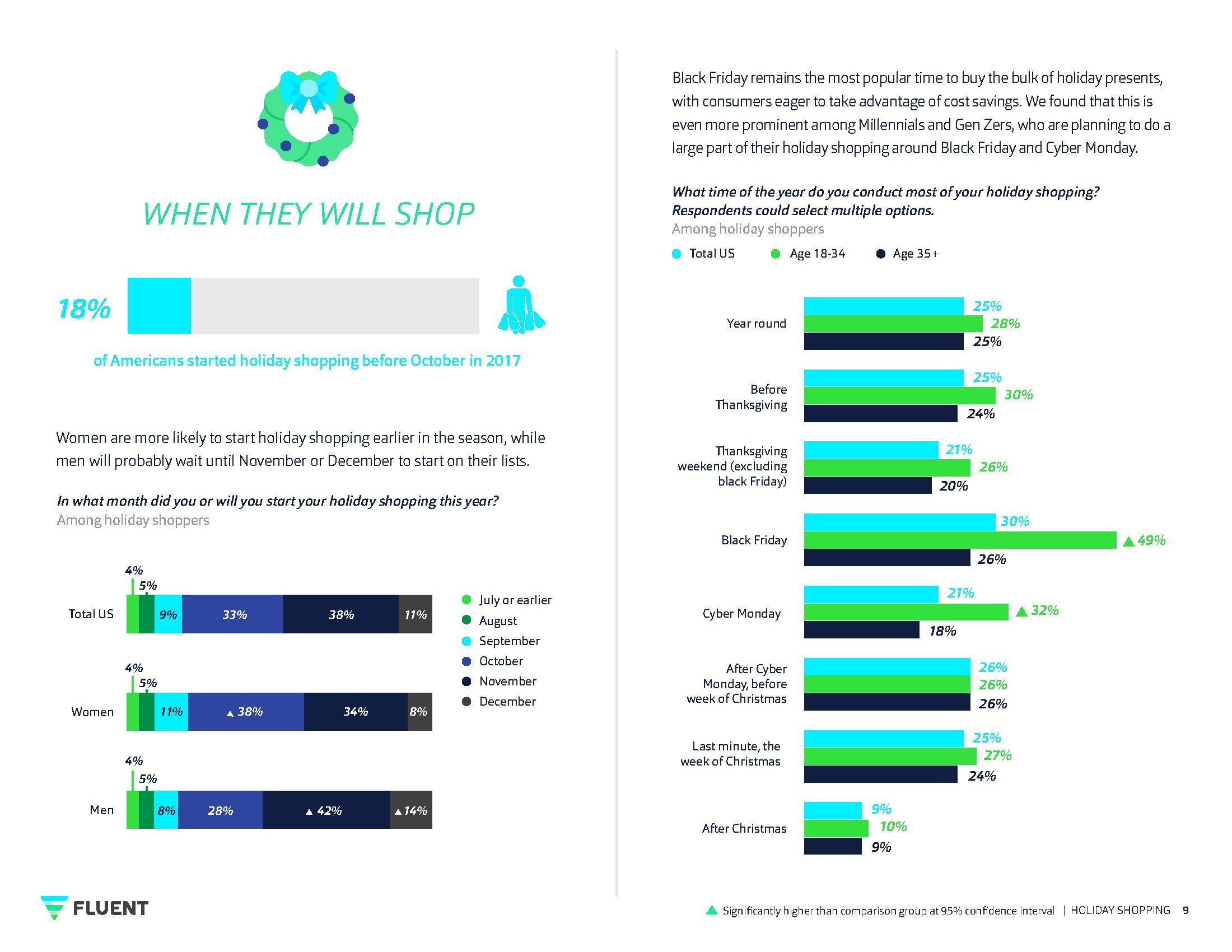 购物时间、地点和方式取决于消费者是谁。女性更早开始假日采购,而且更喜欢在实体店购物。男性消费者更可能等到最后一秒才开始假日采购。老年和年轻消费者的采购习惯也不同。千禧一代和Z世代更可能在黑色星期五和白色星期日采购。