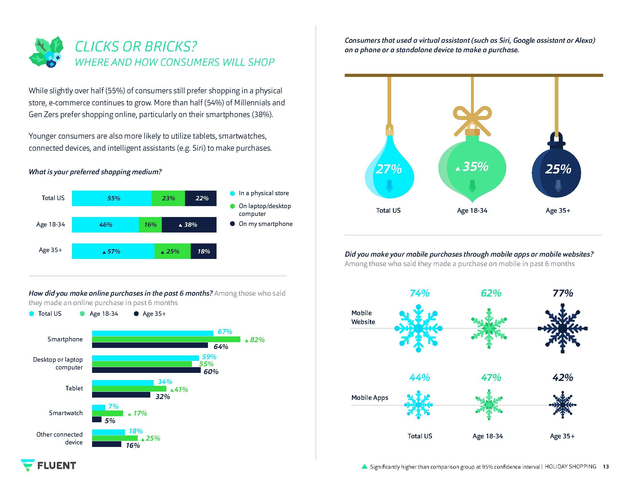 移动将成为今年假日采购的重头戏。年轻消费者更可能使用移动设备计划假日购物,82%的年轻消费者在过去6个月在智能手机上购物,38%更喜欢移动购物。通过智能助手购物也在增长,超过1/3的年轻美国消费者在过去6个月曾使用过智能助手购物(35%)。