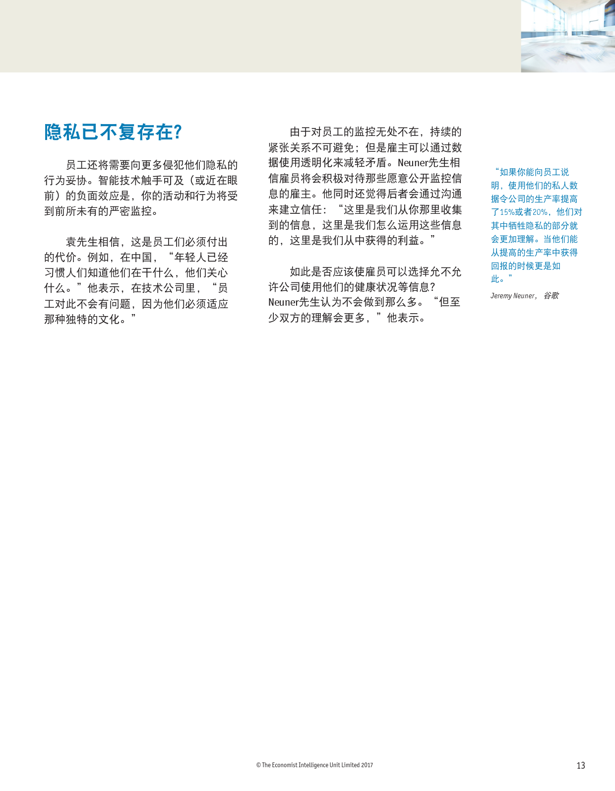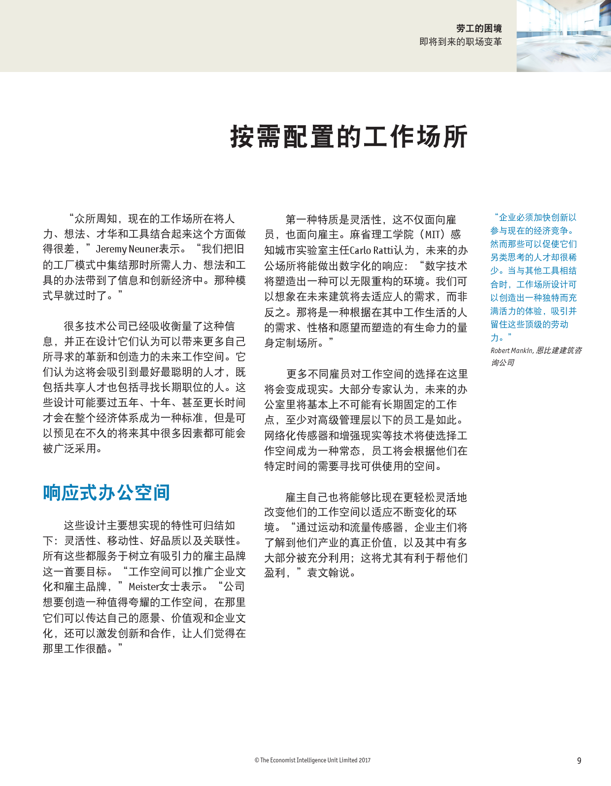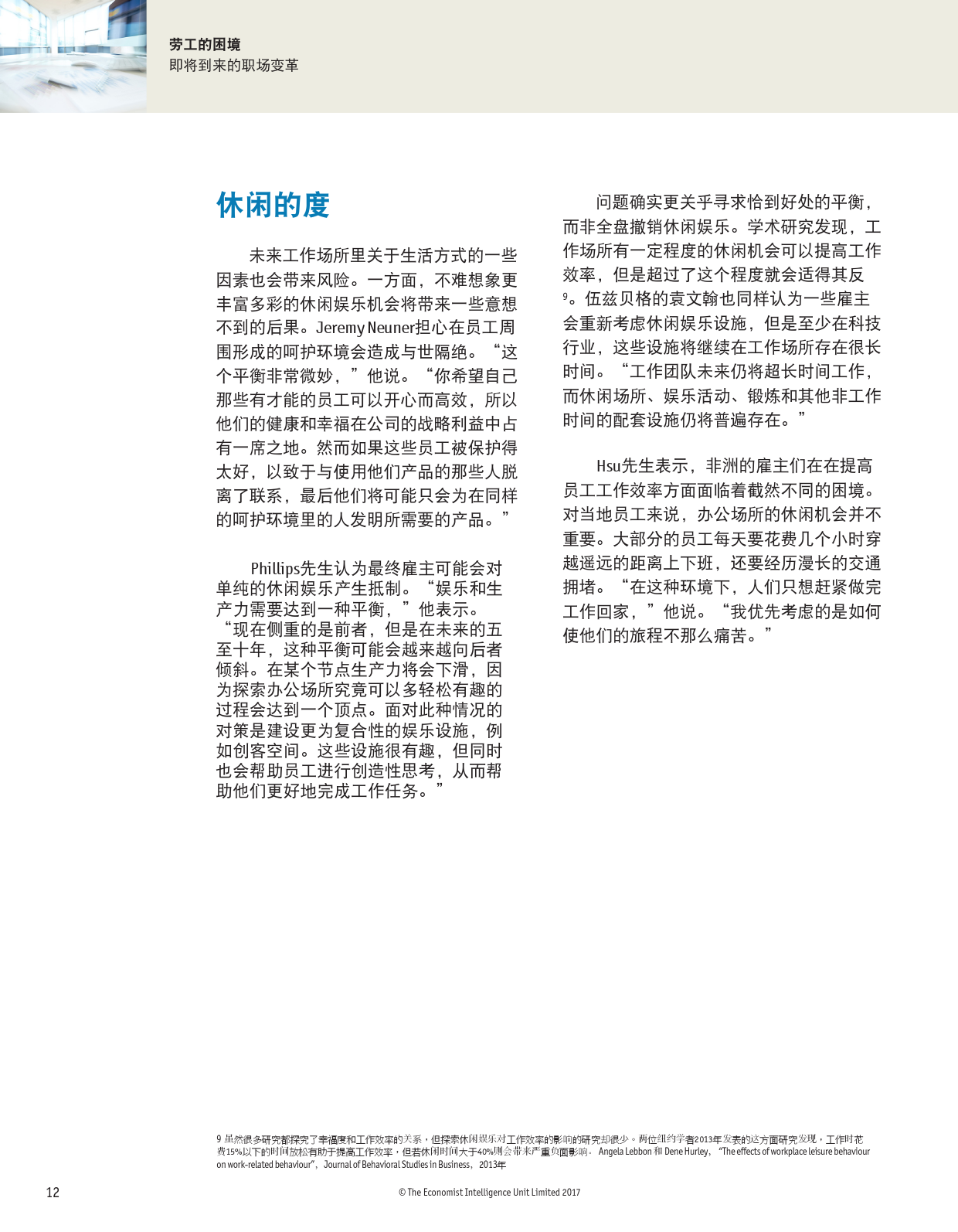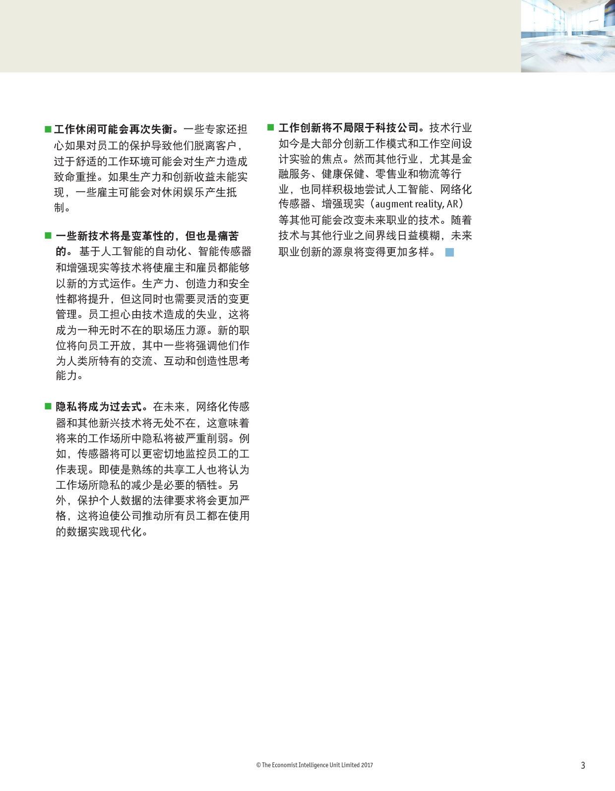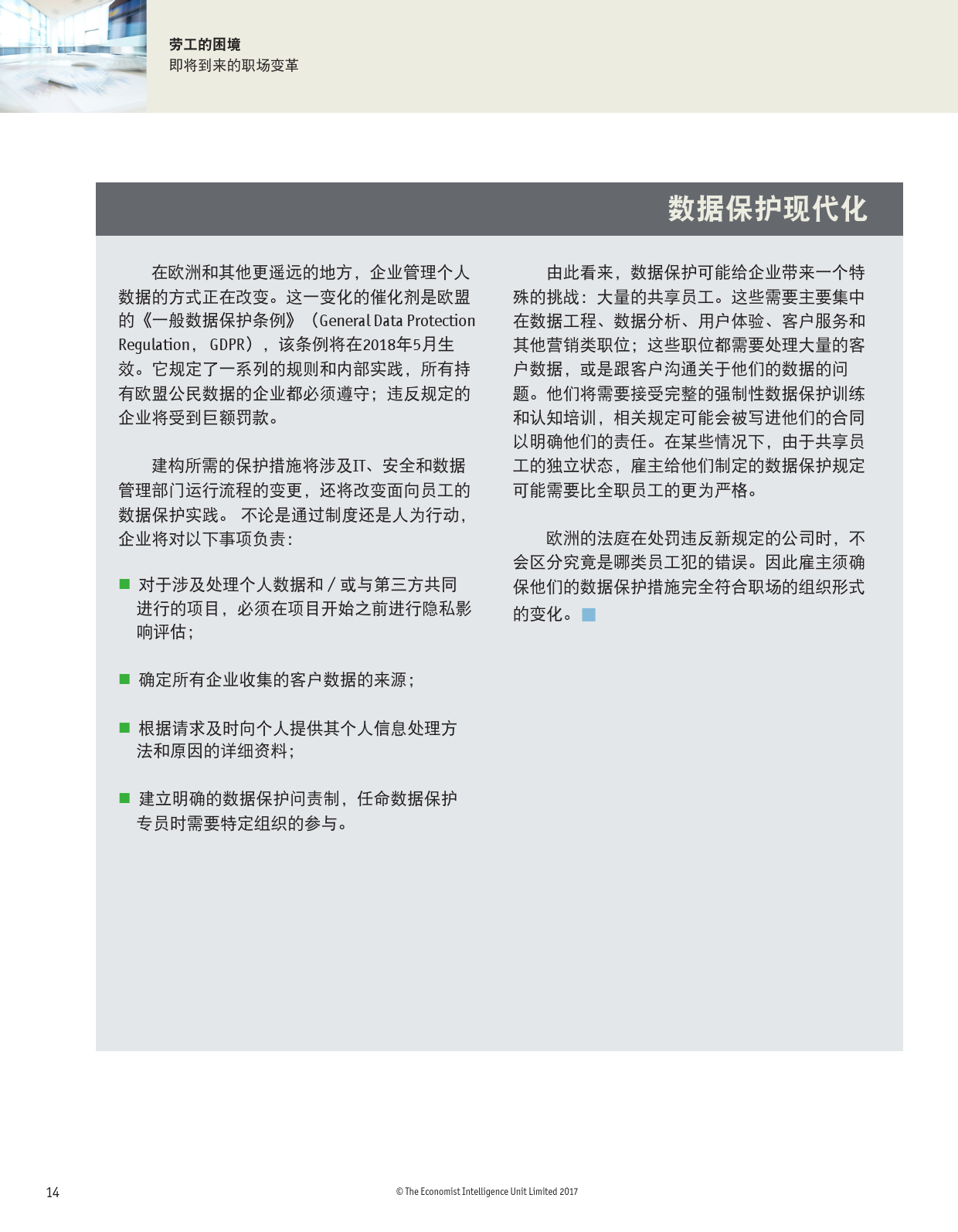 上述《劳工的困境:即将到来的职场变革》报告认为,新兴技术将使雇主与雇员间关系以全新方式运作,生产力、创造力和安全性都将提升。但与此同时,技术升级带来的失业风险将成为员工无所不在的压力源,雇主需更灵活地变更管理方式。