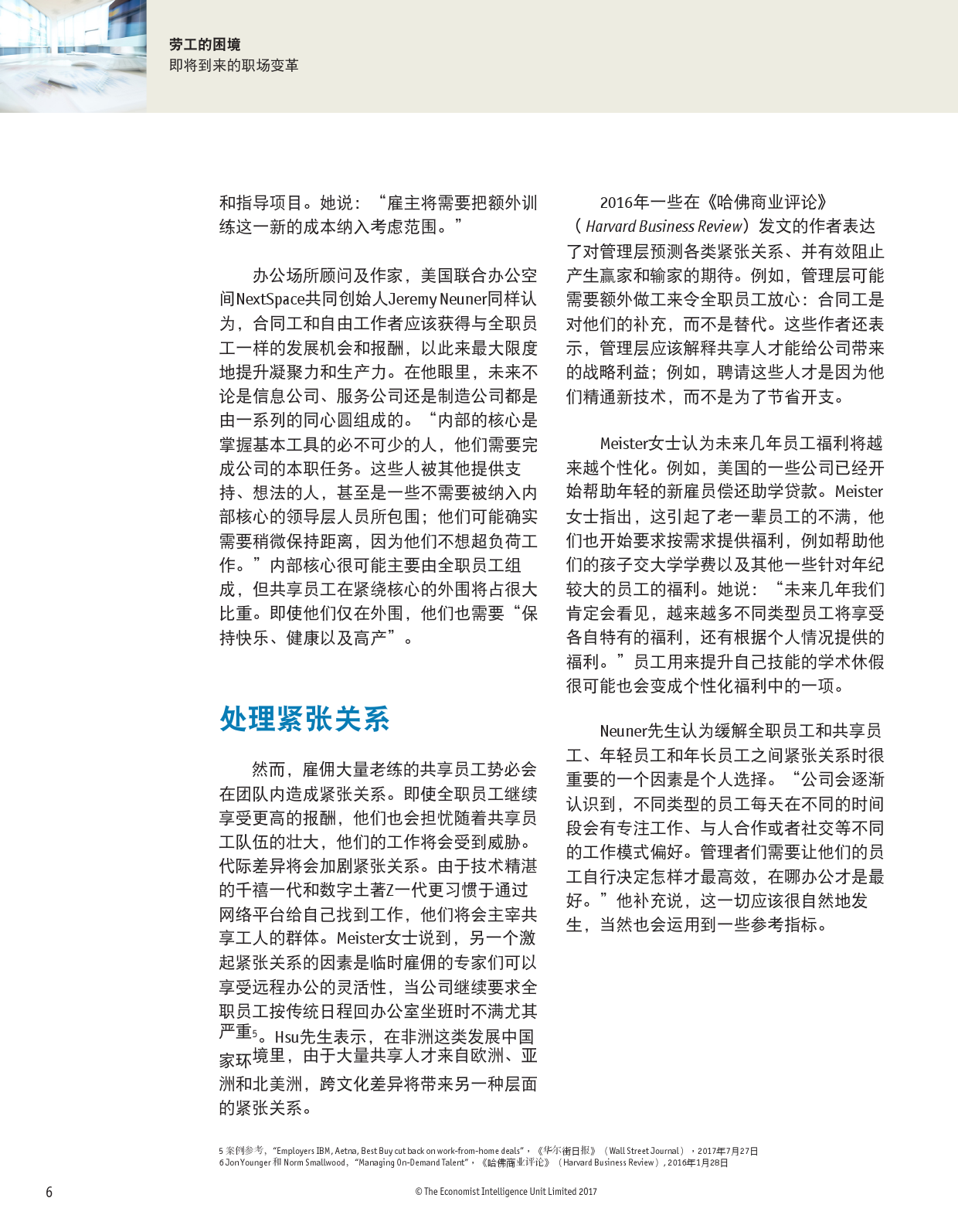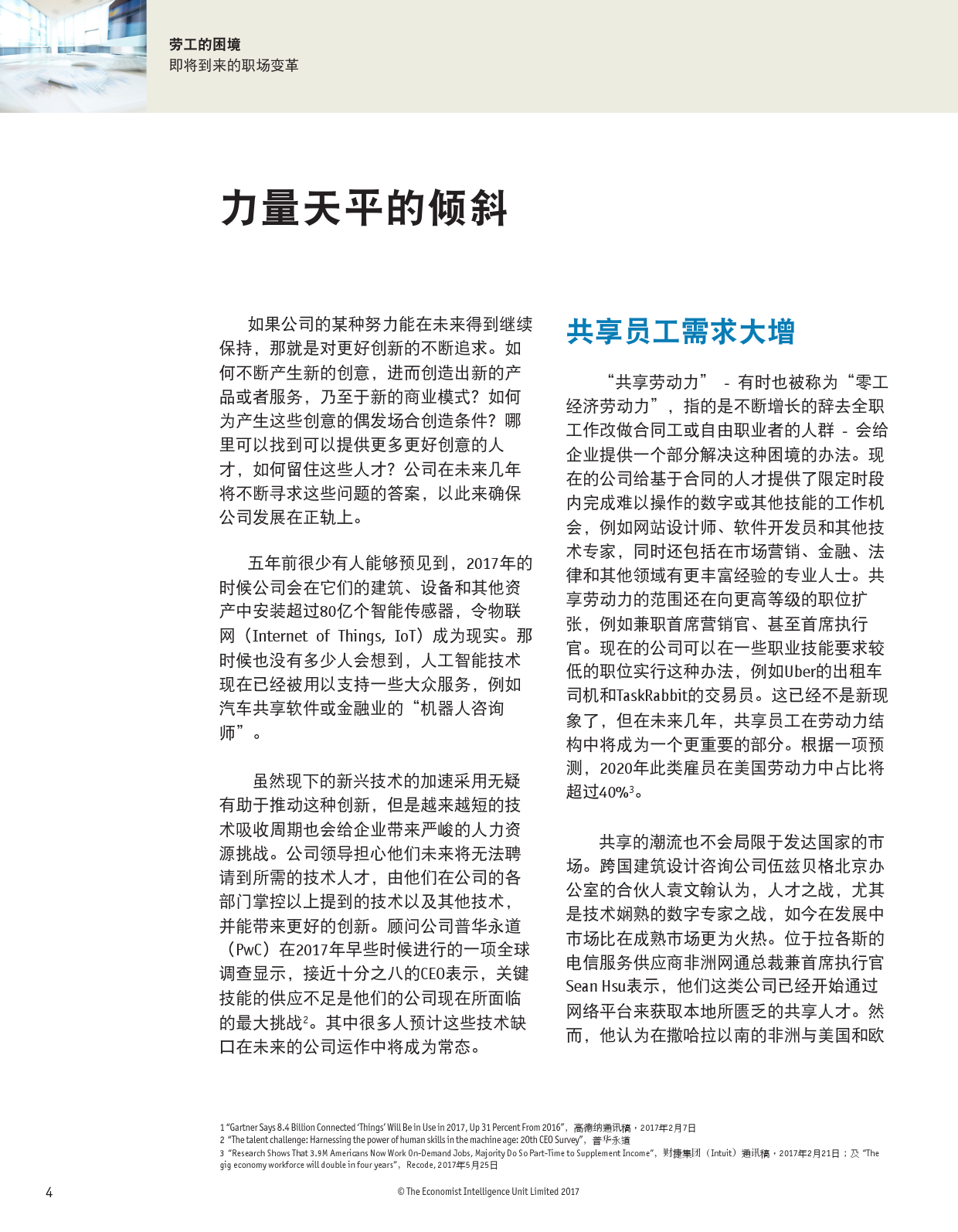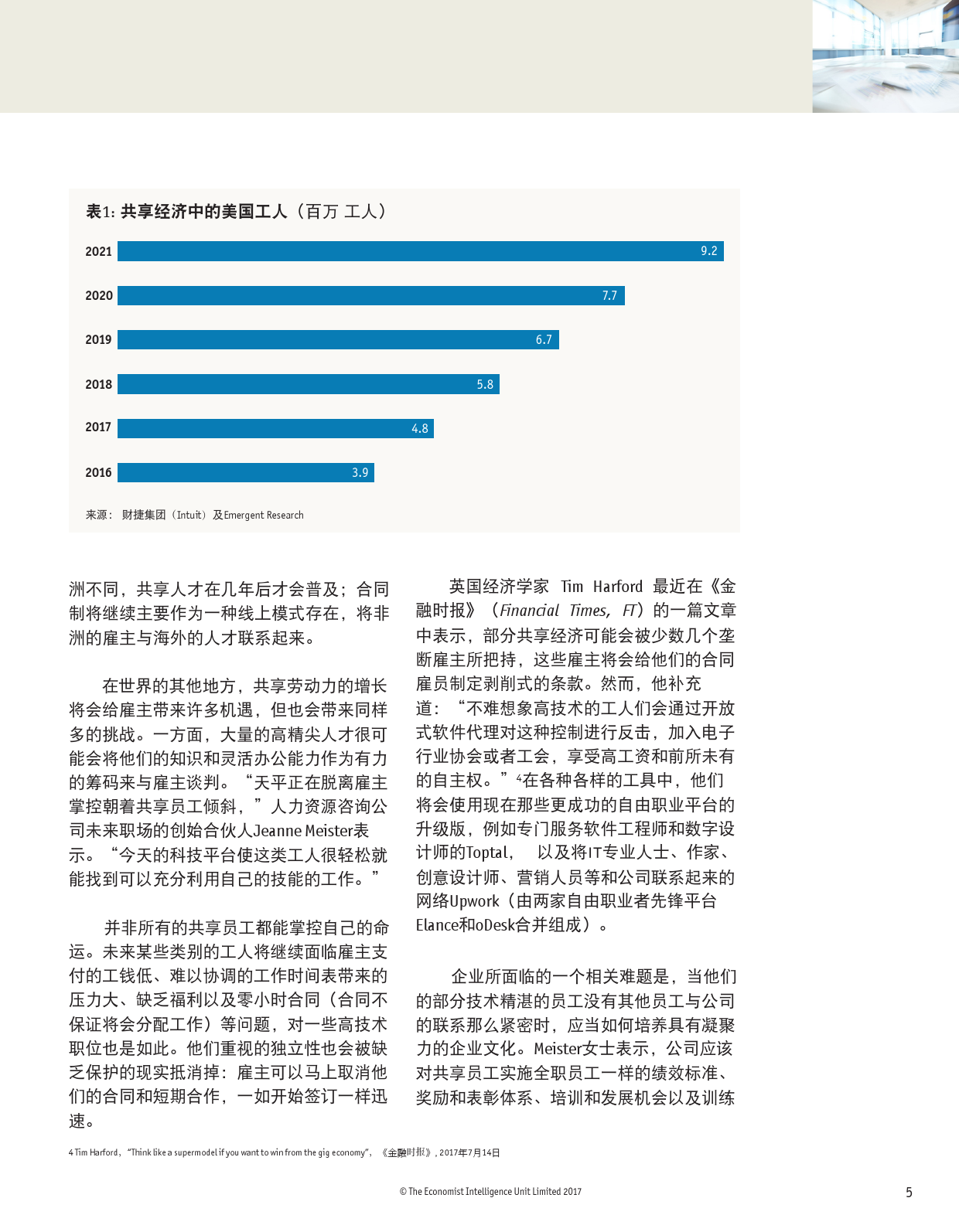 除先进技术外,共享劳动力等新兴职场形态也对员工和企业带来复杂影响。所谓共享劳动力,是指辞去全职工作改做合同工或自由职业者的人群。美国财捷集团预计,到2020年,共享劳动力将占到美国劳动力逾四成。