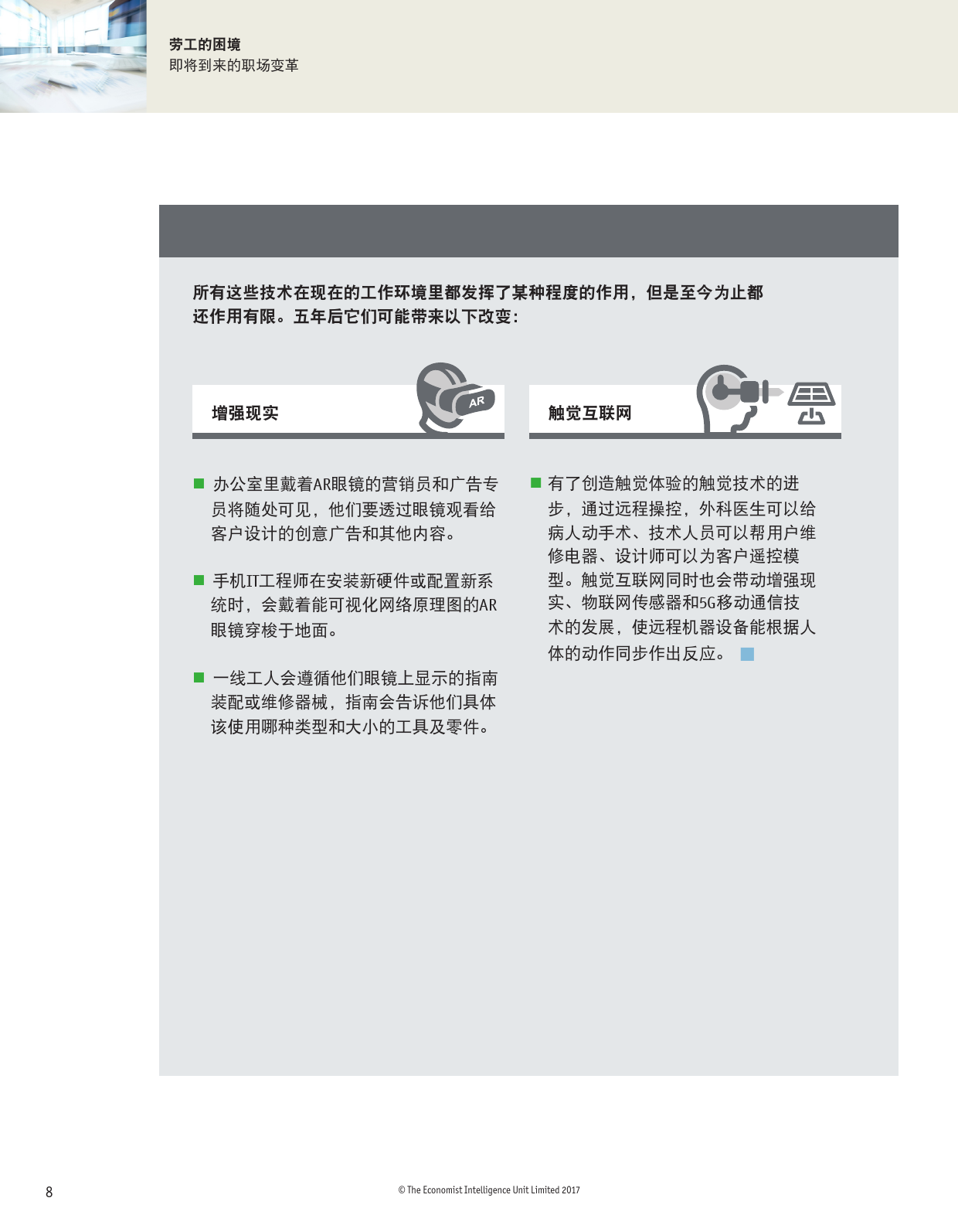 当前,技术创新正改变人类生活和工作方式。人工智能、网络化传感器、增强现实(AR)等技术被认为将在未来十年大幅提升工作效率。